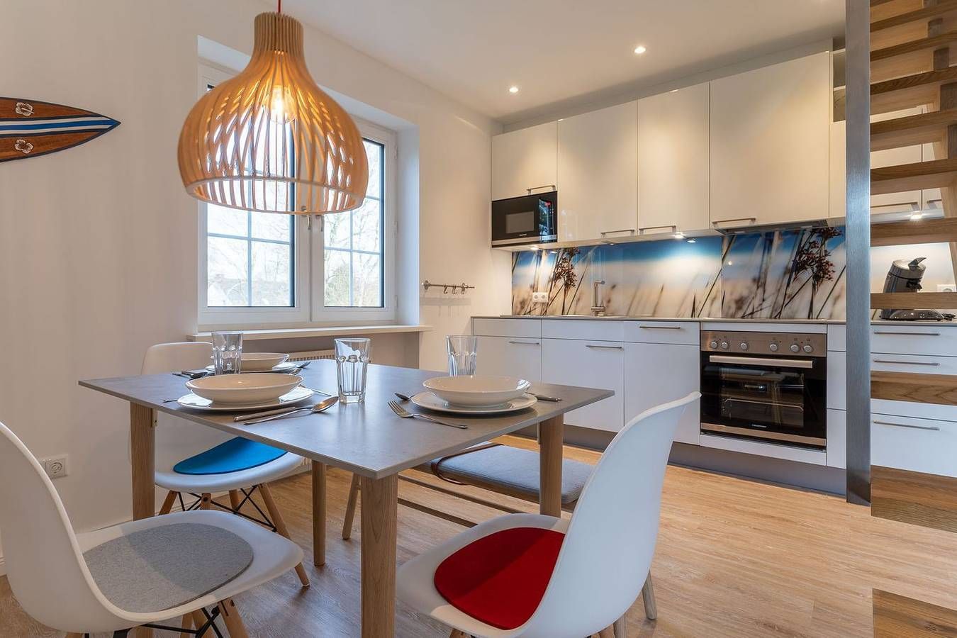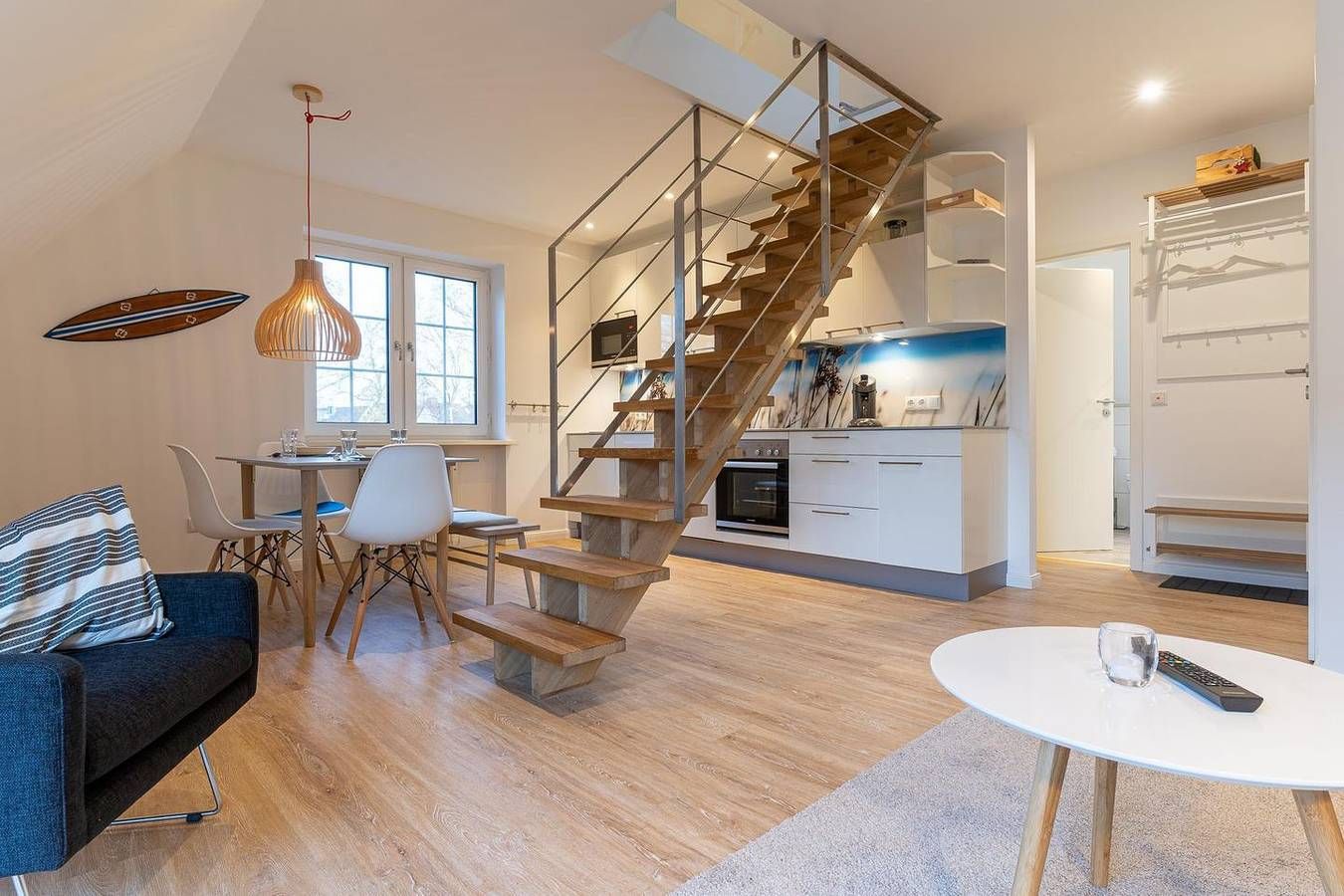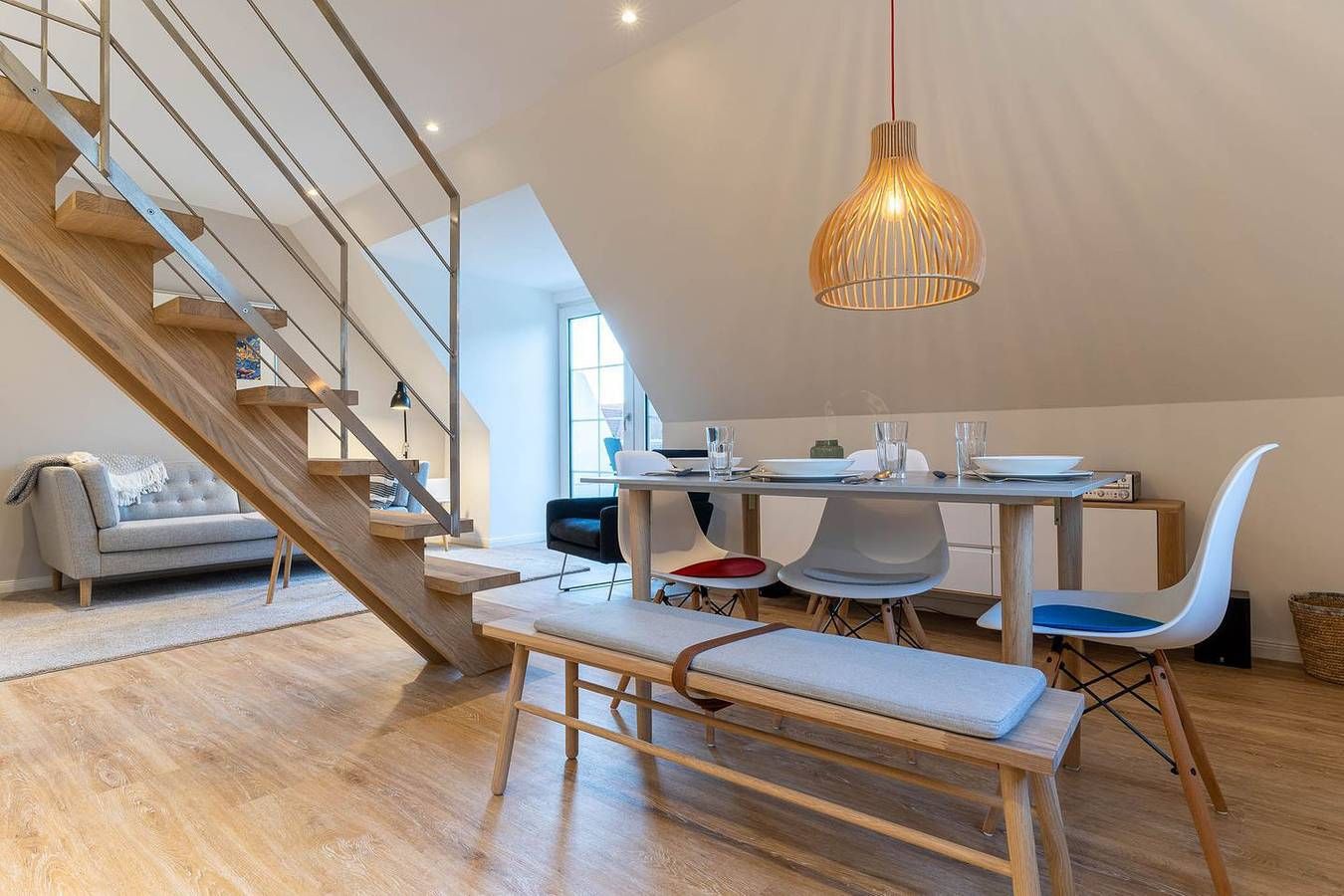 Die Ferienwohnung "Leanda" ist eine schöne, hochwertig eingerichtete Wohnung im 1. Obergeschoss im Ortsteil Bad. Das Badzentrum mit der Kurpromenade, Einkaufsmöglichkeiten und Cafés/Restaurants erreichen Sie durch den Kurwald in etwa 15 Gehminuten. Die ca. 65 qm große Wohnung erstreckt sich über zwei Etagen. Im unteren Bereich befindet sich das moderne, gemütliche Wohnzimmer mit einem schicken Essbereich, Flachbildfernseher und einer voll ausgestatteten Küchenzeile. Ein Balkon mit Tisch und Stühlen lädt zum Verweilen ein. Das Schlafzimmer verfügt über ein Boxspringbett und einen großzügigen Kleiderschrank. Das Duschbad ist mit Fußbodenheizung ausgestattet. Eine offene Treppe im Wohnbereich führt in das Dachgeschoss mit zwei Einzelbetten, Kleiderschrank und Flachbildfernseher. Zur Ausstattung gehören unter anderem Insektengitter in allen Räumen, ein CD-Player, Fahrradabstellmöglichkeiten und ein PKW-Stellplatz am Haus. Die Ferienwohnung ist eine Nichtraucherwohnung, und Haustiere sind nicht erlaubt.