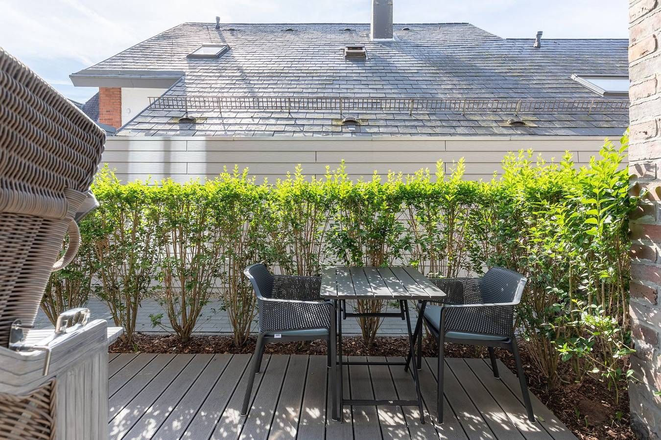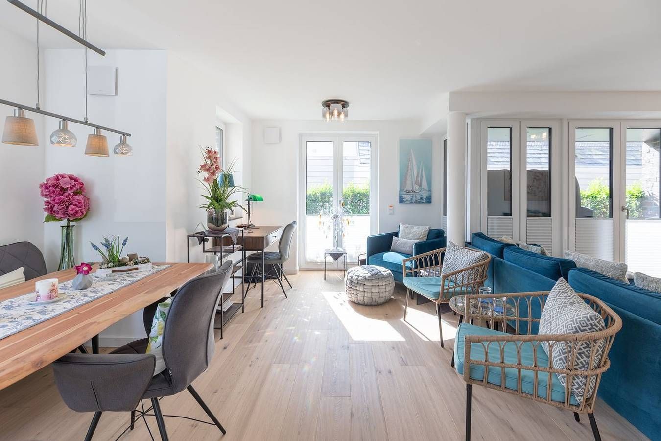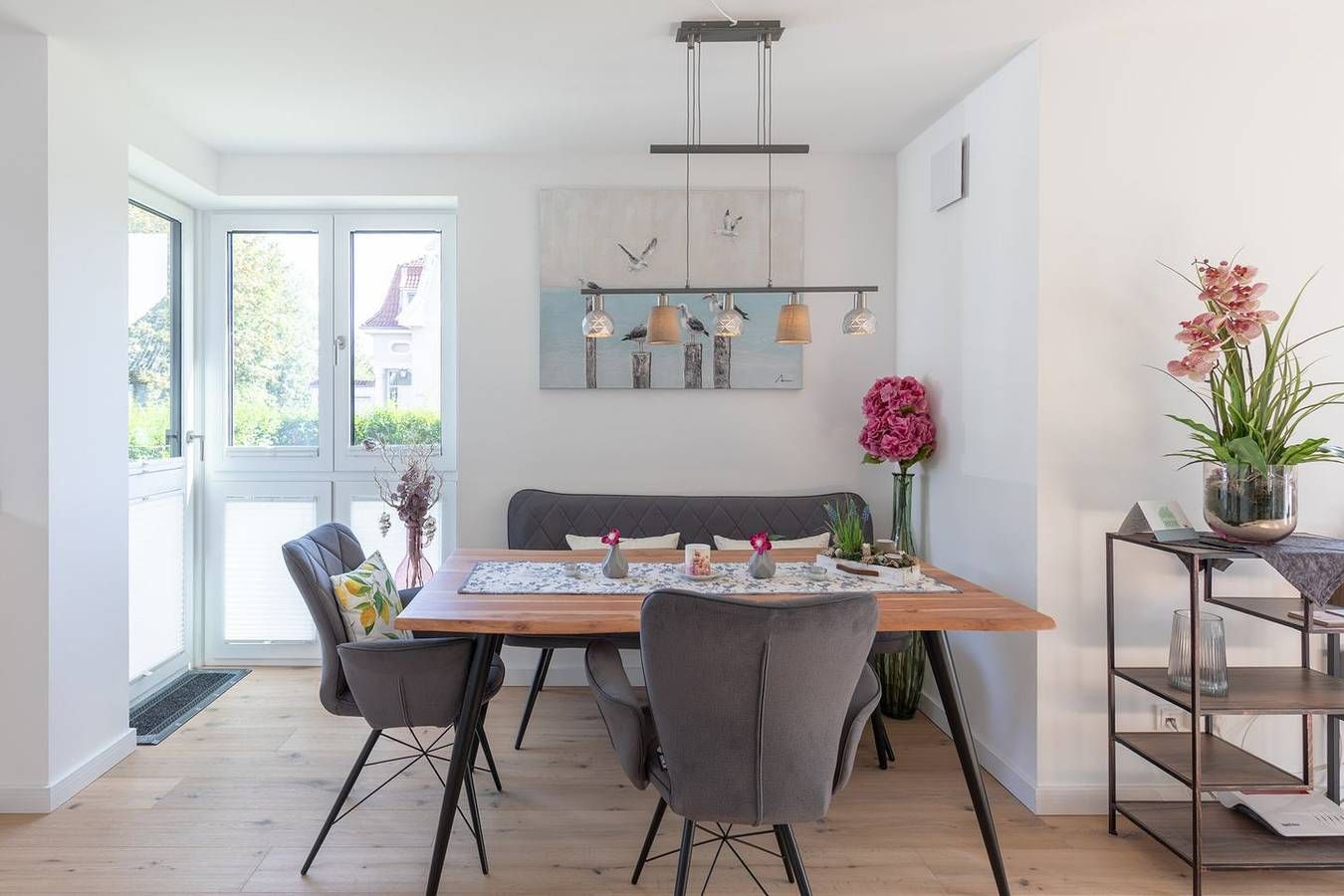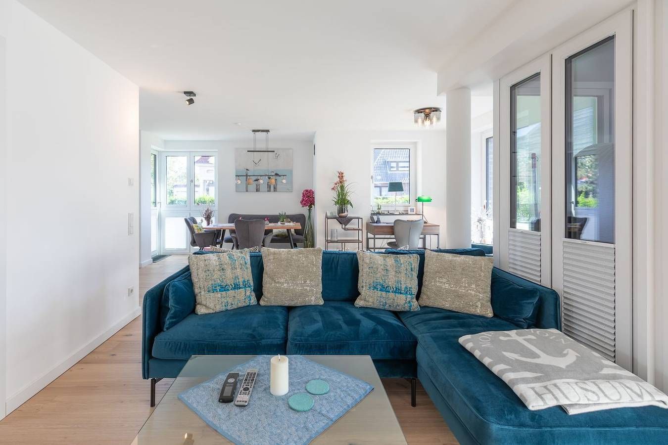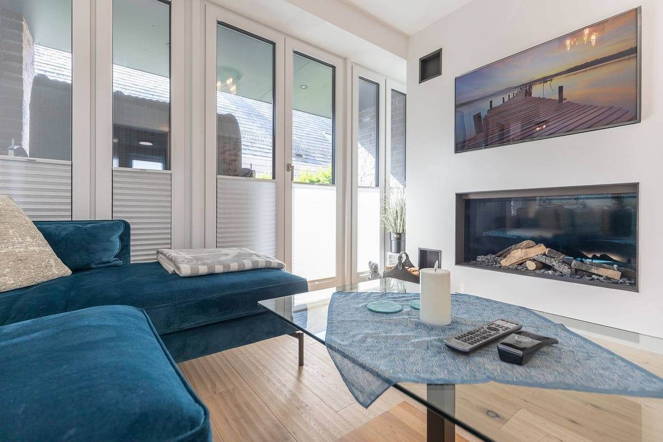 Wohnen auf Zeit: Planen Sie eine längere Auszeit in Husum? Dann haben wir mit der Wohnung Meerzeit einen modernen und gemütlichen Rückzugsort. Die Lage: Zentral aber ruhig liegt dieses schöne ebenerdige Appartement im Erdgeschoss eines Mehrfamilienhauses (5 Wohneinheiten) in der Husumer Innenstadt. Der schöne und idyllische Hafen liegt nur einen Steinwurf entfernt, ebenso Einkaufsmöglichkeiten, Cafés und Restaurants – alles fußläufig erreichbar. Die Ausstattung Die Wohnung lädt Sie ein zu einer unvergesslichen Nordsee-Auszeit: gemütliches Wohnzimmer mit Sofa, einem Gaskamin für behagliche Wärme, Smart-TV. Ein heller Essbereich, ein Schlafzimmer mit einem hochwertigen Doppelbett, eine komfortable und sehr gut ausgestattete Einbauküche mit Induktionskochfeld, Backofen, einem Soda-Stream, einer Geschirrspülmaschine, Kühlschrank, Gefrierfach und Kaffeemaschine (Filtergröße 4). Das moderne Badezimmer ist mit einer ebenerdigen Dusche, WC, Waschbecken und vollautomatischem Waschtrockner eingerichtet. Ein separates Gäste-WC rundet das Bild ab. Alle Fenster sind mit Plissees zu verdunkeln. Auf der geschützten, überdachten Terrasse können Sie relaxen und den Abend ausklingen lassen. Ein Strandkorb und ein Gasgrill sorgen für Ihren Komfort. Die Besonderheiten In unserer Nichtraucher-Ferienwohnung stellen wir Ihnen gerne W-LAN kostenfrei zur Verfügung. Zur Wohnung gehören ein Pkw-Carportplatz und auch ein Fahrradkeller. Eine Erstausstattung an Bettwäsche und Handtüchern wird bei dieser Unterkunft obligatorisch hinzugebucht und ist bereits im Endpreis enthalten. Zusätzliche Wäschepakete können in den optionalen Leistungen hinzugebucht werden. Diese Wohnung ist ab einem Mindestaufenthalt von einem Monat buchbar. Eine 14-tägige Zwischenreinigung wird obligatorisch hinzugebucht werden. Es wird eine Kaution in Höhe von 500 € erhoben.
