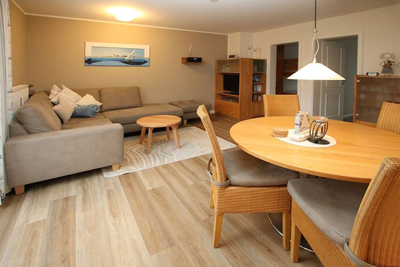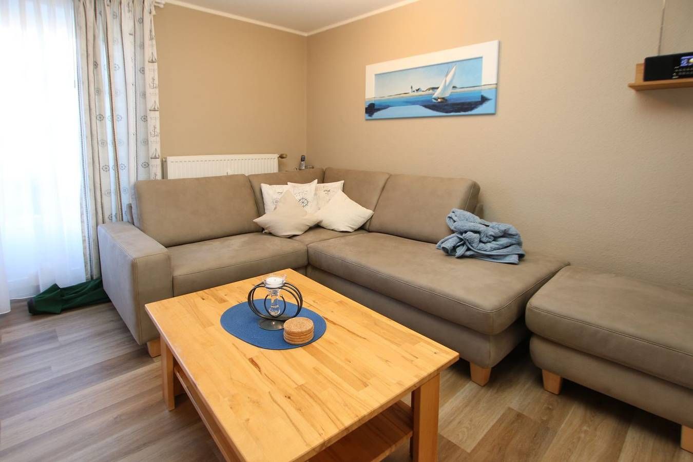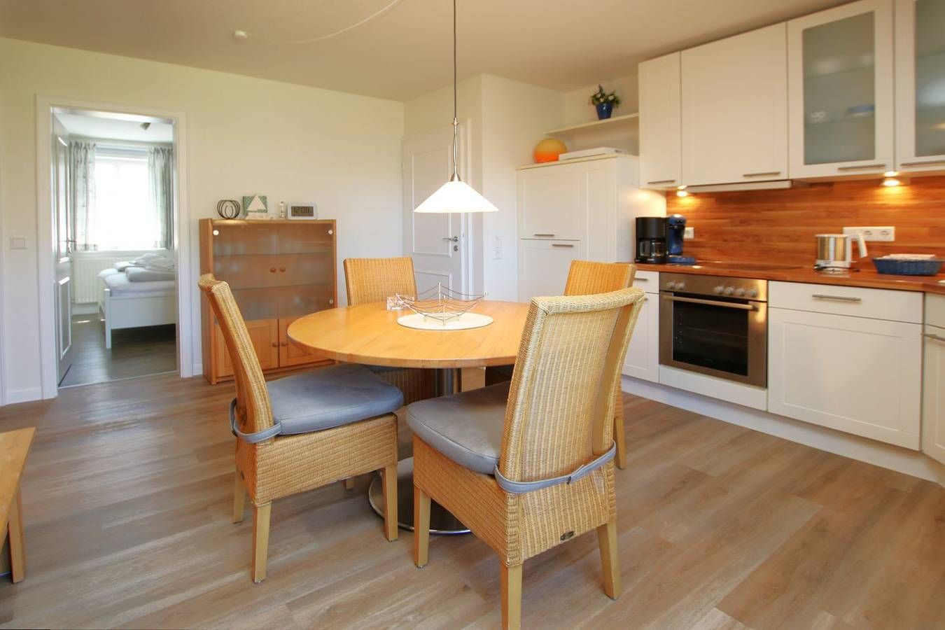 Ferienwohnung in WYK AUF FÖHR; OT BOLDIXUM: KIEK UT 9, Wohnung Nr. 2, REETDACHHAUS 3-Zimmer- Nichtraucherwohnung im Erdgeschoß, ca. 50 qm mit Süd/Westterrasse mit Tisch, 4 Hochlehner-Gartenstühle und 2 Hocker. Sehr geschmackvoll eingerichtete Erdgeschosswohnung. WOHNZIMMER mit Ledercouch über Eck, Esstisch, 4 Stühle und moderne Küchenzeile. FLUR mit Garderobe und Abstellraum unter der Treppe. BAD mit Dusche, WC und Waschbecken. SCHLAFZIMMER mit Doppelbett ( 1,80x 2m) und Kleiderschrank, sowie LED-Leselicht dimmbar mit USB Ladebuchse und Ablage für Buch oder/und Brille. Im KINDERZIMMER ist ein Etagenbett mit jeweiliger Ablage für Buch oder/und Brille sowie dimmbarem LED Leselicht am Bett. und ein Kleiderschrank. Kinderbett und Hochstuhl auf Wunsch inklusive. Die Schlafzimmer und das Wohnzimmer haben Designbelag. Im KELLER stehen Waschmaschine und Trockner auf Münzbasis zur Verfügung. Fahrradständer und Spielecke für Kinder am Haus. Haustiere auf Anfrage und gegen Gebühr. LAGE: Ruhig und dörflich in Marschnähe. Bushaltestelle ist im Dorf. Zum Zentrum von Wyk, Strand, Kurmittelhaus und Wellenbad sind es ca. 20 - 30 Minuten Fußweg. Internetanschluss über WLAN.
