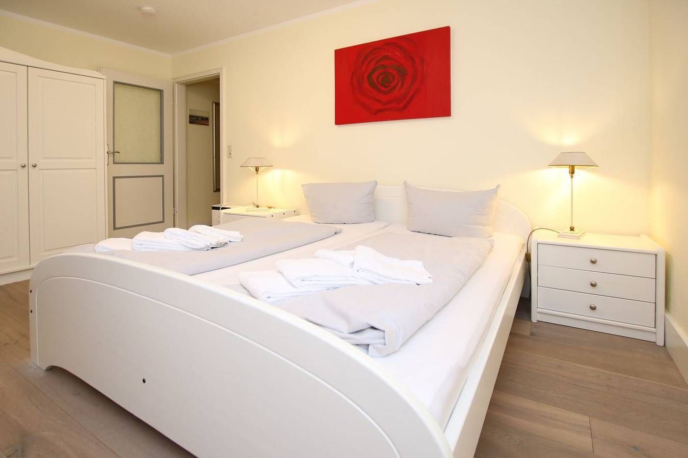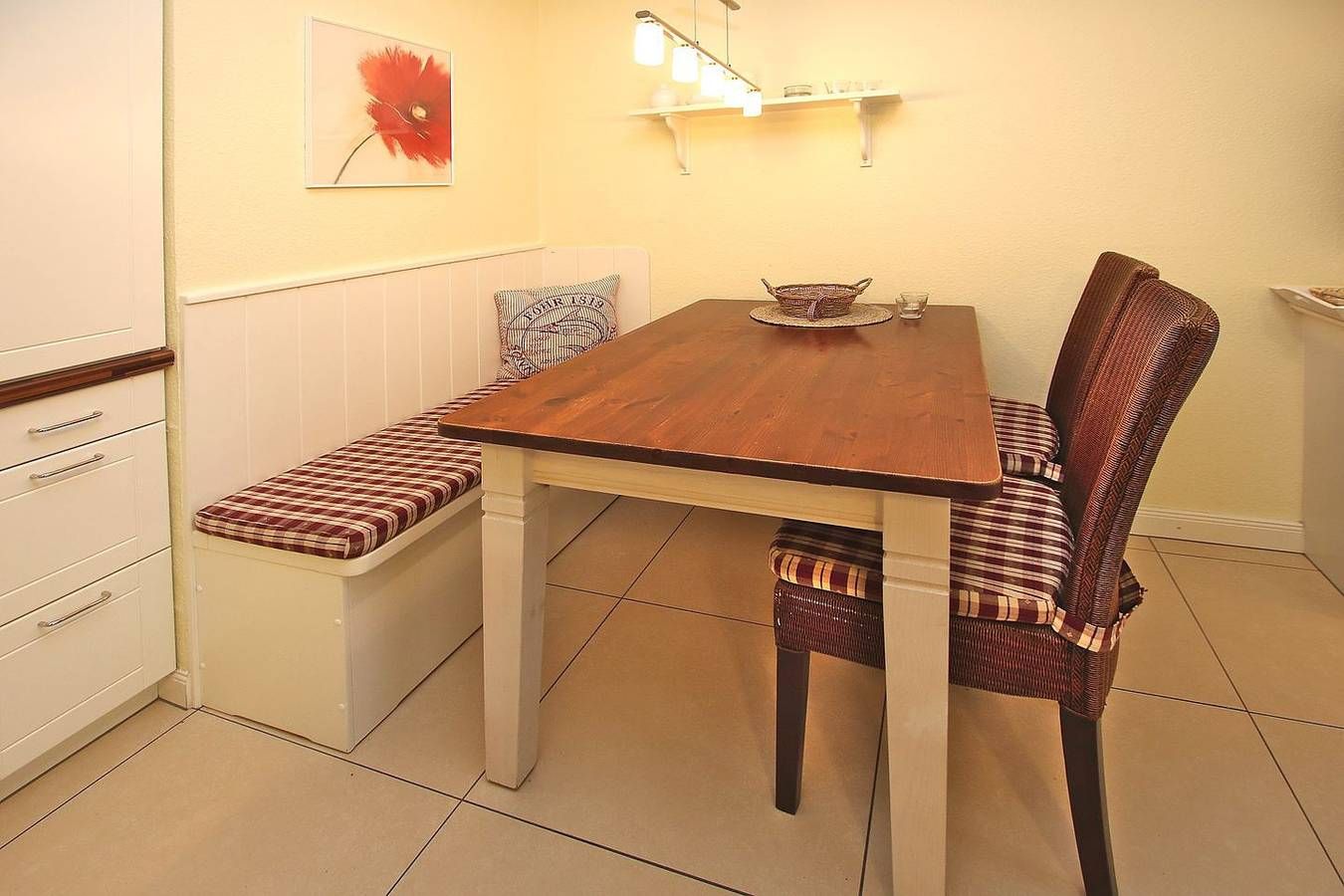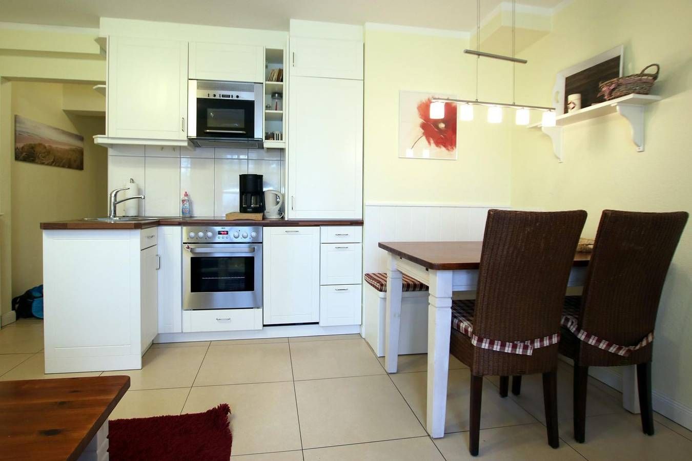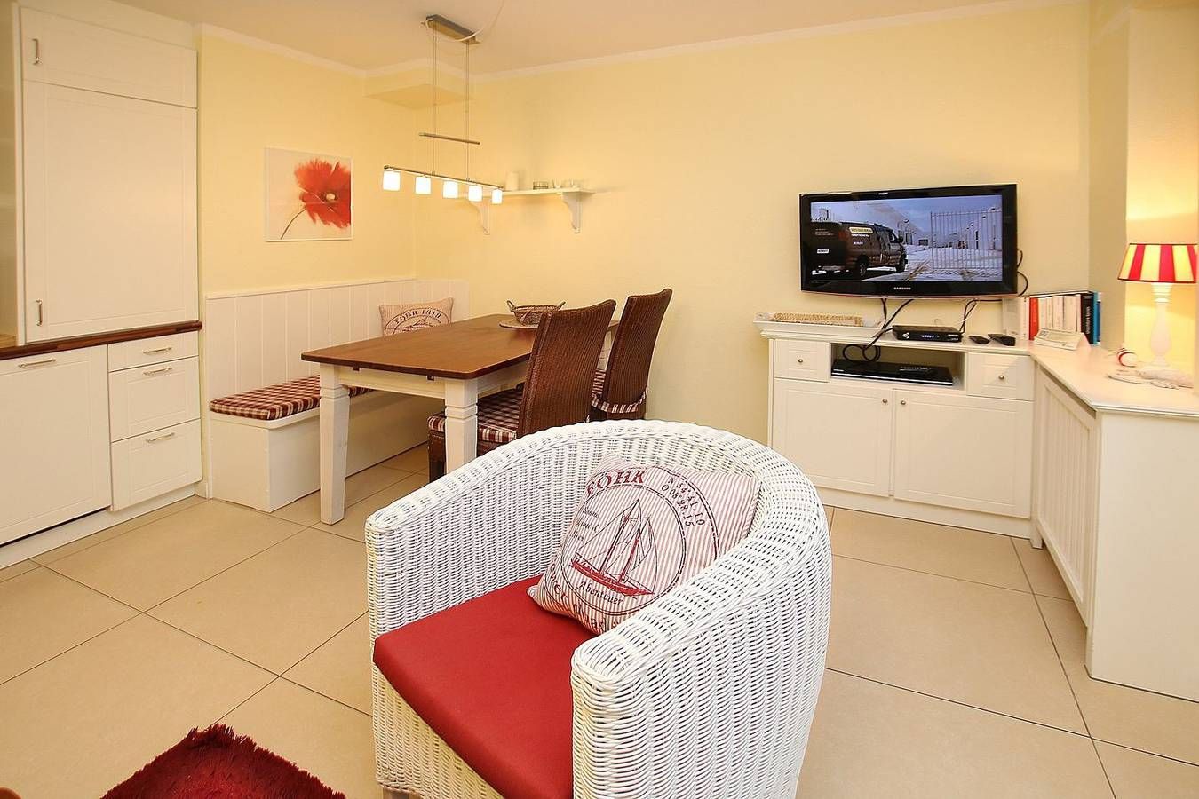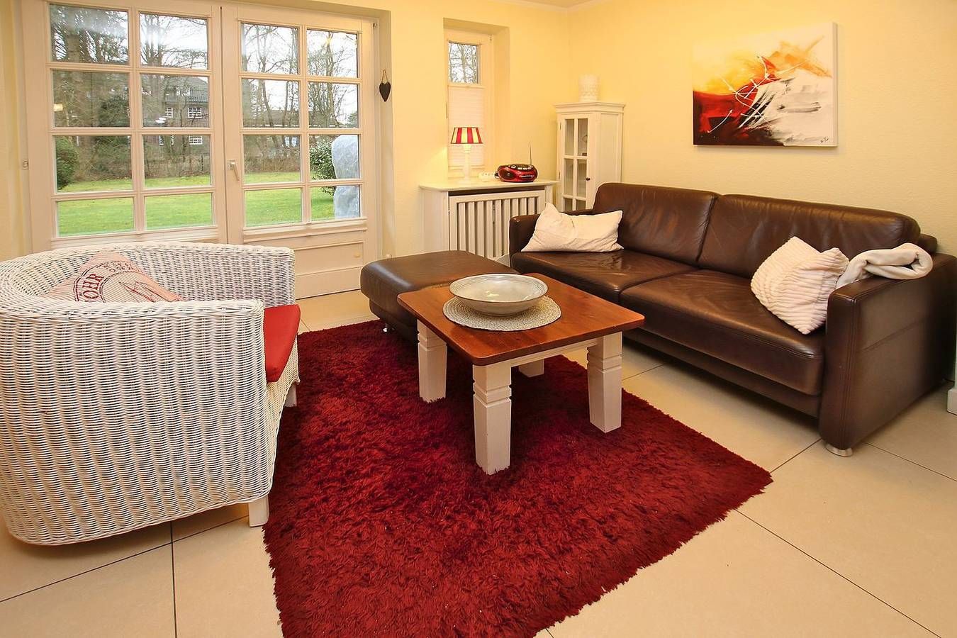 Willkommen in Wyk auf Föhr, Am Grünstreifen 33. Die Nichtraucher- Ferienwohnung "Kleines Nest" mit 3 Zimmern auf ca. 60 qm, erstreckt sich über das Erd- und Untergeschoss. Sie verfügt über eine einladende Südterrasse mit 4 Stühlen und einem Tisch. In der Strandkorbsaison steht hier ebenfalls ein toller Strandkorb für Sie. WOHNZIMMER: Esstisch mit 2 Stühlen und einer Sitzbank lädt zum gemeinsamen Essen ein. Von der 2er Ledercouch, nebst Hocker und einem Korbsessel schauen Sie frei auf das TV- Gerät. KÜCHENZEILE mit allem was man braucht. KLEINES KINDERZIMMER: Einzelbett (0,90 x 2m) und ausziehbares Tandembett, Kleiderschrank und SAT/TV. Im Untergeschoss stehen ein BAD: Dusche/ Waschbecken zur Verfügung. Das WC mit Waschbecken befindet sich im EG. Weiterhin gibt es im UG ein Schlafzimmer mit Doppelbett (1,80 x 2m), Kleiderschrank und SAT/TV. Internetflatrate. Parkplatz am Haus. Waschmaschine und Trockner stehen Ihnen auf Münzbasis im Gemeinschaftskeller zur Verfügung. Ruhige strand- und zentrumsnahe Lage.