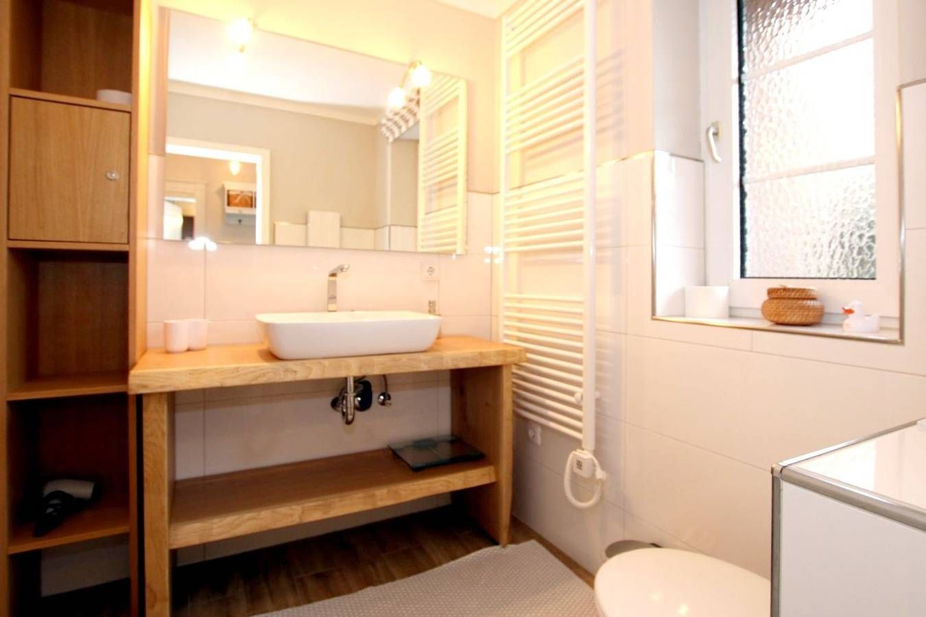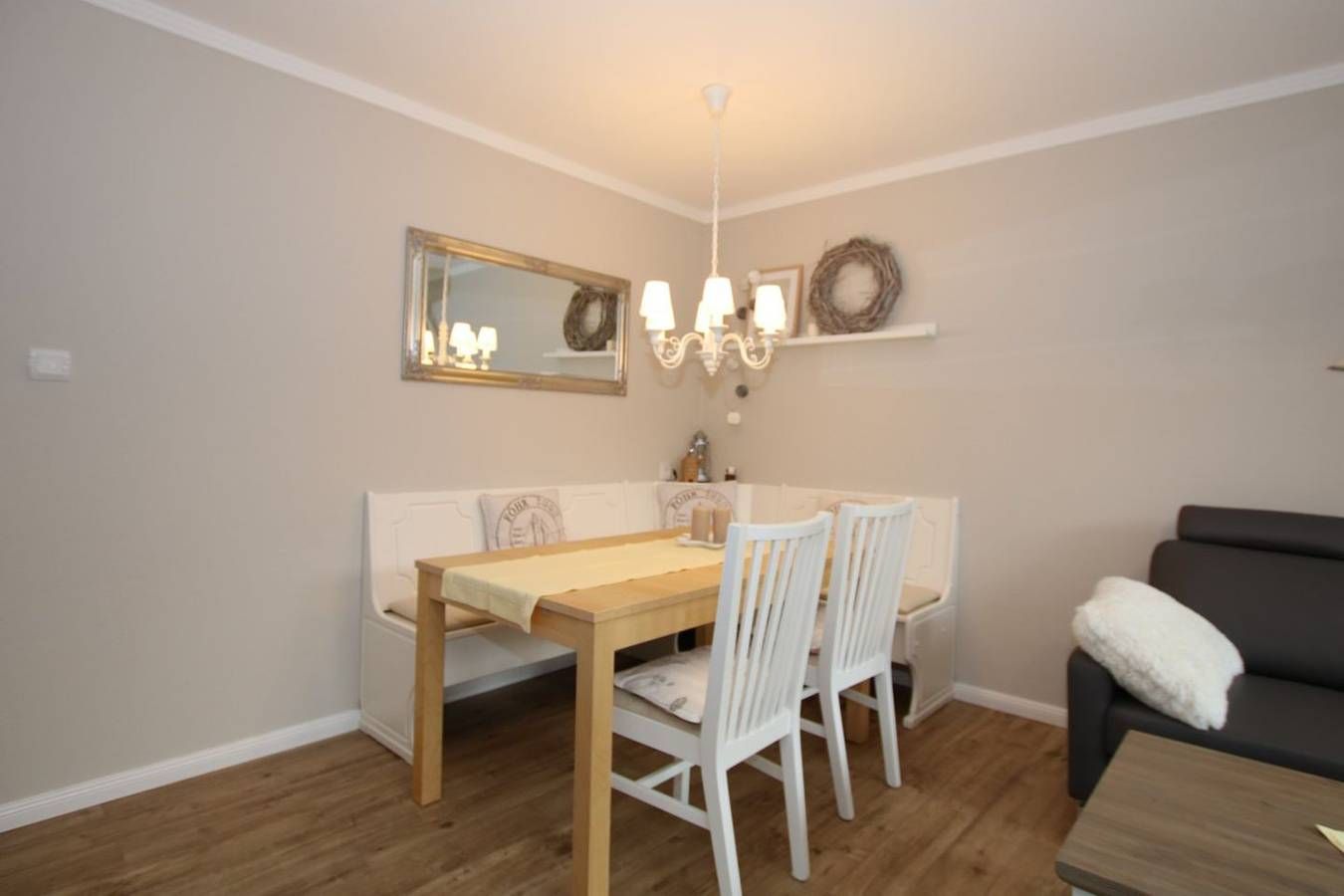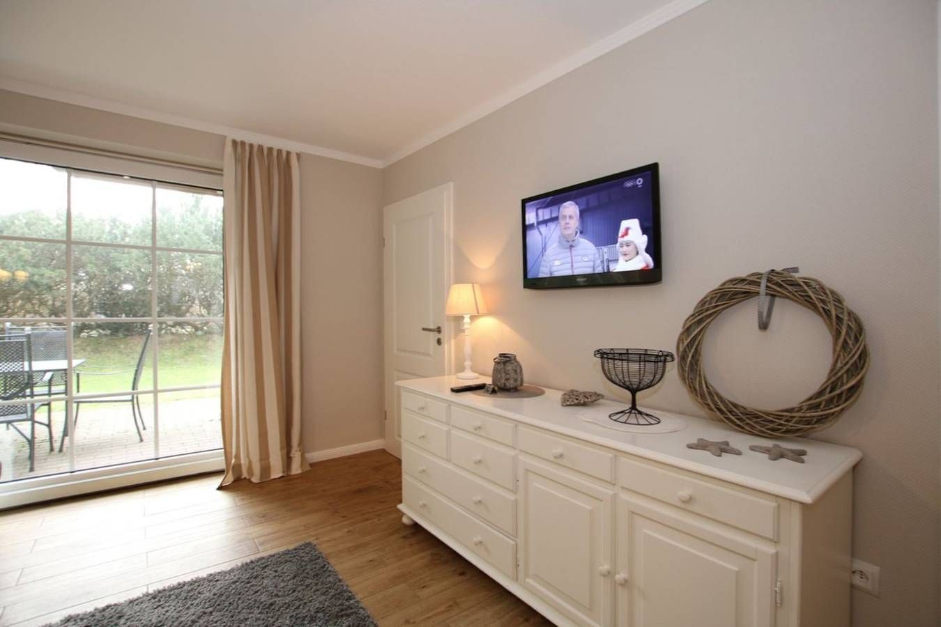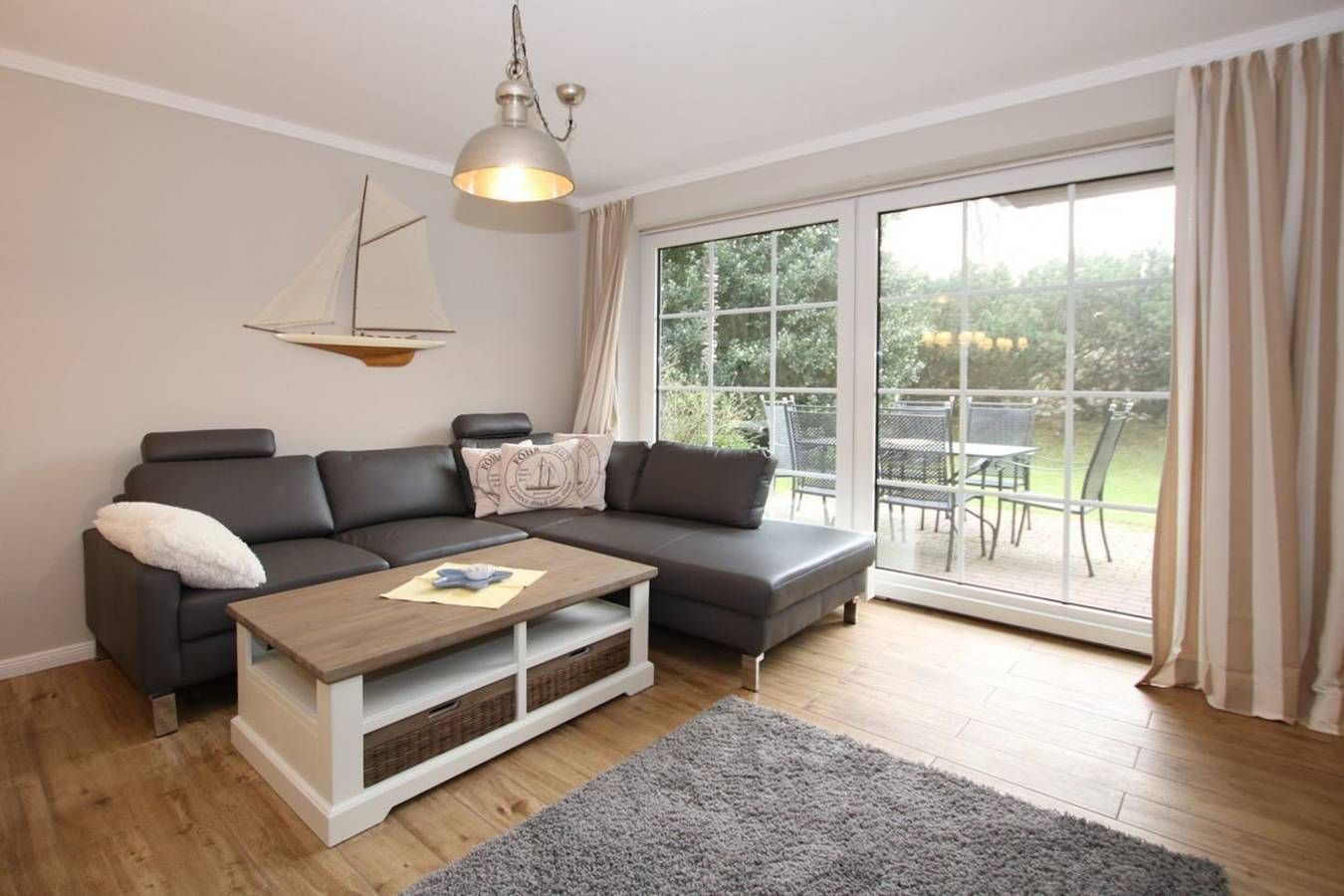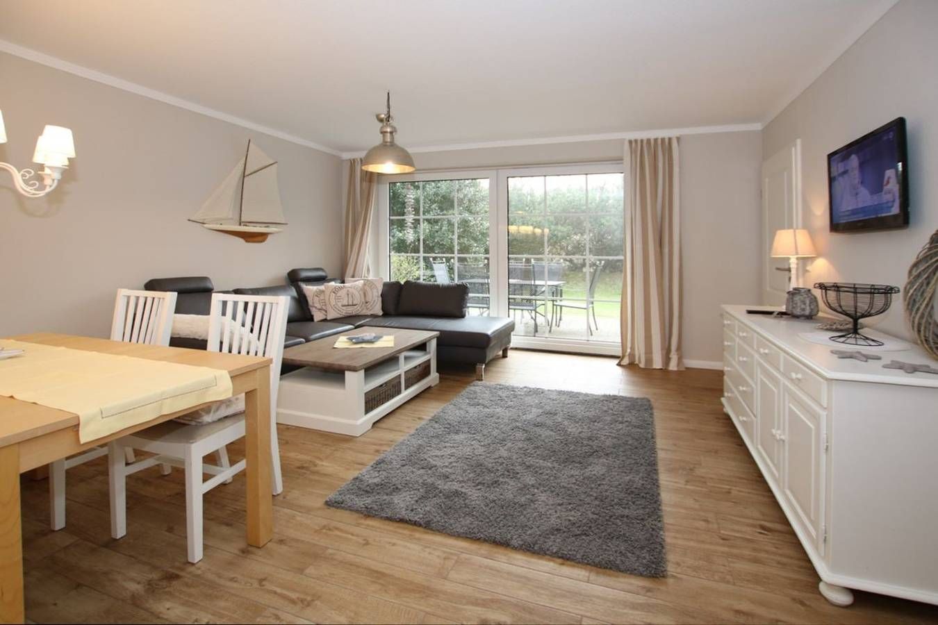 Ferienwohnung in Wyk auf Föhr, Lerchenweg 16, Wohnung Nr.2 3-Zimmer-Nichtraucherwohnung (ca. 58 qm) im Erdgeschoss mit Südterrasse und kleinem Garten. WOHNZIMMER: Ledercouch über Eck mit Couchtisch, Eßtisch mit Eckbank und 2...