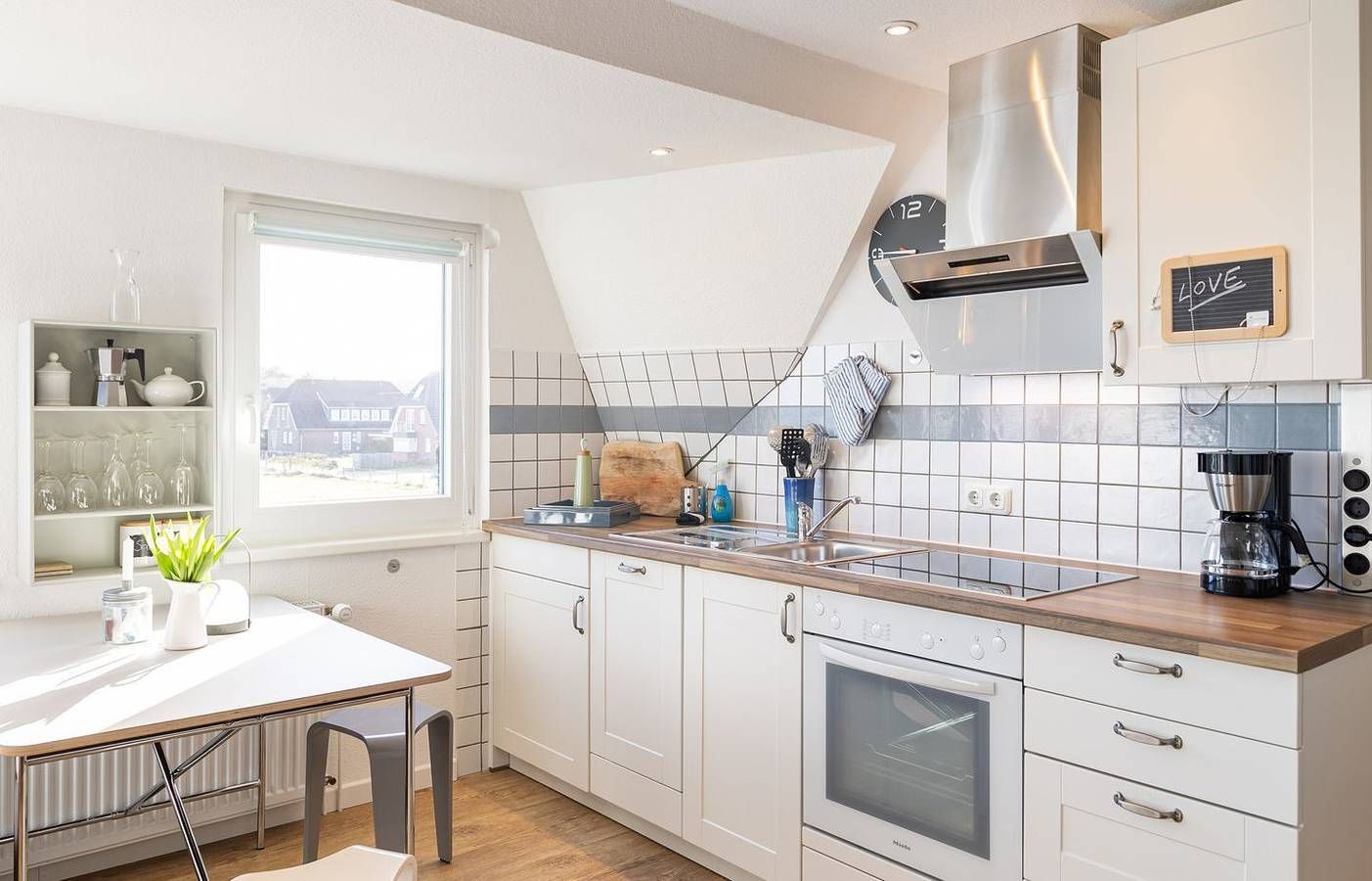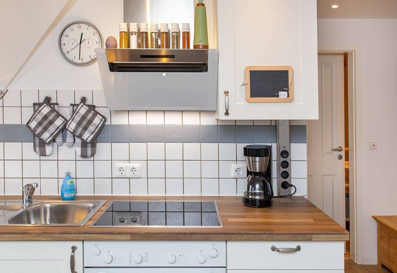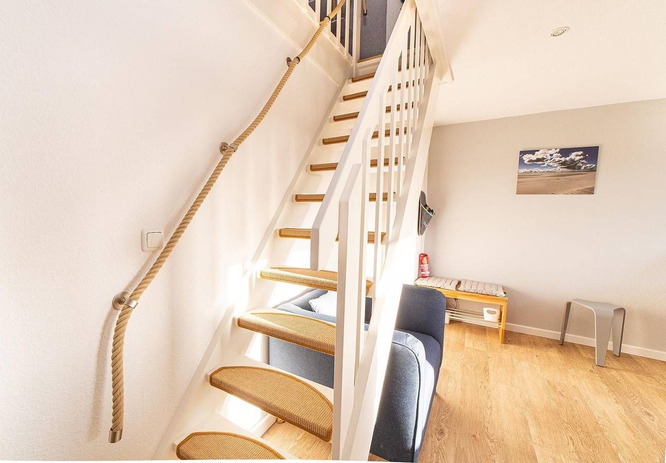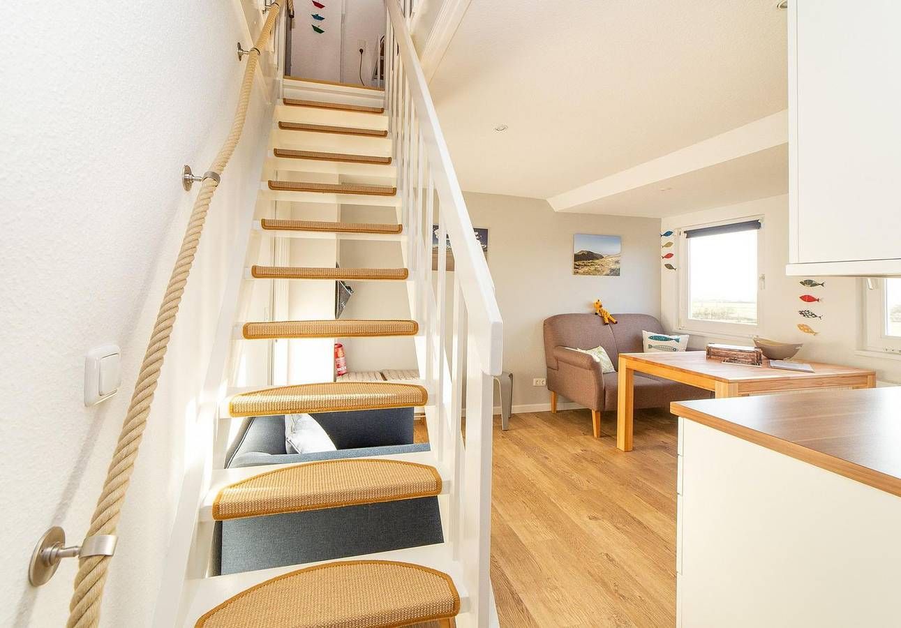 Die Ferienwohnung "Wiese & Watt" liegt am Rand von Norddorf auf Amrum. Sie hat einen weitläufigen und wunderschönen Landschaftsblick über die Wiesen der Insel und das nordfriesische Wattenmeer. Von hier schaut man in die Ferne, zum Amrumer Leuchtturm und weiter bis Wittdün im Süden und zu den Halligen im Nationalpark Wattenmeer. Die helle Küche ist mit einem Backofen, einem 4-Platten-Cerankochfeld, einer Spülmaschine, einem Kühlschrank mit Gefrierfach, Wasserkocher, Toaster, Kaffeemaschine und Geschirr & Kochutensilien ausgestattet. Vom Esstisch aus genießen Sie den weiten Blick über die Insel. Das gemütliche Schlafzimmer ist mit einem Doppelbett in einer Breite von 160 cm möbliert. Das Duschbad mit WC hat ein Fenster. Ein Fön ist ebenfalls vorhanden. Über eine Treppe ist der Spitzboden unter dem Dachgiebel zu erreichen. An einem kleinen Schreibtisch können Sie Ihre Urlaubspost schreiben. In der Wohnung wurde eine Vinyl-Kork Boden verlegt. Die Wohnung "Wiese & Watt" liegt im ersten Stockwerk. Um das Haus herum befindet sich ein schöner Garten. Genießen Sie hier die Sonne im eigenen Strandkorb und schöne Stunden im Freien. Nutzen Sie das kleine Gartenhaus gern, um dort Ihre Räder unterzustellen. Die Wohnung liegt wunderbar ruhig. Dennoch sind Sie in nur wenigen Minuten zu Fuß im Zentrum von Norddorf. Im Gemeinschaftskeller stehen Ihnen Waschmaschine und Trockner zur Verfügung. Als Gast in dieser Wohnung haben Sie kostenfreien Zugang zum Fitnessstudio & Sauna „Eilun Fit“, gleich um die Ecke in Norddorf.