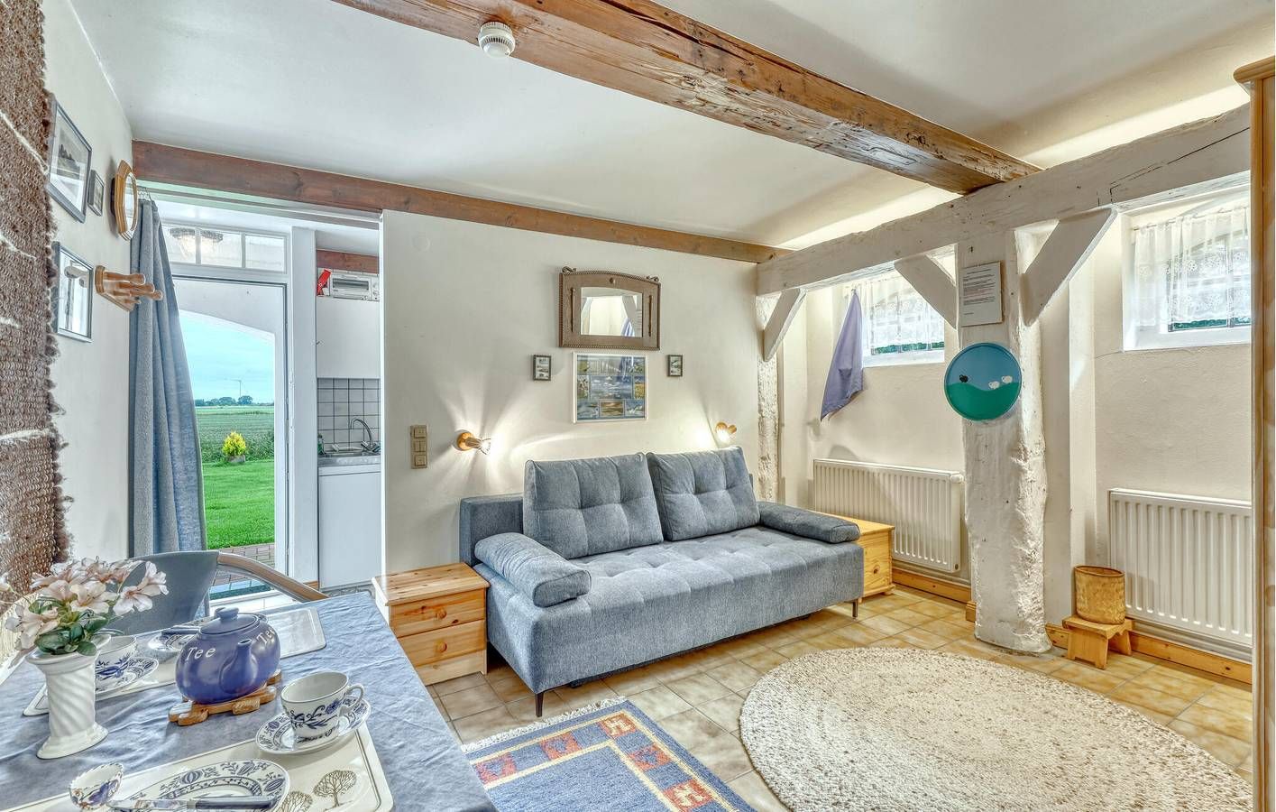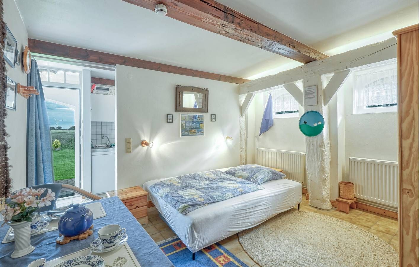 Verbringen Sie erholsame Tage in dieser charmanten Ferienwohnung mit friesischem Reetdach-Flair. Genießen Sie einen entspannten Urlaub in dieser gemütlichen Erdgeschoss-Ferienwohnung mit Platz für eine Person, die ländliche Ruhe mit traditionellem Ambiente verbindet. Betreten Sie die helle Wohnung und fühlen Sie sich sofort wohl. Entspannen Sie im großzügigen Wohnzimmer mit bequemen Sitzgelegenheiten, gemütlicher Einrichtung und einem charmanten Mix aus traditionellen Holzelementen und freundlichen Farben. Nutzen Sie die kleine, gut ausgestattete Küche, um sich kulinarisch selbst zu versorgen, und nehmen Sie Ihre Mahlzeiten direkt am Esstisch ein. Treten Sie hinaus in den liebevoll gestalteten Außenbereich. Machen Sie es sich im Strandkorb oder auf der Terrasse bequem und genießen Sie den Blick auf den Garten. Nutzen Sie den geschützten Sitzbereich, um bei jedem Wetter Zeit im Freien zu verbringen, und lassen Sie die Seele zwischen Blumen, dekorativen Elementen und friesischem Ambiente baumeln. Besuchen Sie Niebüll mit seinen Geschäften, Restaurants und dem Richard-Haizmann-Museum. Unternehmen Sie Ausflüge zu den nordfriesischen Inseln Sylt, Amrum oder Föhr, die Sie mit der Bahn oder Fähre schnell erreichen. Erkunden Sie die weiten Deiche und die Halligen bei einer Wanderung oder Radtour und lassen Sie sich von der besonderen Atmosphäre des Wattenmeeres verzaubern. Nur für Ferienaufenthalte