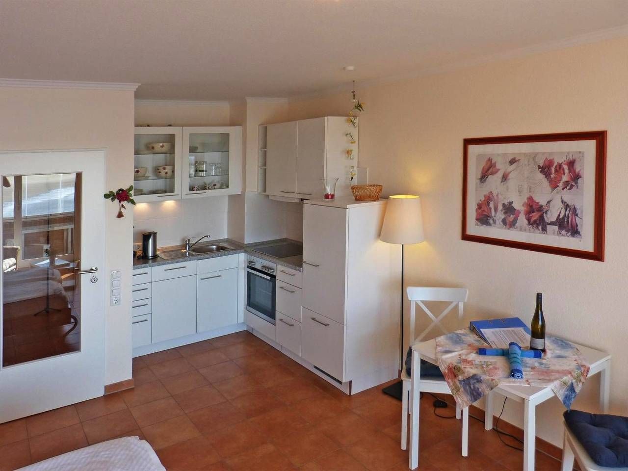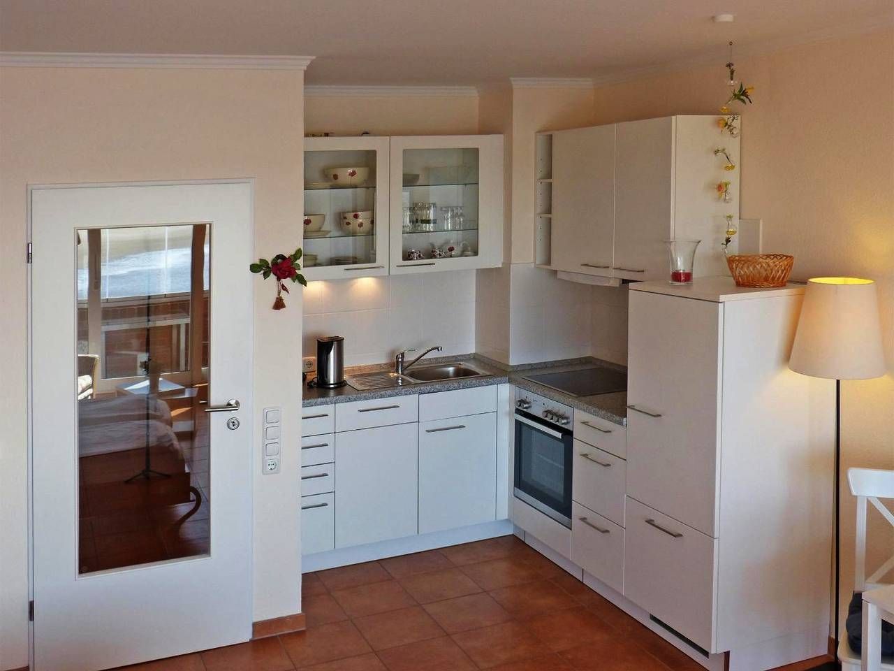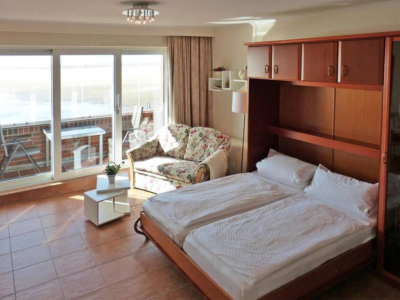 Die Ferienwohnung „Obere Wandelbahn 15/5" im 1. Obergeschoss des Hauses „Obere Wandelbahn 15b" in Wittdün auf Amrum ist eine 1-Zimmer-Ferienwohnung (ca. 40 qm Grundfläche) mit Schlafmöglichkeiten für 1 bis 2 Personen. Die Wohnung verfügt über einen kombinierten Wohn-Schlafraum mit WLAN, Sat-TV und offener Küche, 1 Badezimmer mit Dusche und WC; eine verglaster Süd-Balkon (Loggia) mit Möbeln und Meerblick. Ein PKW-Stellplatz ist am Haus.