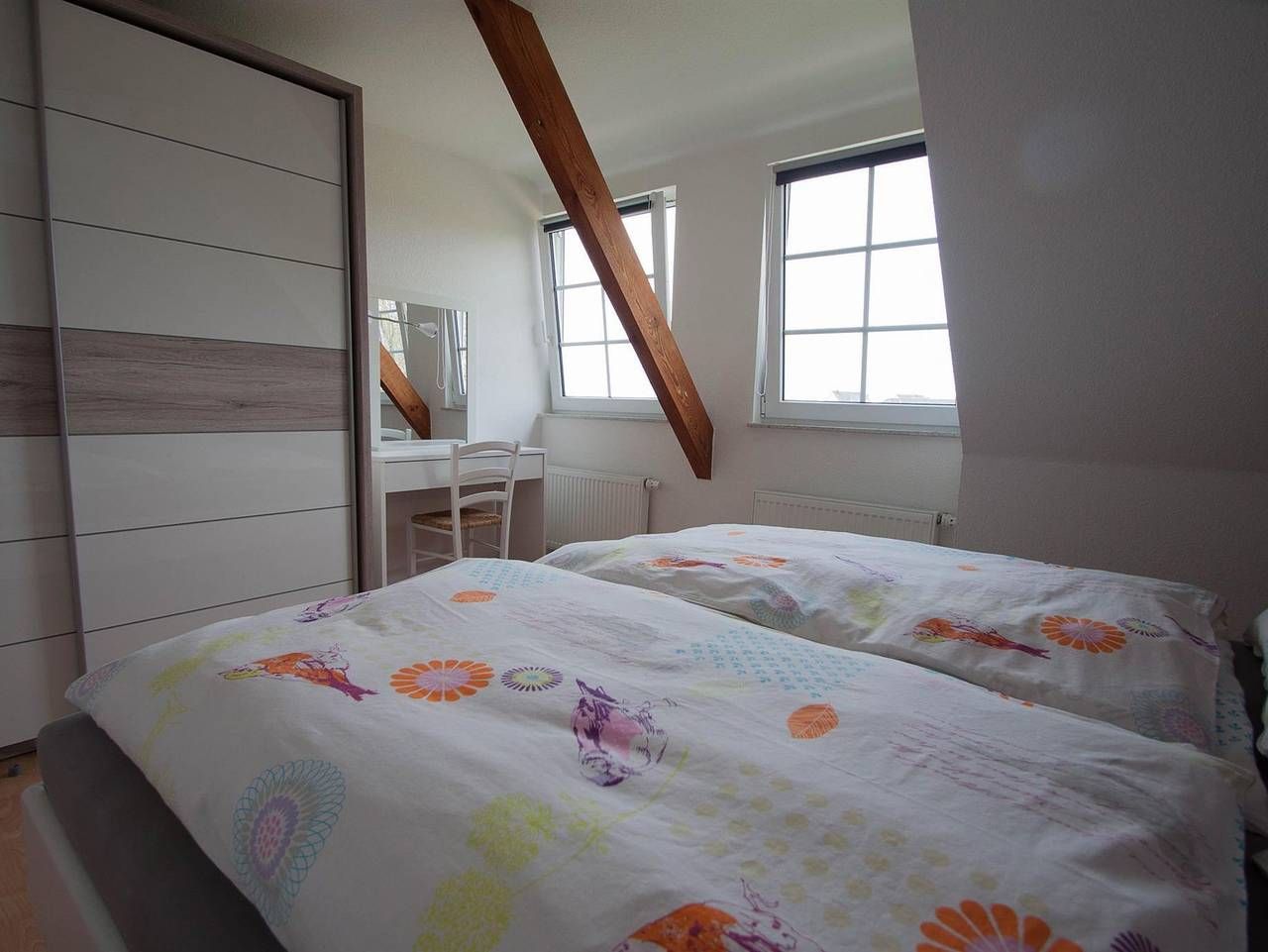 So soll Urlaub sein! Hell, freundlich und komfortabel - einfach rundum zum Wohlfühlen und Entspannen, so ist der Aufenthalt in der Ferienwohnung Pauls. Die frisch renovierte Ferienwohnung liegt im Obergeschoß des typisch norddeutsch, rot geklinkerten Hauses im grünen und idyllischen Koldenbüttel, direkt vor den Toren des Holländerstädtchens Friedrichstadt. Zu der schmucken Ferienwohnung gehört auch ein großzügiger Balkon mit direkten Blick auf die kleine, historische Dorfkirche. Wer Ruhe vom stressigen Alltag sucht, ist hier genau richtig. Parken kann man übrigens direkt vor dem Haus auf dem PKW Stellplatz für Urlaubsgäste. Die Ferienwohnung ist mit zwei Schlafräumen, einer Wohnküche und einem Badezimmer ausgestattet. Die Wohnküche hat eine Küchenvollausstattung mit Geschirrspühlmaschine, Kühlschrank mit Gefrierfach, Kaffeemaschine, Toaster, Mixer, Geschirr und Besteck. Ein Tisch mit vier Stühlen sowie eine gemütliche Sitzecke mit zwei Sofas laden zum Verweilen ein. Ein Fernseher und eine Musikanlage sind ebenfalls vorhanden. Das Badezimmer ist ausgestattet mit WC und Dusche, einer Waschmaschine und einem Wäscheständer sowie einem Fön. Im ersten Schlafraun befindet sich ein Doppelbett, ein Schrank und eine Schminktisch mit Spiegel. Im zweiten Schlafraum stehen zwei Einzelbetten und ein Schrank mit Spiegel. Ein Abstellraum mit Putzutensilien und Staubsauger sowie eine Garderobe mit Spiegel im Flur sind ebenfalls vorhanden. Der 16m² große Balkon mit Sitzecke und Sonnenschirm sowie ein Grill steht den Gästen auch zur Nutzung zur Verfügung. Handtücher und Bettwäsche sind inklusive.