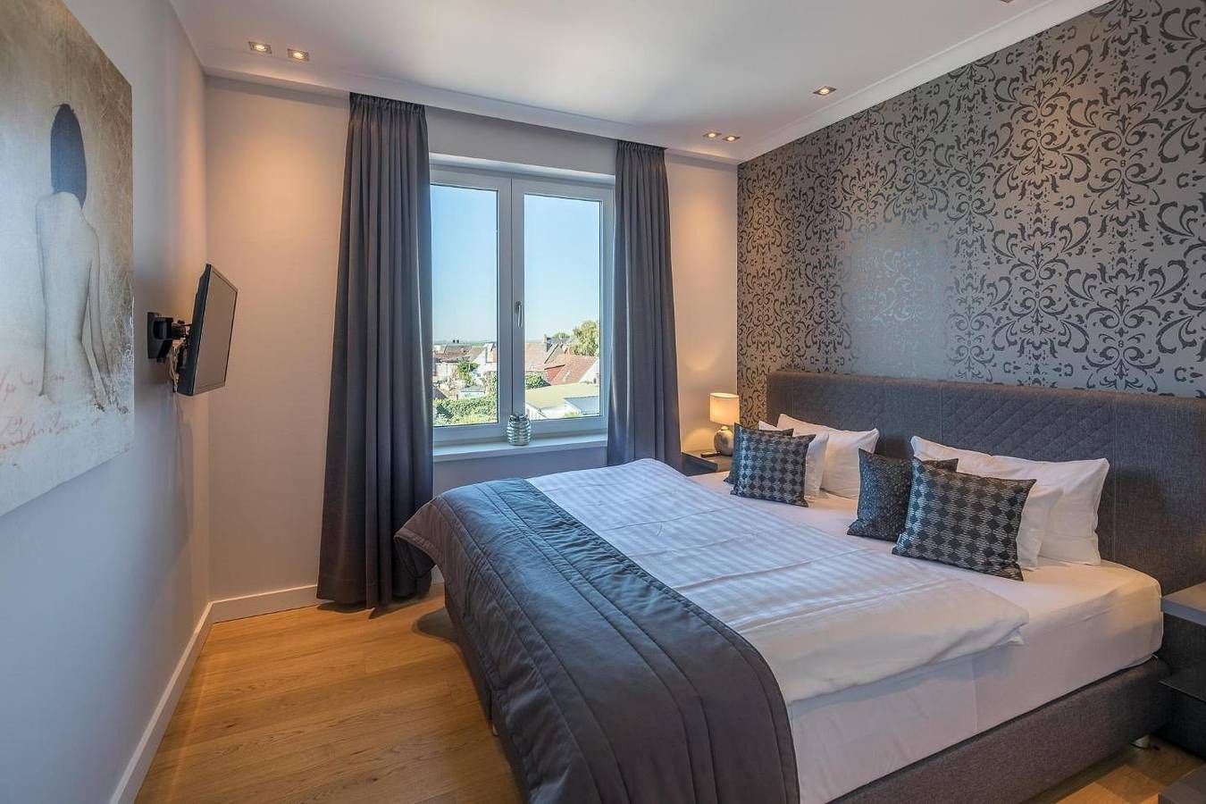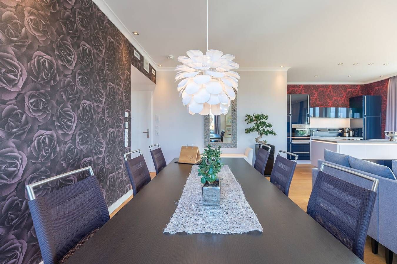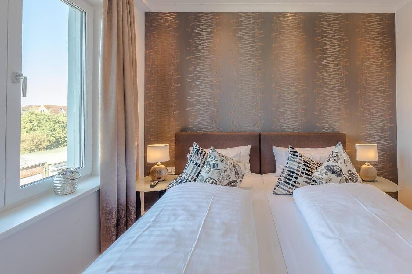 Gönnen Sie sich allen Komfort! In unserer Penthousewohnung Horizont finden Sie Luxus, Stil und Wohlbefinden über den Dächern Husums mit Blick auf die Nordsee. Die Lage Die lichtdurchflutete Ferienwohnung „Penthouse Horizont“ liegt ruhig, aber zentral in Husum, fußläufig zur Innenstadt, nur ca. 100 m vom idyllischen Hafen entfernt. Die nächsten Restaurants, Cafés und Einkaufsmöglichkeiten finden Sie in unmittelbarer Nähe. Die Ausstattung Das Apartment mit ca. 95 qm Wohnfläche befindet sich im 2. OG und ist mit einem Fahrstuhl barrierefrei erreichbar. In der offenen Küche kommen ambitionierte Hobbyköche auf ihre Kosten: Bora-Induktionsherd mit integrierter Dunstabzugshaube, Backofen, Geschirrspüler, Kühlschrank mit Gefrierfach, Filterkaffeemaschine (Filtergröße 4), Wasserkocher und Toaster. Außerdem bietet eine Nespresso-Maschine zusätzlichen Komfort. Das offene Wohnzimmer mit seiner gemütlichen Sitzecke lädt mit einem Flachbild-TV (Kabel) zum Verweilen ein. Die Wohnung verfügt über zwei Schlafzimmer, die jeweils mit Boxspring-Betten (180 × 200 und 2 mal 180 × 90 (zusammen schiebbar) und TV ausgestattet sind. Die Wohnung wird für Ihre Anreise mit Bettwäsche und Handtüchern ausgestattet. Das Wäschepaket beinhaltet Bettwäsche, zwei Geschirrtücher und pro Person eine Dusch- und ein Handtuch. Das großzügige Badezimmer bietet Ihnen neben der Wellnessdusche eine Infrarot-Sauna, von der aus Sie den schönen Blick über Husum genießen können. Weitere Annehmlichkeiten: kleines Willkommensgeschenk, Klimaanlage, elektrische Shutter, separates WC, Nebenraum mit Waschmaschine/Trockner Auf der großen Dachterrasse können Sie den Tag gemütlich auf komfortablen Gartenmöbeln ausklingen lassen und dabei den schönen Sonnenuntergang über der Nordsee beobachten. Die Besonderheiten Die Wohnung ist ein Nichtraucher-Domizil. W-LAN stellen wir Ihnen kostenfrei zur Verfügung. Ihr Auto können Sie bequem auf dem Tiefgaragenparkplatz abstellen (4,85 m x 2,50 m), Einfahrthöhe 2 m. Von hier aus führt Sie der Fahrstuhl direkt zur Wohnung. Hier können Sie auch Ihr E-Bike sicher unterstellen und laden. Genießen Sie die Sonnenstunden auf der geräumigen Dachterrasse. Allen Tennissportlern bieten wir die Möglichkeit, eine Tennisanlage (Sandplätze) in der Nähe für einen Wochenpreis von 45 € für zwei Personen hinzuzubuchen. Von Ostern bis Herbst wird diese Wohnung von Samstag bis Samstag vermietet. Die 3. und 4. Person zahlt 10 € pro Übernachtung. Eine Erstausstattung an Bettwäsche und Handtüchern wird bei dieser Unterkunft obligatorisch hinzugebucht und ist bereits im Endpreis enthalten. Zusätzliche Wäschepakete können in den optionalen Leistungen hinzugebucht werden. Haustiere sind in dieser Unterkunft nicht gestattet.