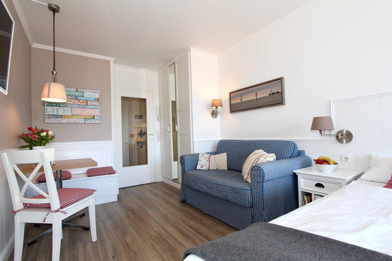 Das Wohn-/Schlafzimmer ist mit einem Doppelbett, Sofa, Kleiderschrank, Flachbildfernseher, Radio und einem Esstisch ausgestattet. Im Vorraum der Wohnung gibt es eine kleine Küchenzeile mit Kühlschrank (4-Sterne-Gefrierfach) und...
