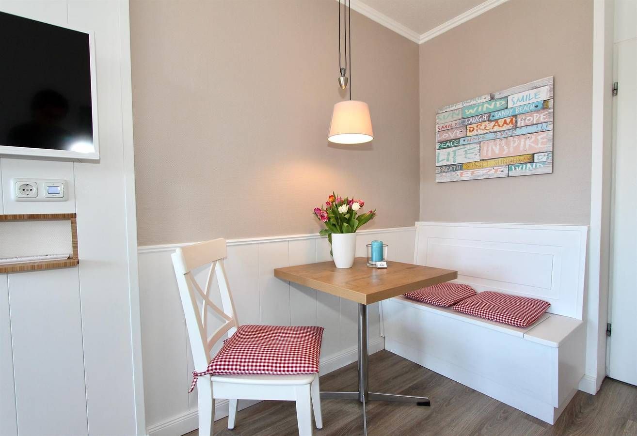 Das Wohn-/Schlafzimmer ist mit einem Doppelbett, Sofa, Kleiderschrank, Flachbildfernseher, Radio und einem Esstisch ausgestattet. Im Vorraum der Wohnung gibt es eine kleine Küchenzeile mit Kühlschrank (4-Sterne-Gefrierfach) und Ceran-Kochfeld. Außerdem gehört zur Wohnung ein kleines aber hochwertiges Bad mit Dusche. Vom Wohnzimmer gelangen Sie auf den sonnigen und windgeschützten Balkon (West bis Südwest) mit Blick in Richtung Promenade. Das Objekt verfügt über ca. 26 qm Wohnfläche. **** Bettwäsche und Handtücher kostenfrei **** Liebe Gäste, das Appartement Strandperle wurde liebevoll umgebaut und renoviert. Die Einrichtung im maritimen Stil mit hochwertigen Einbauten ist überwiegend in weiß gehalten. Besonderen Wert haben wir auf einen erholsamen Schlaf in einem bequemen Doppelbett (1,60 x 2 m) mit verstellbaren Lattenrosten und hochwertigen Matratzen gelegt. Die Betten werden für Sie frisch bezogen, sodass der Urlaub von Anfang an entspannt beginnen kann. Die Wohnung liegt sehr zentral mitten im Zentrum von BAD im Haus Loreley in einem kleinen Appartement im 1. OG mit schönem Balkon zur Sonnenseite (Südwest !). Vom windgeschützten Balkon aus können Sie entlang des Strandläuferwegs bis hin zum Deichvorland mit Strandpromenade blicken oder einfach das bunte Treiben entlang der Flaniermeile mit diversen Restaurants und Läden beobachten. Ihren Pkw können Sie auf den für Sie reservierten Pkw-Stellplatz Nr. 17 in der hauseigenen u. abgeschlossenen Tiefgarage kostenlos abstellen. Mehrere Fahrradverleihe befinden sich in der Nähe. Wanderwege durch Dünen und dem Kiefernwald beginnen direkt hinter dem Haus. Aufgrund der Nähe zu diversen Kureinrichtungen und zum Gesundheitszentrum ist die Ferienwohnung auch ideal für Angehörige oder Begleitpersonen. Die Bettwäsche, Handtücher und Geschirrtücher werden kostenfrei gestellt. WLAN, Strom und Wasser sind ebenfalls inklusiv. Die Tiefgarage befindet sich im Haus, der Stellplatz Nr. 17 gehört zur Wohnung und ist kostenfrei. Der Gesamtpreis beinhaltet auch die Kurkarten. Nach erfolgter Buchung erhalten Sie einen Link, damit Sie die digitalen Kurkarten auf Ihr Handy laden können. Es handelt sich um eine Nichtraucherwohnung. Haustiere dürfen nicht mitgebracht werden. Schlüsselservice - Der Schlüssel wird Ihnen von der Agentur gebracht !