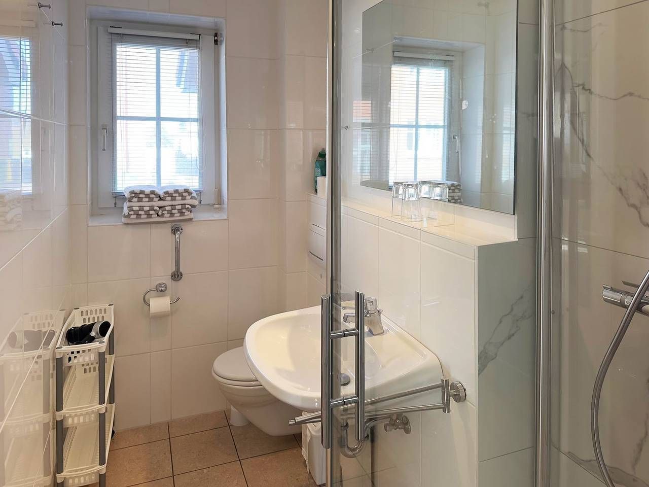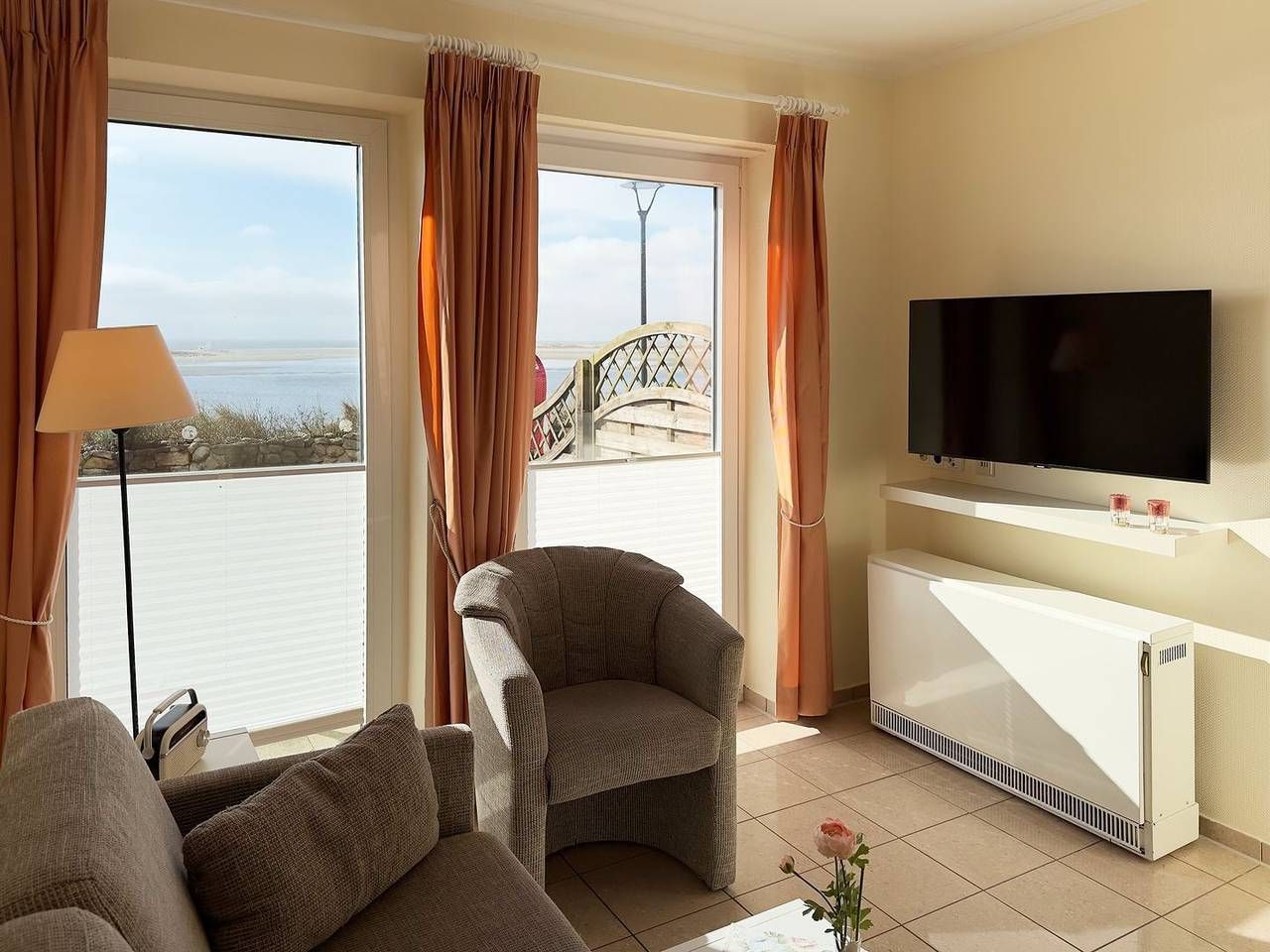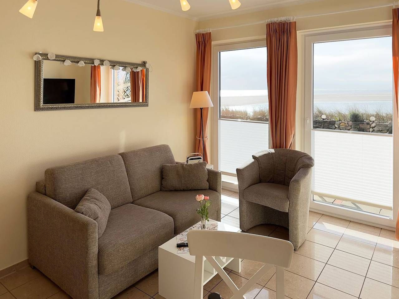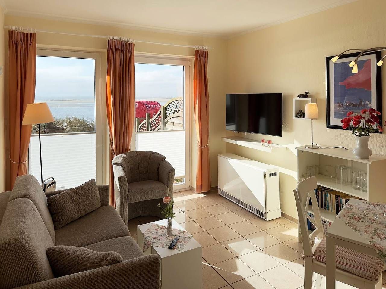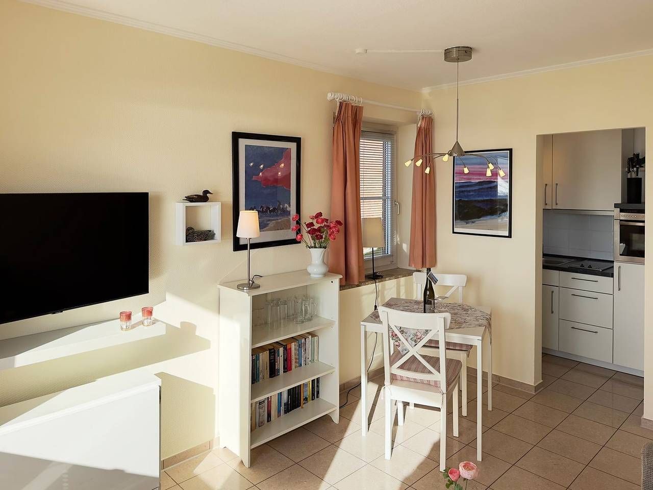 Die Ferienwohnung „Südspitze 34/24" im Erdgeschoss des Hauses in Wittdün auf Amrum ist eine 2-Zimmer-Ferienwohnung (ca. 32 qm Grundfläche) mit Schlafmöglichkeiten für 1 bis 2 Personen. Die Wohnung verfügt über 1 Wohnraum mit WLAN, Sat-TV und offener Küche, 1 Schlafzimmer, 1 Badezimmer mit Dusche und WC; eine Süd-Terrasse mit Gartenmöbeln (April bis Oktober) und Meerblick, PKW-Stellplatz.