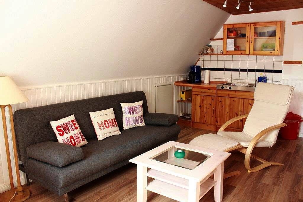 Die Wohnung ist 38qm groß und für bis zu 2 Personen geeignet. Sie ist zweckmäßig ausgestattet. Wohnraum mit Sitzecke u.a. mit LCD-Flachbildschirm-TV (Sat TV). Separates Schlafzimmer mit Doppelbett. Der Zugang zum Badezimmer erfolgt durch das Schlafzimmer. Zwischen Bett-Fuß-Ende und Wand ist nur ein schmaler Durchgang. Vollständig ausgestattete Küchenzeile mit Minibackofen , Kühlschrank, Wasserkocher, Toaster etc. Essecke im Wohnraum. Badezimmer mit Dusche/WC. Sitzecke im Garten. Privates Ferienhaus mit drei preiswerten, gemütlichen Ferienwohnungen am Ende einer verkehrsberuhigten Ferienwohnung im Ortsteil St. Peter-Dorf. In der Nähe ausgedehntes Dünengelände, Reithalle und idyllischer Dorfkern. Pkw-Stellplätze sind vorhanden. Urlaub mit Hund auf Anfrage gerne möglich. Für die Obergeschoss-Ferienwohnungen wurde auf dem Grundstück eine Sitzecke mit Gartenmöbeln angelegt; die Erdgeschoss-Ferienwohnung hat eine möblierte Terrasse. Die gemütlich und individuell ausgestatteten Ferienwohnungen werden jedem Anspruch gerecht. Schnelles WLAN-Netz kostenlos für unsere Gäste. Unsere Ferienwohnungen Ufer liegt in einer ruhigen Seitenstrasse im Ortsteil St. Peter-Ording-Dorf; die Strandüberfahrt, den Deich und das Vorland mit den Salzwiesen erreichen Sie in wenigen Gehminuten. Von dort aus wandern Sie zum Strand; die Dauer ist abhängig von Ebbe und Flut (siehe Gezeitenkalender der Kurverwaltung). Auch die anderen Strände von den Ortsteilen St. Peter-Ording-Bad, St. Peter-Ording-Böhl und St. Peter-Ording-Ording sind gut zu Fuß, mit dem Fahrrad, mit dem Auto oder dem Bus zu erreichen. Auch dort erleben Sie Freiheitsgefühl auf dem großflächigen Sandstrand mit der Heilkraft der Natur. Kurarzt, Therapiemöglichkeiten, Fahrradverleihe und die Angebote des täglichen Bedarfs erreichen Sie in wenigen Gehminuten. Ein vielseitiges Restaurationsangebot befindet sich ebenfalls in unmittelbarer Nähe und im nahegelegenen historischen Ortskerns. Für den Kirchgang ist die katholische und evangelische Kirche zu Fuß bequem zu erreichen. Die Benutzung des Ortsbusses ist für die Gäste von St. Peter Ording kostenfrei. Reiterfreunde: Reiterfreunde erreichen die Reitanlage mit Quartiermöglichkeiten für mitgebrachte Pferde in knapp 5-10 Gehminuten. Nur von dort ist das Reiten am Meer erlaubt. WLAN kostenlos Hunde sind herzlich willkommen; Gebührenpflichtig Bettwäsche, Trocken-, Bade- und Geschirrtücher werden kostenlos bereitgestellt Die Kurabgabe wird bei Einzug fällig Anreise ab 15.00 Uhr. Abreise bis 10.00 Uhr.