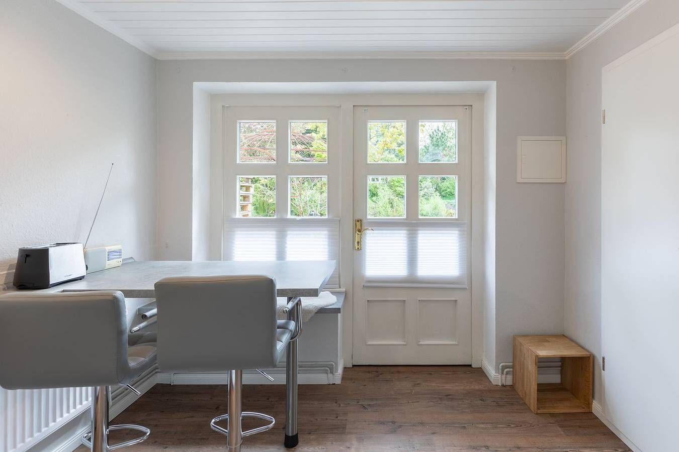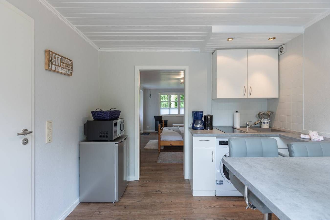 Die Ferienwohnung "Zwischen Wald und See" in Husum-Schobüll für bis zu zwei Personen eignet sich ideal für Berufsreisende und Nordseebegeisterte. Die Lage Die Ferienwohnung befindet sich im Erdgeschoss einer Doppelhaushälfte in Husum-Schobüll, ca. 5 km vom Husumer Stadtzentrum entfernt. Schobüll selbst bietet alles für einen herrlichen Urlaub; direkter Nordseezugang zum Baden (Badesteg mit Dusche), 3 Restaurants sind fußläufig erreichbar, ein gut sortierter Kaufmann befindet sich nur ca. 50 m von der Ferienwohnung entfernt und darüber hinaus finden Sie in unmittelbarer Nähe eine Reithalle, Minigolf, eine Bushaltestelle etc. Die Ausstattung Die Wohnung ist mit allem Notwendigen ausgestattet: ein Schlafzimmer mit einem bequemen Doppelbett, einem Sitzbereich, einer Pantryküche mit 2-Platten-Herd, Kaffeemaschine, Wasserkocher, Toaster, Mikrowelle und vielem mehr. Im Badezimmer finden Sie die Dusche, WC und Waschbecken. Auf der schönen Gemeinschaftsterrasse können Sie den Tag vor dem wunderschön bewachsenen Garten ausklingen lassen. Auf der Terrasse gibt es zudem Liegestühle und eine Sitzbank. Bitte haben Sie Verständnis dafür, dass nur der vordere Bereich der Terrasse zur Wohnung gehört. Die Besonderheiten Bitte beachten Sie, dass sich die Wohnung hinter einem Blumenladen befindet. Vor der Ferienwohnung ist mit Kunden zu rechnen, die sich die Pflanzen anschauen. Ihr Auto können Sie auf einem der zahlreichen Parkplätzen des Geschäftes "Höfer" abstellen. In der Nichtraucher-Ferienwohnung stellen wir unseren Gästen gerne kostenloses WLAN zur Verfügung. Eine Erstausstattung an Bettwäsche und Handtüchern ist bei dieser Unterkunft obligatorisch und bereits im Endpreis enthalten. Zusätzliche Wäschepakete können bei den optionalen Leistungen hinzugebucht werden.