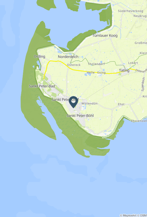 Die Wohnung liegt im Ortsteil Dorf, dem südlichsten Ortsteil von St. Peter-Ording, acht Minuten zu Fuß vom Ortskern. Sehr ruhige Lage in einer Sackgasse, direkt neben einem Einfamilienhaus. Der Südstrand ist zu Fuß in ca. 20...