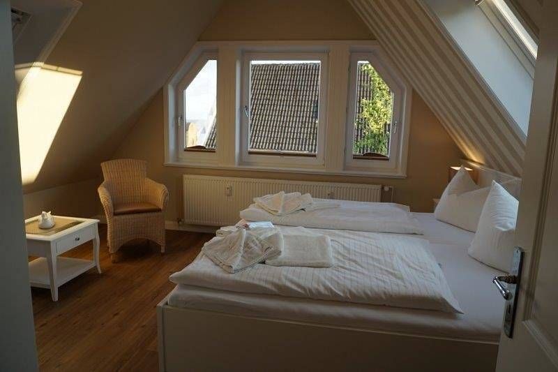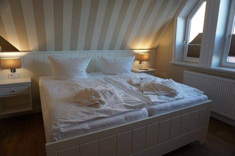 Moin und herzlich willkommen in Ihrer Wohlfühloase auf Föhr. Unsere stilvolle Wohnung im "Fiete Deppe Hus" mit traumhaftem Meerblick erwartet Sie im Herzen von Wyk, direkt am Beginn der Strandpromenade. Nur wenige Schritte trennen Sie vom lebhaften Wyker Hafen und dem bewachten Badestrand - perfekt für entspannte Strandtage und ausgiebige Spaziergänge. Im direkten Umkreis laden gemütliche Restaurants, Cafés und das Kino zum Verweilen ein. Sämtliche Einkaufsmöglichkeiten befinden sich ebenfalls in unmittelbarer Nähe. Die lichtdurchflutete Nichtraucherwohnung erstreckt sich über zwei Etagen im zweiten Stock sowie Dachgeschoss des Hauses und bietet Ihnen auf rund 120 m² viel Raum für Entspannung und Erholung. Wäschepakete (Bettbezüge und Handtücher) sind nicht inklusive, können jedoch optional hinzugebucht oder selbst mitgebracht werden. Im Fiete Deppe Hus genießen Sie den Komfort der zentralen Lage direkt am Anfang der Wyker Fußgängerzone, inmitten des charmanten Insellebens. Freuen Sie sich auf einen behaglichen Wohnbereich mit Sofaecke, moderner Unterhaltungstechnik und Gesellschaftsspielen - ideal für gemütliche Abende. Der Essbereich und die offene Küche fügen sich harmonisch in den Raum ein und bieten den perfekte Ort für gemeinsame Mahlzeiten mit einem einzigartigen Blick über die Nordsee und ihre Halligwelt. Erholsamen Schlaf finden Sie in den zwei liebevoll gestalteten Schlafzimmern mit hochwertigen Doppelbetten. Für die Kleinen oder weitere Gäste bietet das Kinderzimmer mit zwei Einzelbetten (80 x 200 cm) eine ideale Rückzugsmöglichkeit. Ein geräumiger Wasch- und Abstellraum mit Waschmaschine und Trockner steht Ihnen im oberen Bereich der Wohnung zur Verfügung, sodass Sie auch längere Aufenthalte bequem genießen können. Ob Sie die Schönheit der Nordsee erkunden oder einfach die Seele baumeln lassen möchten - diese Wohnung im Fiete Deppe Hus ist der perfekte Ausgangspunkt für unvergessliche Urlaubstage. Kinderbetten 80 x 200 cm, in der Wohnung befindet sich auch ein Wickeltisch