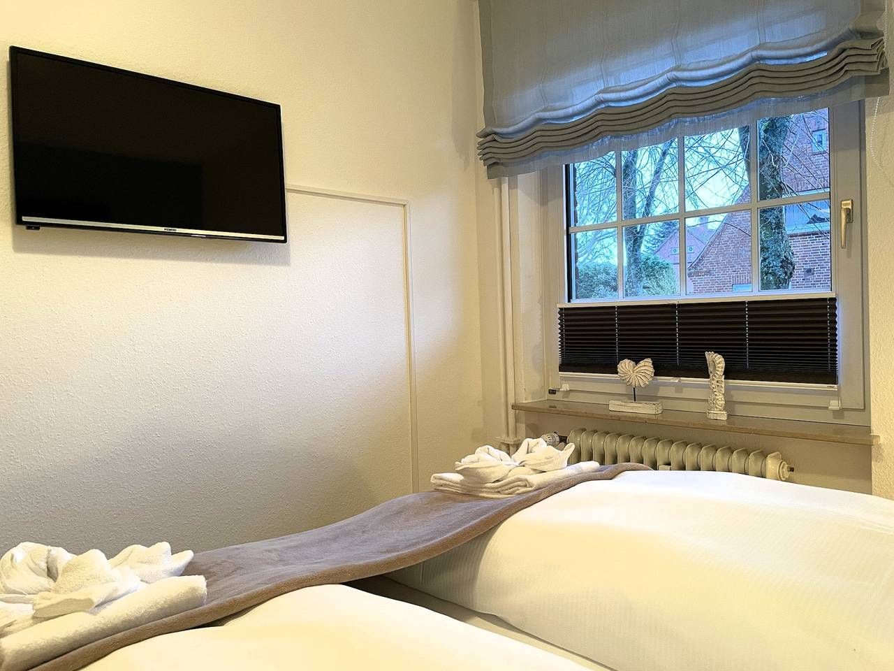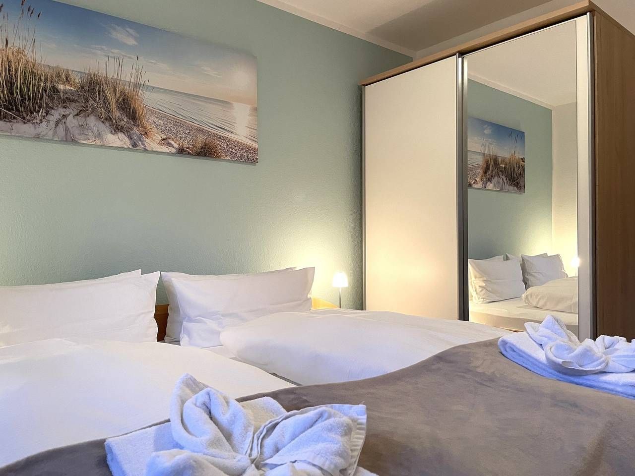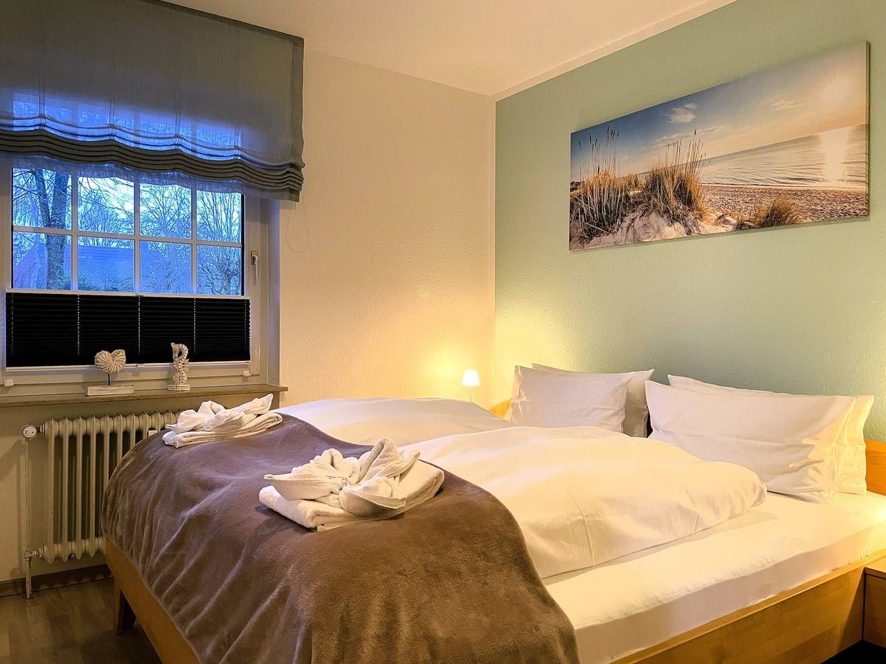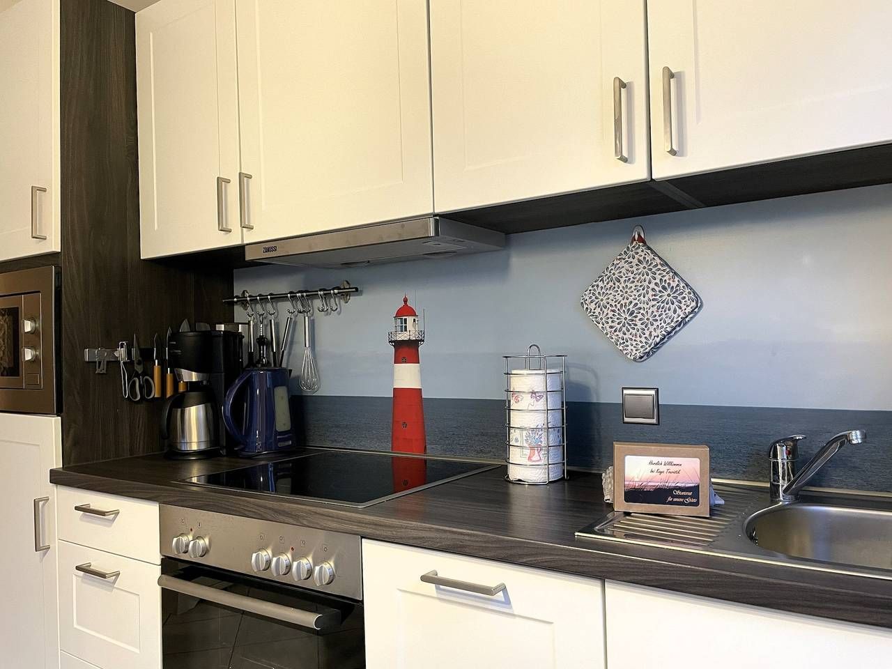 Eine sehr liebevoll gestaltete Wohnung in der Friedrichstraße in Wyk nahe des hübsch angelegten Mühlenparks und nur wenige Schritte entfernt von der Innenstadt bieten wir Ihnen hier an. Eine wirklich gute Empfehlung für 2 Personen. Das gepflegte Mehrfamilienhaus mit insgesamt 8 Wohneinheiten liegt strand-und zentrumsnah in der verkehrsberuhigten Friedrichstrasse. Die Wohnung Mühlenpark eignet sich daher auch hervorragend, wenn Sie ohne Auto anreisen möchten. Die Wyker Innenstadt mit den kleinen Läden, Cafés und Restaurants, die Strandpromenade und den idyllisch angelegten Mühlenpark erreichen Sie fußläufig - ebenso den Edeka-Markt, die Postfiliale und das Aqua Föhr. Im Untergeschoss des Hauses befindet sich ein Waschraum mit eigener Waschmaschine und Trockner zur kostenfreien Nutzung. Am Haus befindet sich zur gemeinsamen Nutzung ein Fahrradständer und der zur Wohnung gehörende PKW-Stellplatz. Genießen Sie Föhr in vollen Zügen und in einer herrlichen Wohnung. Das Domizil Mühlenpark befindet sich im Erdgeschoss des Hauses und wurde geschmackvoll und mit viel Liebe eingerichtet und mit freundlichen Accessoires erstrahlt die hübsche Wohnung im charmanten Glanz. Von einem kleinen Flurbereich gelangen Sie in die weiteren Räume wie dem feinen Duschbad mit Handtuchheizung, dem freundlich wirkendem Schlafzimmer mit Fenster, Doppelbett (180x200cm) und geräumigem Kleiderschrank und dem Wohn-Essbereich mit integrierter Küche. Eine gemütliche Sitzecke mit hochwertigem Schlafsofa (1,35 x 2,00m), WLAN, einer kleinen Auswahl an Spielen und Flachbild-TV ist harmonisch abgestimmt auf den hellen Essbereich und die gut ausgestattete Küchenzeile, die mit Backofen, Ceranfeldherd, Mikrowelle, Geschirrspüler, Kaffeemaschine, Wasserkocher, Mixer, Eierkocher und vielem mehr zum Kochen einlädt. Der Balkon (Süd-Ost)ist teilüberdacht und in Richtung Mühlenpark gelegen. Wir wünschen viel Freude bei Ihrer Urlaubsplanung und können unser Domizil Mühlenpark bestens für einen Urlaub zu Zweit empfehlen! Highlight: Am Strand erwartet Sie von ca. Anfang Mai bis Ende September ein Saisonstrandkorb, der Ihnen kostenfrei zur Verfügung steht! ---------------------------------------- 2025: Infos zum Wäschepaket (obligatorisch): Unser Wäschepaket besteht aus der bezogenen Bettwäsche, 1 Duschtuch, 2 Handtüchern, 1 Geschirrtuch und einem Badvorleger und gehört obligatorisch zur Buchung dazu. Ab 21 Übernachtungen bieten wir auf Wunsch einen kostenfreien Wäschewechsel an. Zusätzlich können Handtücher und Duschtücher optional nach Bedarf einzeln hinzugebucht werden. Ab 2026 mehr Flexibilität und Individualität: Das bekannte Wäschepaket ist nicht mehr buchbar. Die Bettwäsche bleibt aus hygienischen Ansprüchen eine obligatorische Serviceleistung. Sie finden die Betten weiterhin bezogen vor. Doch Hand- und Duschtücher können Sie künftig entweder selbst mitbringen oder auf eigenen Wunsch einzeln optional hinzubuchen. Diese Variante ist aus betrieblichen Gründen erst für Buchungen in 2026 buchbar und entspricht dem Gästewunsch laut Umfrage nach mehr Flexibilität, Individualität und Nachhaltigkeit! Infos zum Präsentkorb Föhrer Inselkäse für 2 oder 4 Personen (Inhalte nicht austauschbar) Der Föhrer Präsentkorb für 4 Personen enthält: 200g Föhrer Naturkäse, 200g roten Föhrer Fruchtaufstrich, 430g Alkersumer Gemüsetopf, 6 Stangen (ca. 160g) Wattwürmer, 150g Landleberwurst , 125ml Föhrer Chutney und 0,33l Föhrer Biar. Der Föhrer Präsentkorb für 2 Personen enthält: 200g Föhrer Bärlauch-Käse, 200g Föhrer Fruchtaufstrich Apfel-Zimt, 430g vegane Linsenbolognese und ca. 130g mildem Landschinken vom Schwein.