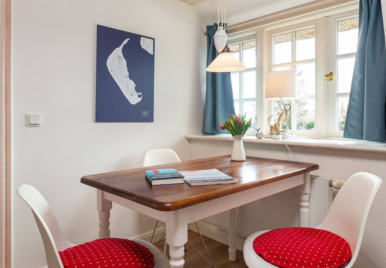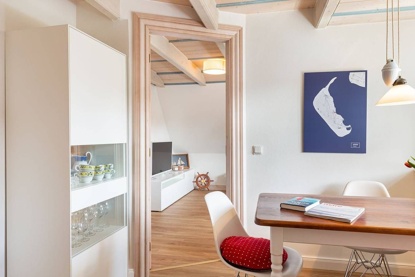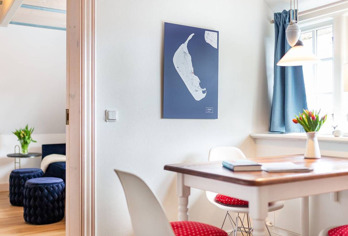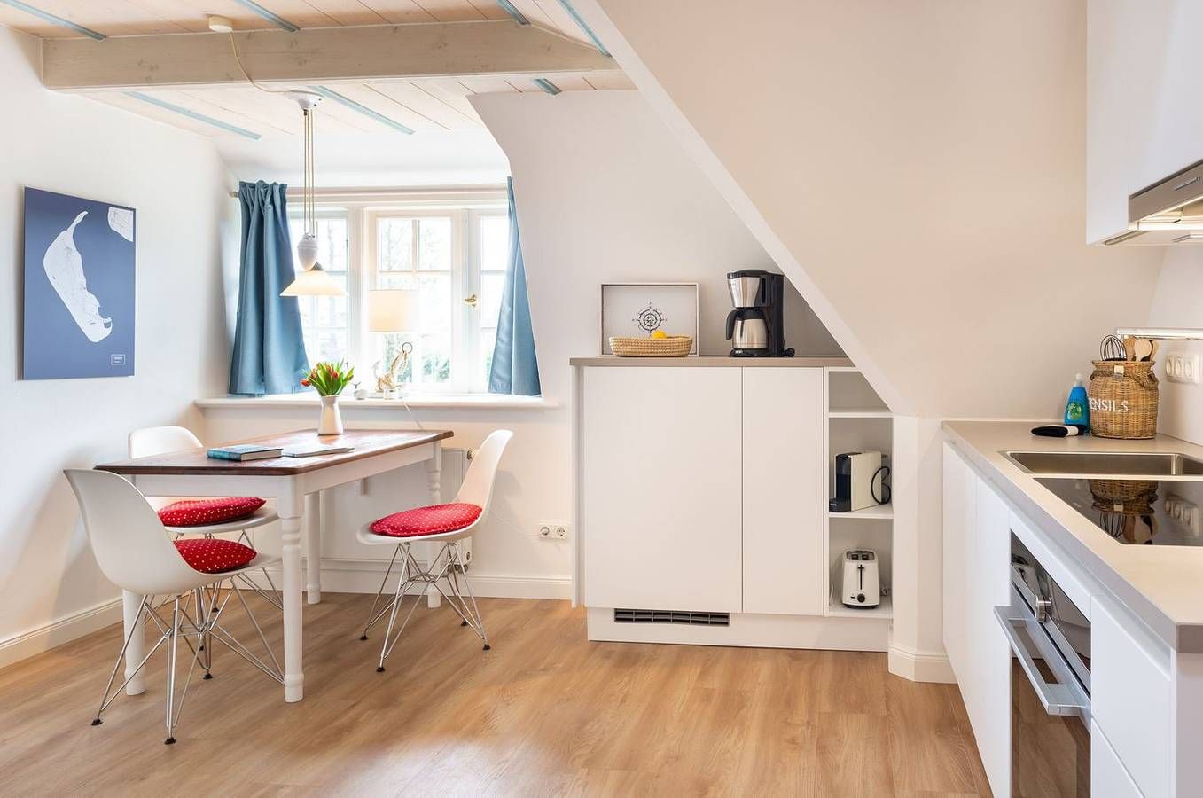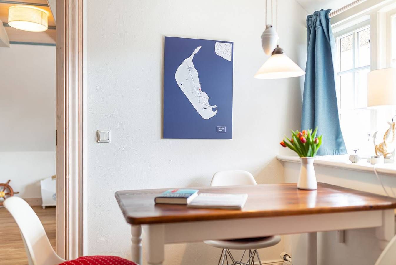 In der Ferienwohnung Friesenglück können sie einen hyggeligen Urlaub mit Blick auf das Watt genießen. Zu zweit eine Auszeit nehmen und zur Ruhe kommen. Im Herbst und Winter sorgt der Kaminofen nach einem langen Strandspaziergang für gemütliche Stunden. Erholung pur. Die gemütlich eingerichtete Wohnung befindet sich im Haus Hafis in Nebel. Das Haus Hafis befindet sich im Uasterstigh 33 – mitten in Nebel und direkt am Wattenmeer. Nur wenige Schritte entfernt finden Sie Restaurants, Teestuben, einen Supermarkt, Bäcker, Fahrradverleih etc. Mit dem Fahrrad sind es nur wenige Minuten zum breiten wunderschönen Kniepsand, Amrums Strand. Die Ferienwohnung Friesenglück verfügt über einen separaten Hauseingang. Oben angekommen, finden Sie eine voll ausgestattete Einbauküche mit Geschirrspüler, Herd, Backofen, Espresso- und Kaffeemaschine vor. Von der Küche kommen Sie in das gemütliche Wohnzimmer mit Kachelofen und TV. Das Schlafzimmer befindet sich mit einem 1,60 breiten Bett im Galeriegeschoss. Ausgelegt ist die Wohnung für 2 Erwachsene. Im großen Garten haben Sie eine eigene Terrasse mit Sitzmöbeln. Zur Wohnung gehört auch ein Parkplatz. Im Juli 2020 wurde das gesamte Haus mit einer neuen WLAN-Anlage und neuen Routern ausgestattet, so dass Sie ein sehr gut funktionierendes WLAN vorfinden, mit dem stabil Videokonferenzen abzuhalten sind. So eignet sich die Wohnung auch gut für Alleinreisende, die ortsunabhängig arbeiten können und dies in Ruhe von Amrum aus tun möchten. Langzeiturlaub auf Anfrage. Keine Haustiere. Nur Nichtraucher. Waschmaschine und Wäschetrockner vorhanden. Als Gast in dieser Wohnung haben Sie kostenfreien Zugang zum Fitnessstudio & Sauna in Norddorf.