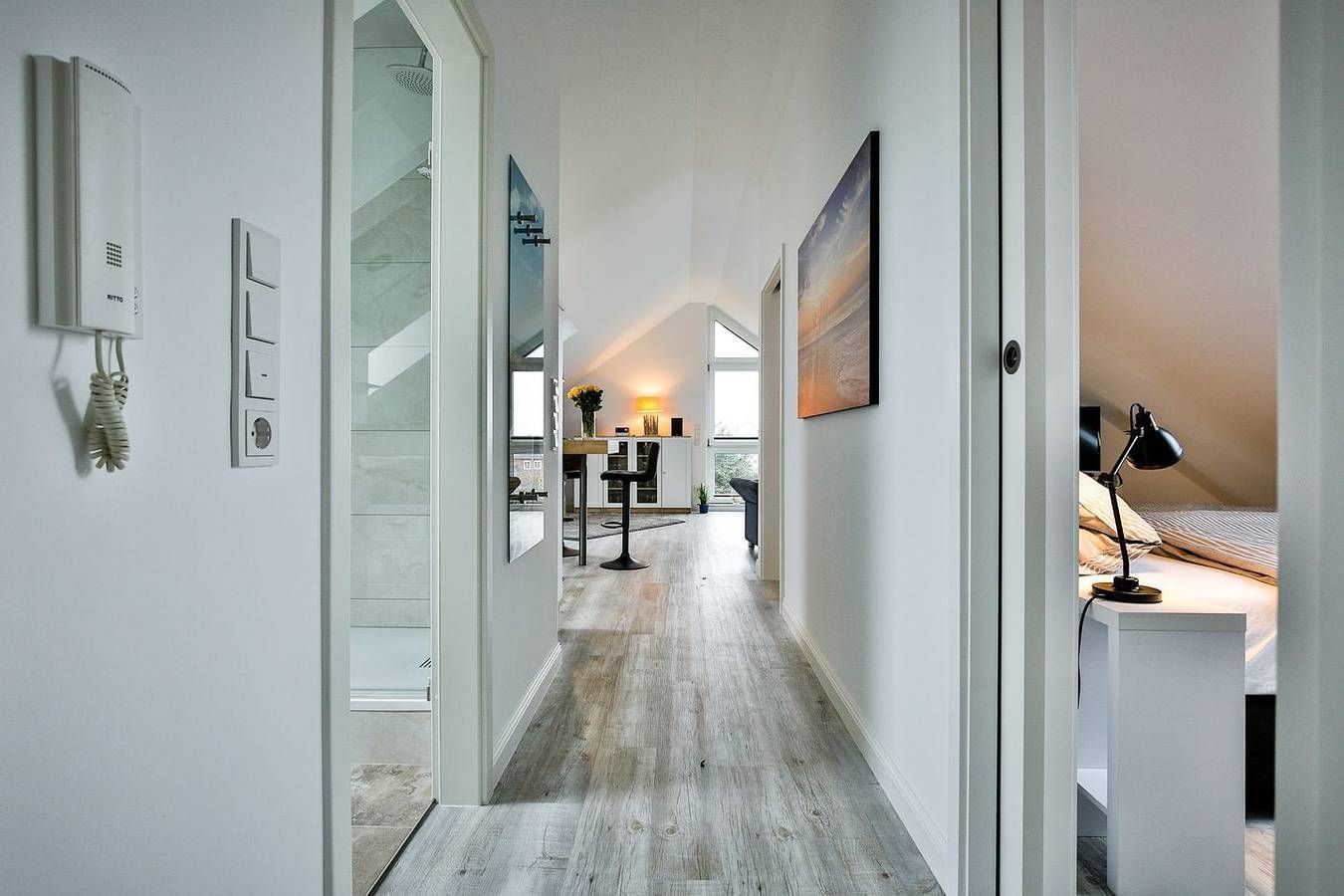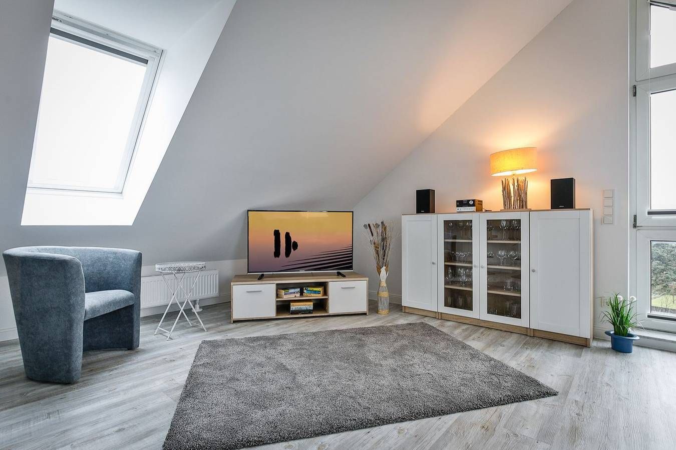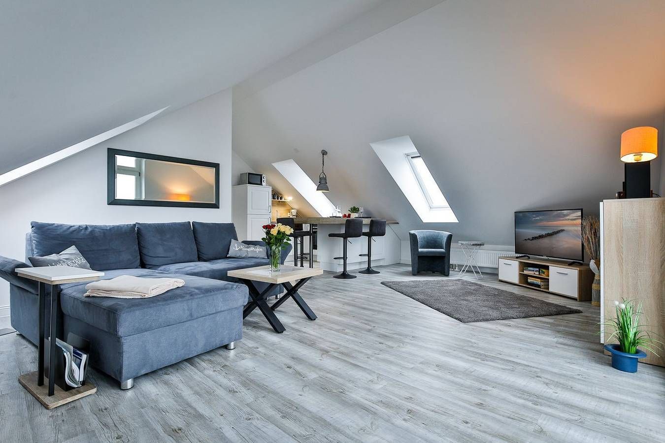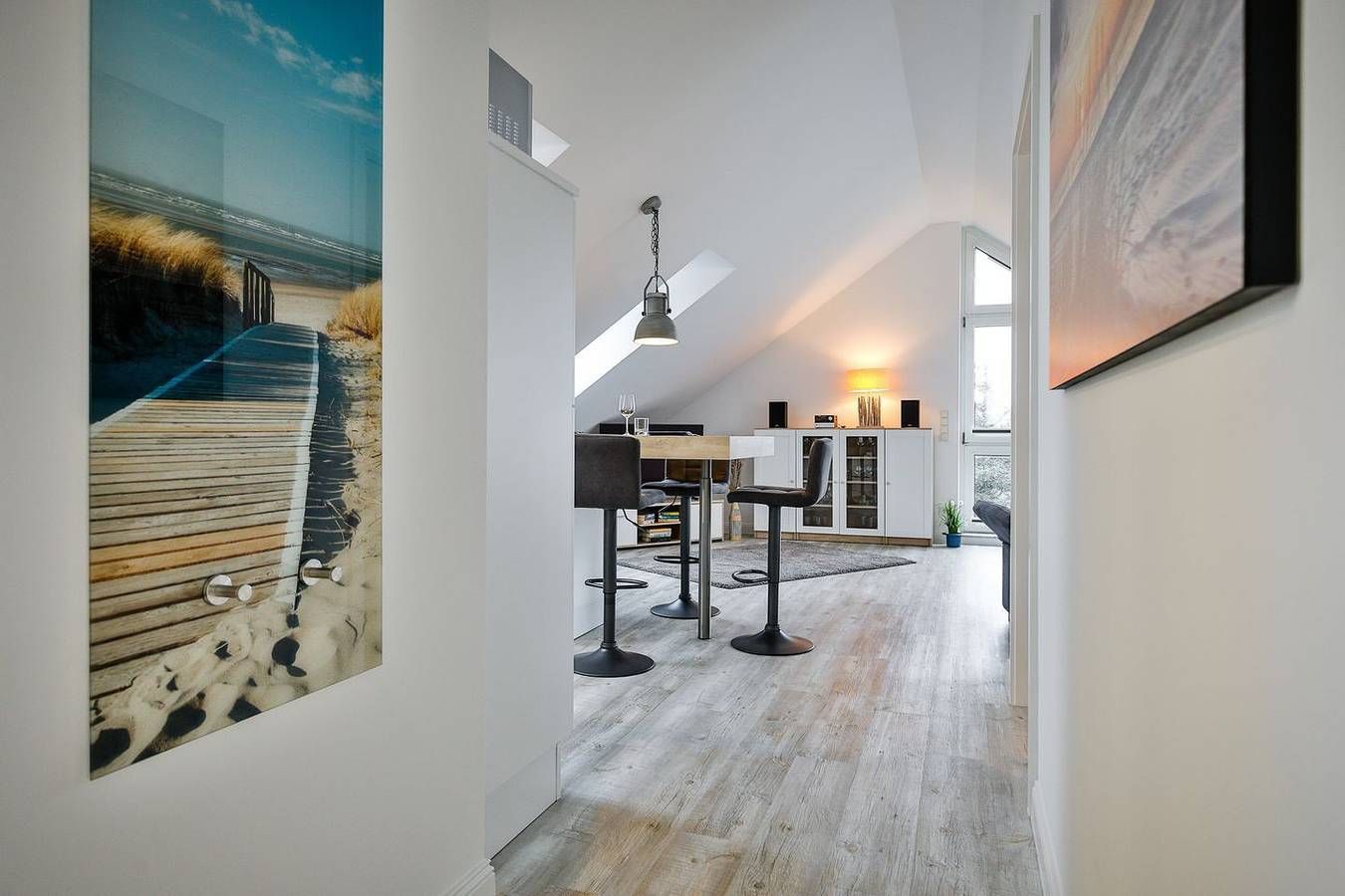 Willkommen in der modernen Ferienwohnung Inselkoje – einer stilvollen Dachgeschosswohnung für zwei Personen, die mit Komfort, heller Atmosphäre und ruhiger Lage überzeugt. Das Herzstück der Wohnung ist das große Panoramafenster, das den lichtdurchfluteten Wohnbereich in eine echte Wohlfühloase verwandelt. Freuen Sie sich auf eine geschmackvolle Einrichtung, eine offene, voll ausgestattete Küche und einen praktischen Hochtisch, der sich ideal für gemeinsame Mahlzeiten oder ein Glas Wein am Abend eignet. Der gemütliche Schlafbereich bietet hochwertige Einbauschränke, einen TV und ein komfortables Doppel-Boxspringbett für erholsame Nächte. Im modernen Tageslichtbad erwarten Sie eine großzügige Dusche, eine Handtuchheizung, ein praktischer Waschtrockner und ausreichend Abstellfläche. Die Inselkoje befindet sich im Berliner Ring in Hörnum – ruhig gelegen und dennoch zentral. In nur wenigen Gehminuten erreichen Sie den traumhaften Strand, den idyllischen Hörnumer Hafen sowie einladende Cafés und Restaurants. Auch Einkaufsmöglichkeiten befinden sich in direkter Nähe. Für zusätzlichen Komfort stehen Ihnen kostenfreies WLAN sowie ein eigener Parkplatz direkt an der Unterkunft zur Verfügung. Lassen Sie sich vom Charme der Inselkoje verzaubern und erleben Sie unvergessliche Tage auf Sylt!