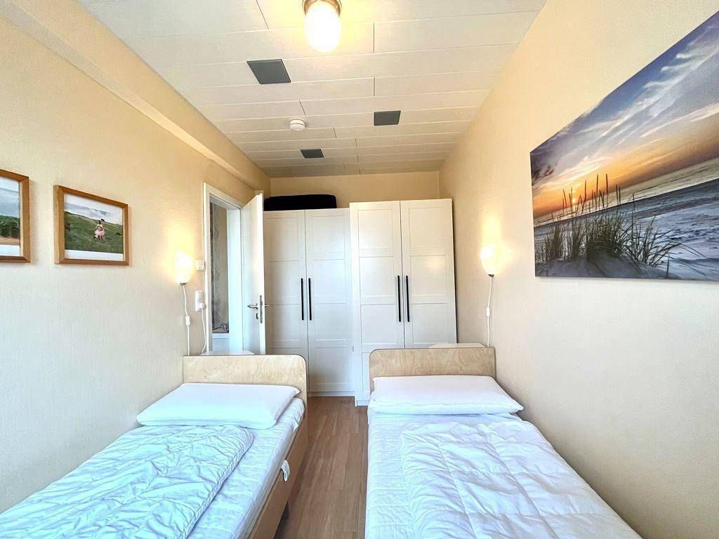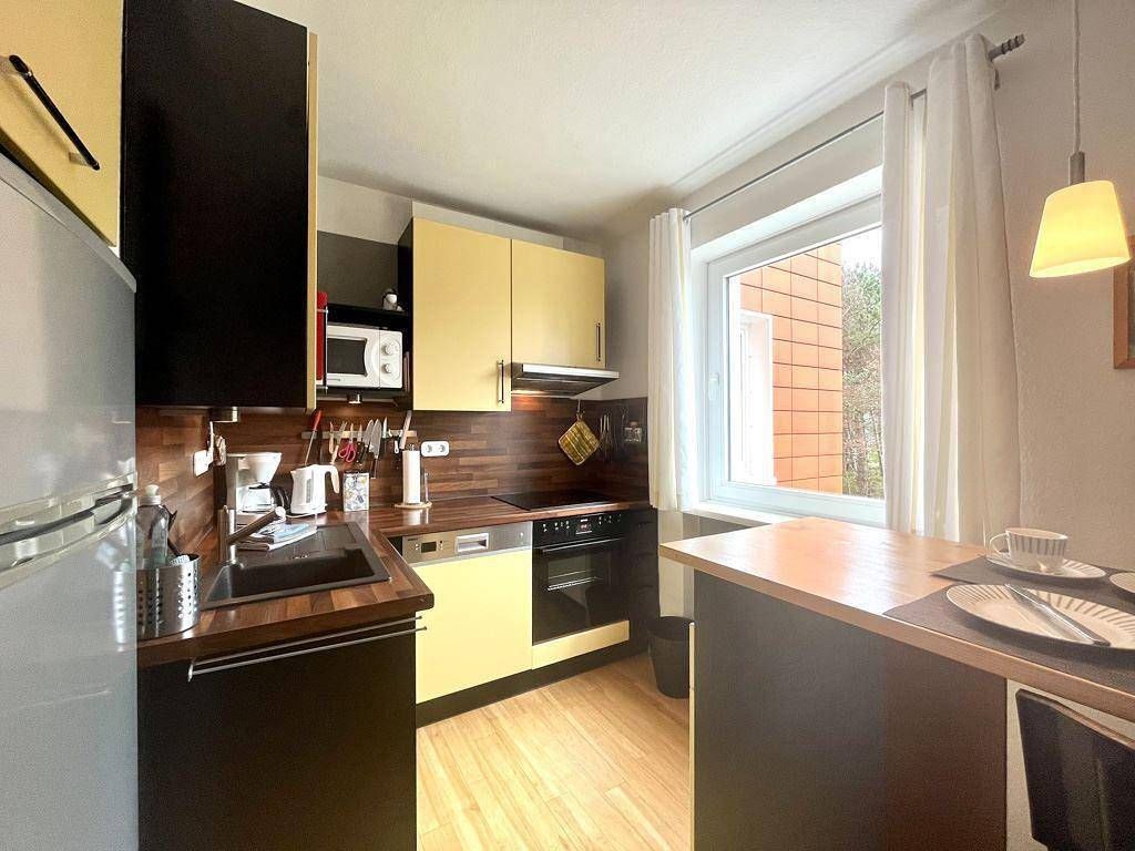Eine gemütliche 2-Zimmer-Wohnung in St. Peter Bad Die 2-Zimmer-Wohnung liegt im EG/Hochparterre u. ist über wenige Treppenstufen oder bequem mit dem Aufzug zu erreichen. Die Wohnung ist ca. 45qm groß u. für 2 Erwachsene u. 2 Kinder oder für 3 Erwachsene geeignet. Die Wohnung bietet einen kostenfreien Internetzugang via WLAN, Eingangsbereich mit Garderobe, Spiegel, Sitzbank. Wohn-Esszimmer mit Balkonzugang (Süd-West zum Meer), Sitzbereich mit Sofa & Relaxsessel, Couchtisch, Flachbildschirm LCD-TV, Radio, Essbereich mit Tisch u. 4 Stühlen, Kinderhochstuhl ist zu buchbar. Moderne Küche mit Fenster ausgestattet u.a. mit Kühlschrank (inkl. Gefrierfach), 4-Felder-Herd (Ceran), Backofen, Dunstabzug, Geschirrspülmaschine, Mikrowelle, Eierkocher, Toaster, Kaffeemaschine u. Wasserkocher, Bartisch mit 2 hohen Stühlen, Radio. Separates Schlafzimmer mit zwei Einzelbetten (je 80x200 cm) u. zwei Kleiderschränken. Das Sofa im Wohn-Esszimmer kann als Schlafsofa (Liegefläche 160x200cm) genutzt werden. Modernes Bad mit Dusche, WC, Heizung, Waschbecken, beleuchteter Spiegel, Föhn, Schränkchen u. Ablageflächen. Im Haus gibt es einen Waschraum mit Waschmaschine u. Trockner (Münzbetrieb) u. einen Tischtennisraum. Zugeordneter PKW-Stellplatz (Nr. 01). Zur Wohnung gehört ein möblierter Balkon in Blickrichtung Süd-West zum Meer. Im Haus gibt es einen Waschraum mit Waschmaschine u. Trockner (Münzbetrieb) u. einen Tischtennisraum. Für Ihr Auto gibt es einen zugeordneten PKW-Stellplatz (Nr. 01). Die Unterkunft befindet sich im Ortsteil St.Peter-Bad in einem Haus mit 8 Geschossen direkt inmitten eines Kiefernwaldes, direkt am Deich und am Ende der Kurpromenade. Von hier aus erreichen Sie zu Fuß oder mit dem Rad sowohl den Südstrand als auch das Kurzentrum St.Peter-Bad mit seiner Gastronomie, zahlreichen Geschäften und der Dünen-Therme. Bitte beachten Sie, dass eine eventuell anfallende Kurabgabe nicht im Gesamtpreis enthalten ist. Diese ist vor Ort zu leisten.