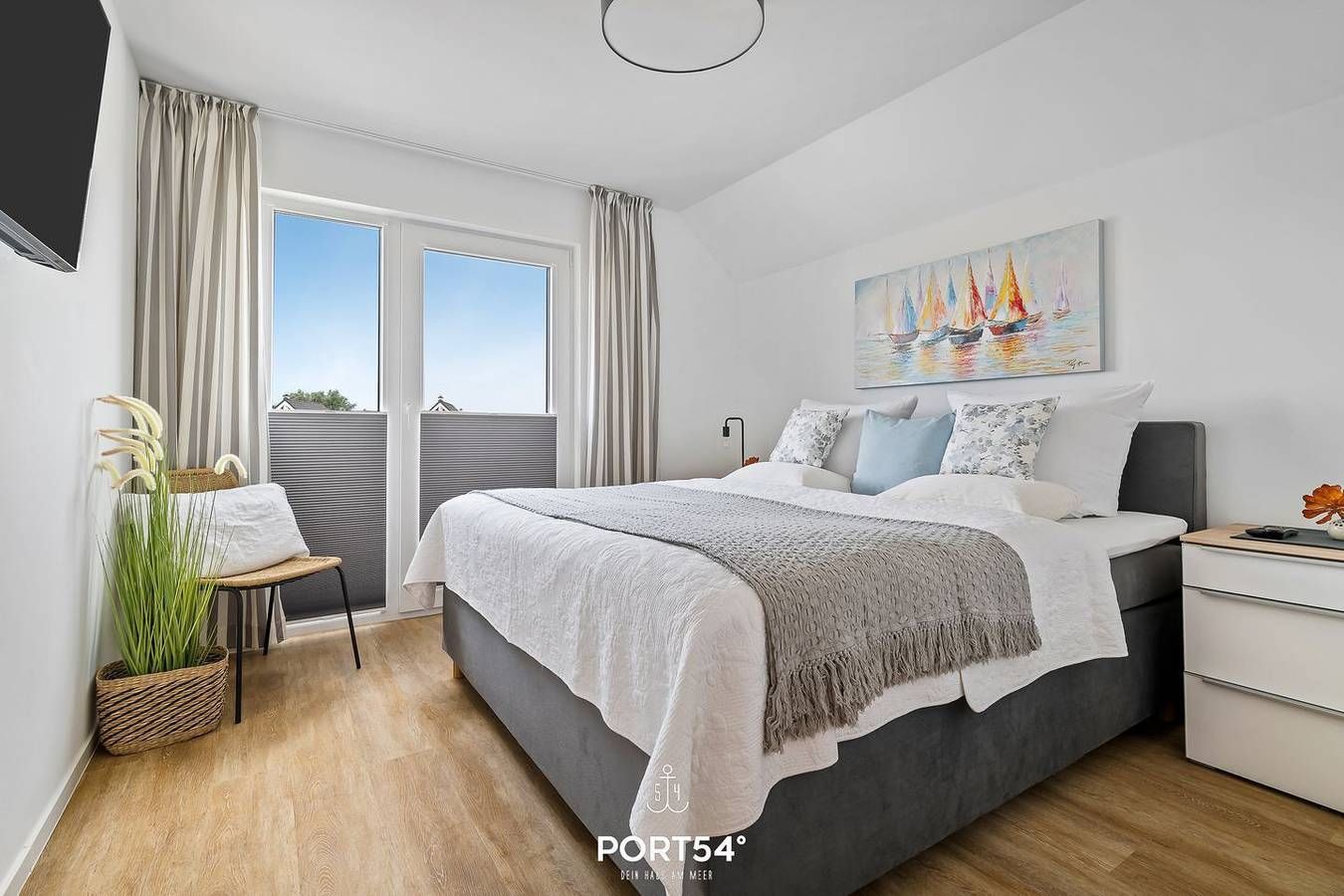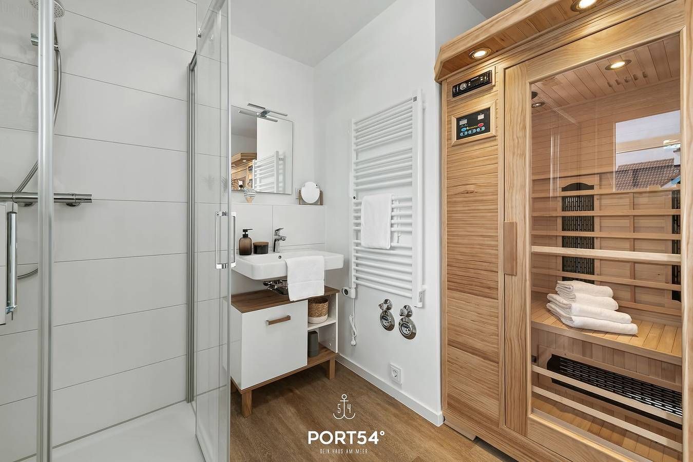 Herzlich Willkommen in der Ferienwohnung Karlsson in Büsum! Die Ferienwohnung für bis zu 5 Personen befindet sich im schönen NordseeResort, nur wenige Gehminuten zur Familienlagune „Perlebucht“. Bereits beim Betreten überzeugt die Wohnung mit seinem offenen, lichtdurchfluteten Wohnkonzept. Die beiden Schlafzimmer sind mit hochwertigen Boxspringbetten ausgestattet. Davon hat eins ein Doppelboxspringbett (180x200cm) und das andere Zimmer zwei Einzelboxspringbetten (90x200cm). In beiden Schlafräumen befinden sich Plissees mit Verdunkelungsmöglichkeit und Insektenschutz vor dem Fenster, ein Smart TV mit Magenta-TV, sowie Kleiderschrank mit Spiegel. Im modernen Tageslichtbad erwartet Sie eine bodengleiche Dusche mit Handtuchheizkörper und zur Entspannung steht Ihnen eine Infrarotsauna zur Verfügung. Der gemütliche und moderne Wohnbereich bietet ein Ecksofa mit Querschläferfunktion für einen zusätzlichen Gast (Liegefläche 193x123 cm), Smart TV mit Magenta TV und ein DAB Radio. Dort finden Sie auch eine kleine Auswahl an Büchern und einigen Gesellschaftsspielen. Ein Feuer im Kamin sorgt für zusätzliche Gemütlichkeit an kalten Tagen und lädt zu jeder Jahreszeit zu einem Nordseeurlaub ein. Die zum Wohnbereich offene Küche ist voll ausgestattet mit Waschmaschine, Geschirrspüler, Kaffeemaschine, Wasserkocher, Toaster und Mikrowelle. Für die kleinen Gäste ist ebenfalls gut gesorgt: Die Wohnung verfügt über einen Hochstuhl, ein Kleinkinderreisebett mit zusätzlicher Matratze, Spielzeug und Kindergeschirr. Vom Wohn- und Essbereich geht man direkt auf den schönen Balkon in Südlage, wo Sie Ihren Morgenkaffee genießen und an lauen Sommerabenden Köstlichkeiten auf dem Weber Elektrogrill zubereiten können. Dort finden Sie einen Strandkorb, einen großen Gartentisch mit 4 Gartensesseln und Hocker vor. Im Außenbereich befindet sich ein eigener PKW-Stellplatz direkt vor dem Haus. Mitgebrachte oder vor Ort ausgeliehene Fahrräder können im abschließbaren Fahrradschuppen untergestellt werden. Hier laden Sie dann auch die Akkus für Ihre E-Bikes auf. Ein 28-er Damenrad mit 21-Gangschaltung steht ihnen als "Brötchenrad" kostenlos zur Verfügung! Sollten Sie Ihren Nordseeurlaub mit der ganzen Familie und Freunden verbringen wollen, können wir Ihnen durch die Verwaltung mehrerer Objekte auch eine Symbiose aus 2 nebeneinander liegenden Ferienwohnungen ermöglichen. Die im Erdgeschoss gelegene Wohnung Nilsson bietet sich bei gleicher hochwertiger Ausstattung hier an.