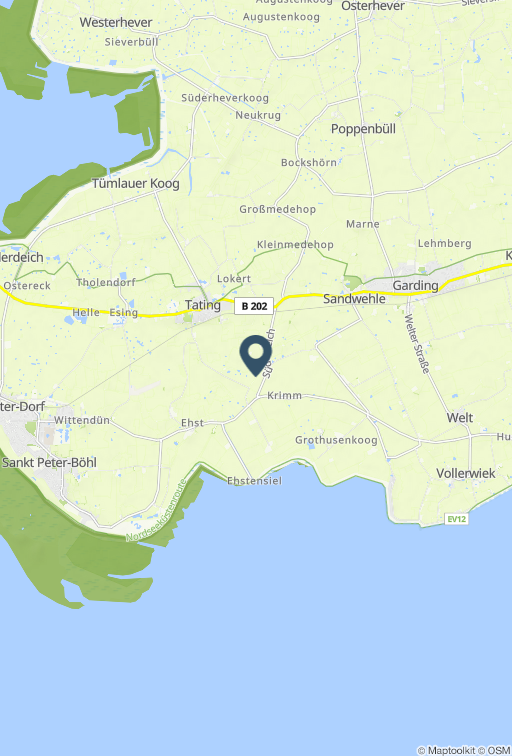 Reetgedeckes Friesenhaus in ländlich idyllischer Lage, ca. 6 km vor St. Peter-Ording und 3,5 km südlich von Tating. Das Haus liegt auf einer Warft am Ende einer Sackgasse (kein Durchgangsverkehr) inmitten von Wiesen. Neben der...