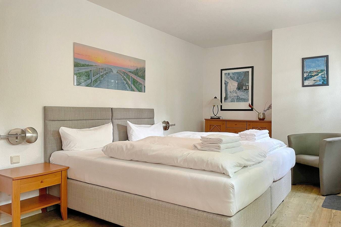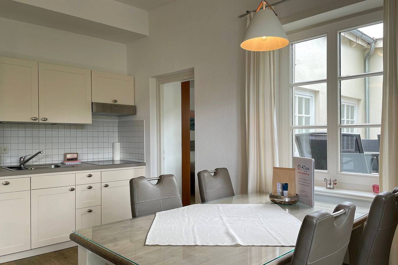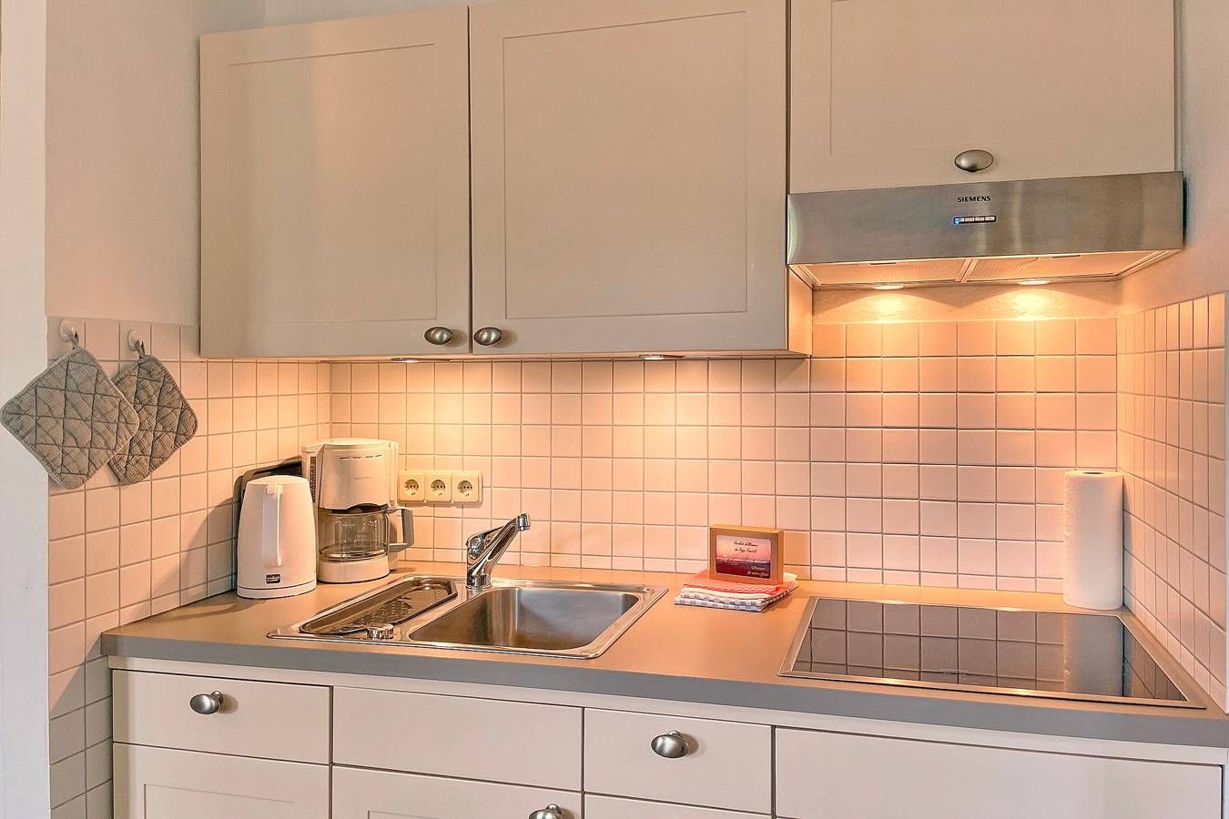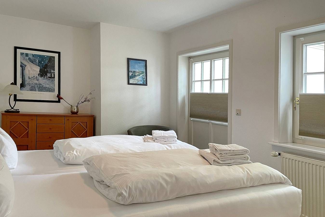 Das Galeriehaus in der Badestraße in Wyk ist ein historisches Föhrer Gebäude, welches von außen immer noch den einstigen Charme ausstrahlt, doch die vier schicken Wohnungen im Galeriehaus sind modern und bieten herrliche Urlaubsdomizil für 2 Personen in zentraler Lage an. Das Galeriehaus ist ein historisches Gebäude von Wyk, welches außen immer noch den einstigen Charme von vergangenen Zeiten aufweist, doch innerhalb der Fassade umgebaut und renoviert wurde. Jetzt befinden sich im Galeriehaus 4 Wohnungen für je 2 Personen. Die zentrale Lage zur Innenstadt, dem Strand und der Nordsee, dem Meerwasserwellenbad Aqua Föhr und zu den Einkaufläden machen unsere Wohnungen im Galeriehaus sehr beliebt. Schon beim Betreten der Obergeschoßwohnung Van Gogh fühlt man sich herzlich Willkommen. Die offen gestaltete Wohnung wurde liebevoll eingerichtet und die Dekoration wie auch die Möbel wurden harmonisch aufeinander abgestimmt. Der Wohnbereich in braunen und weißen Tönen gehalten wird mit dem roten Teppich als Farbakzent abgerundet und lädt mit Flachbild-TV, Stereoanlage sowie einer gemütlichen Sitzgruppe zum Verweilen ein. Hier integriert ist auch die Küchenzeile, welche funktional mit Ceranfeldherd, Kühlschrank mit Gefrierfach, Geschirrspüler, Kaffeemaschine und Wasserkocher ausgestattet wurde. Das Tageslichtbad mit Dusche, Handtuchheizkörper und Schminkspiegel ist klein und fein. Schöne Träume genießen Sie im Schlafzimmer, welches mit Boxspringbett, Kommode, dreitürigem Kleiderschrank und ausgesuchten Accessoires behaglich wirkt. Entspannen Sie bei herrlichen Urlaubstagen in dieser liebevoll eingerichteten Wohnung. Bei Auswahl eines Kinderreisebetts wird dieses anstelle eines normalen Bettes bezogen. Sollten Sie das Kinderreisebett zusätzlich benötigen, buchen Sie bitte ein weiteres Wäschepaket hinzu, da wir nur bezogene Kinderreisebetten verleihen. ---------------------------------------- 2025: Infos zum Wäschepaket (obligatorisch): Unser Wäschepaket besteht aus der bezogenen Bettwäsche, 1 Duschtuch, 2 Handtüchern, 1 Geschirrtuch und einem Badvorleger und gehört obligatorisch zur Buchung dazu. Ab 21 Übernachtungen bieten wir auf Wunsch einen kostenfreien Wäschewechsel an. Zusätzlich können Handtücher und Duschtücher optional nach Bedarf einzeln hinzugebucht werden. Ab 2026 mehr Flexibilität und Individualität: Das bekannte Wäschepaket ist nicht mehr buchbar. Die Bettwäsche bleibt aus hygienischen Ansprüchen eine obligatorische Serviceleistung. Sie finden die Betten weiterhin bezogen vor. Doch Hand- und Duschtücher können Sie künftig entweder selbst mitbringen oder auf eigenen Wunsch einzeln optional hinzubuchen. Diese Variante ist aus betrieblichen Gründen erst für Buchungen in 2026 buchbar und entspricht dem Gästewunsch laut Umfrage nach mehr Flexibilität, Individualität und Nachhaltigkeit! Infos zum Präsentkorb Föhrer Inselkäse für 2 oder 4 Personen (Inhalte nicht austauschbar) Der Föhrer Präsentkorb für 4 Personen enthält: 200g Föhrer Naturkäse, 200g roten Föhrer Fruchtaufstrich, 430g Alkersumer Gemüsetopf, 6 Stangen (ca. 160g) Wattwürmer, 150g Landleberwurst , 125ml Föhrer Chutney und 0,33l Föhrer Biar. Der Föhrer Präsentkorb für 2 Personen enthält: 200g Föhrer Bärlauch-Käse, 200g Föhrer Fruchtaufstrich Apfel-Zimt, 430g vegane Linsenbolognese und ca. 130g mildem Landschinken vom Schwein.