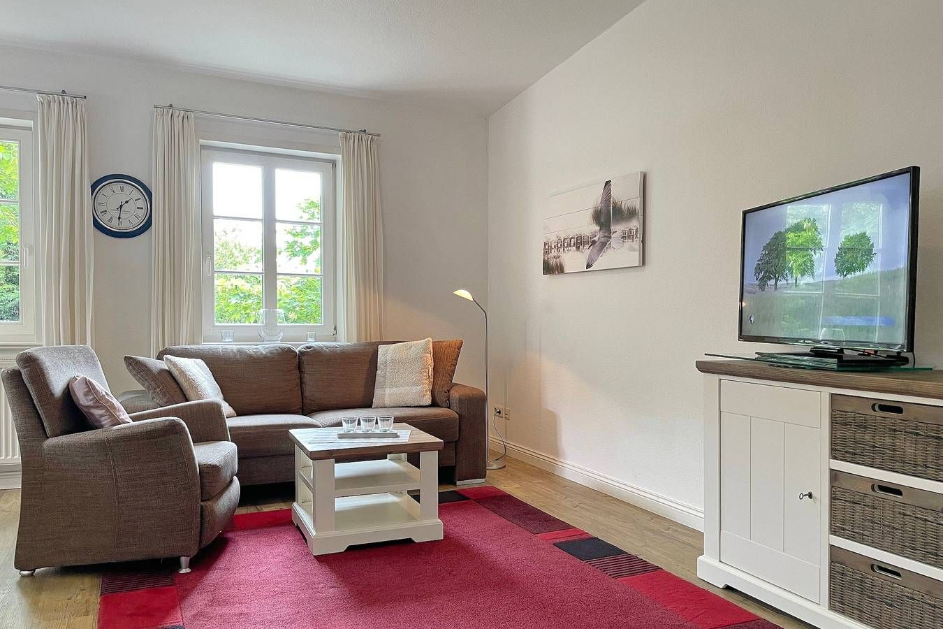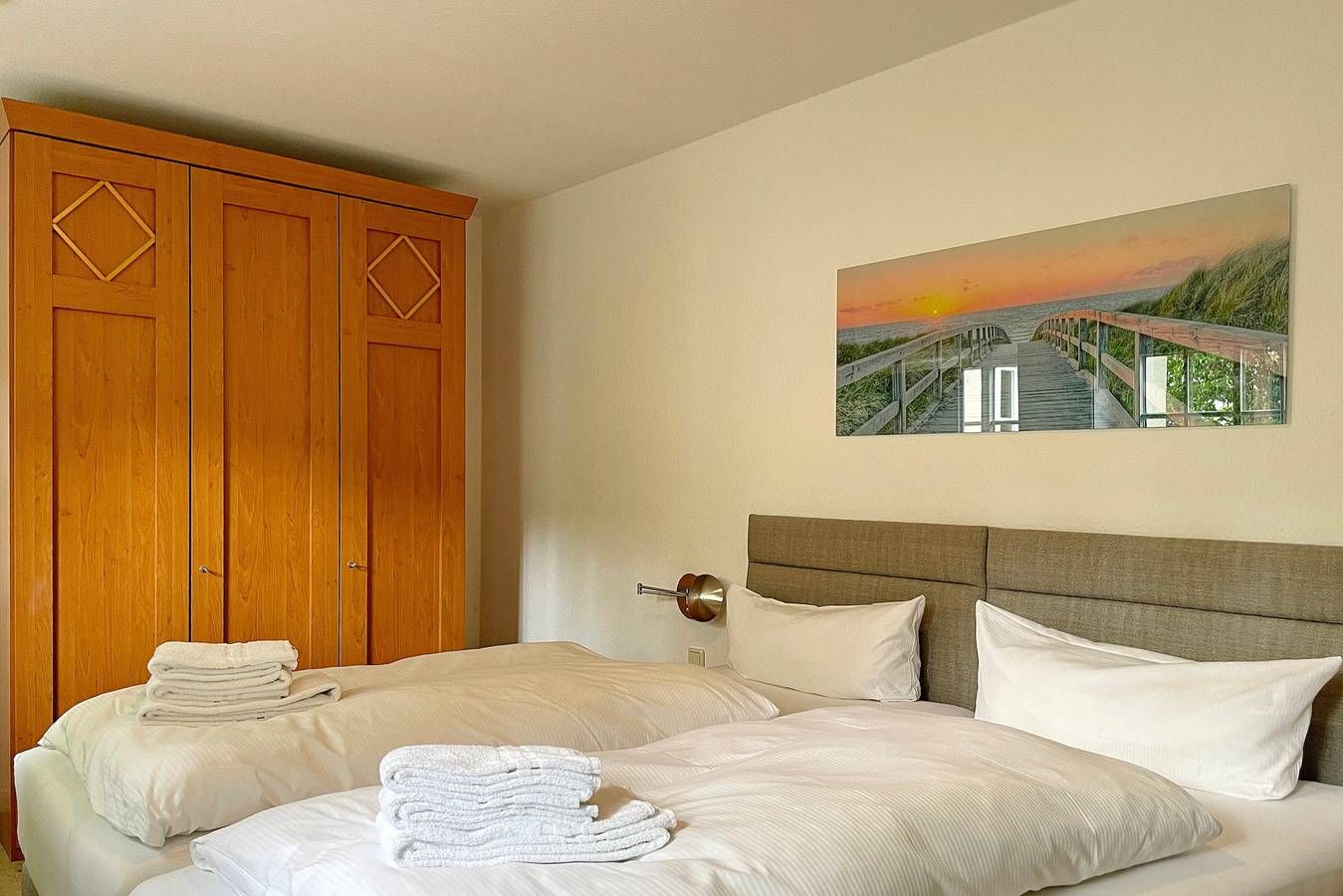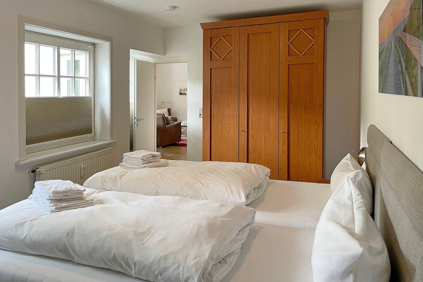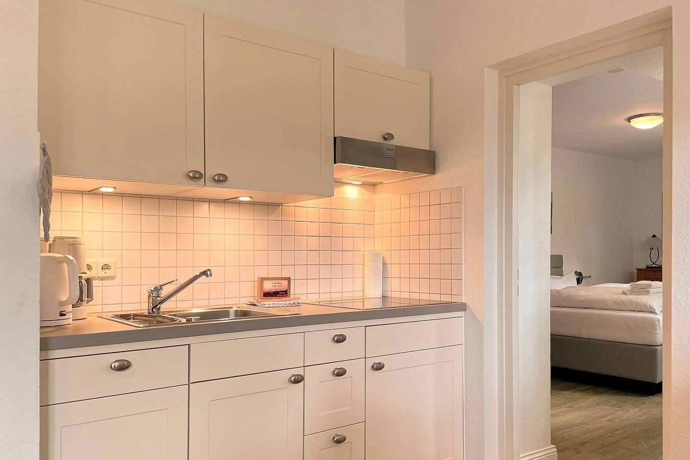 Das Galeriehaus in der Badestraße in Wyk ist ein historisches Föhrer Gebäude, welches von außen immer noch den einstigen Charme ausstrahlt, doch die vier schicken Wohnungen im Galeriehaus sind modern und bieten herrliche Urlaubsdomizil für 2 Personen in zentraler Lage an. Das Galeriehaus ist ein historisches Gebäude von Wyk, welches außen immer noch den einstigen Charme von vergangenen Zeiten aufweist, doch innerhalb der Fassade umgebaut und renoviert wurde. Jetzt befinden sich im Galeriehaus 4 Wohnungen für je 2 Personen. Die zentrale Lage zur Innenstadt, dem Strand und der Nordsee, dem Meerwasserwellenbad Aqua Föhr und zu den Einkaufläden machen unsere Wohnungen im Galeriehaus sehr beliebt. Schon beim Betreten der Obergeschoßwohnung Van Gogh fühlt man sich herzlich Willkommen. Die offen gestaltete Wohnung wurde liebevoll eingerichtet und die Dekoration wie auch die Möbel wurden harmonisch aufeinander abgestimmt. Der Wohnbereich in braunen und weißen Tönen gehalten wird mit dem roten Teppich als Farbakzent abgerundet und lädt mit Flachbild-TV, Stereoanlage sowie einer gemütlichen Sitzgruppe zum Verweilen ein. Hier integriert ist auch die Küchenzeile, welche funktional mit Ceranfeldherd, Kühlschrank mit Gefrierfach, Geschirrspüler, Kaffeemaschine und Wasserkocher ausgestattet wurde. Das Tageslichtbad mit Dusche, Handtuchheizkörper und Schminkspiegel ist klein und fein. Schöne Träume genießen Sie im Schlafzimmer, welches mit Boxspringbett, Kommode, dreitürigem Kleiderschrank und ausgesuchten Accessoires behaglich wirkt. Entspannen Sie bei herrlichen Urlaubstagen in dieser liebevoll eingerichteten Wohnung. Bei Auswahl eines Kinderreisebetts wird dieses anstelle eines normalen Bettes bezogen. Sollten Sie das Kinderreisebett zusätzlich benötigen, buchen Sie bitte ein weiteres Wäschepaket hinzu, da wir nur bezogene Kinderreisebetten verleihen. ---------------------------------------- 2025: Infos zum Wäschepaket (obligatorisch): Unser Wäschepaket besteht aus der bezogenen Bettwäsche, 1 Duschtuch, 2 Handtüchern, 1 Geschirrtuch und einem Badvorleger und gehört obligatorisch zur Buchung dazu. Ab 21 Übernachtungen bieten wir auf Wunsch einen kostenfreien Wäschewechsel an. Zusätzlich können Handtücher und Duschtücher optional nach Bedarf einzeln hinzugebucht werden. Ab 2026 mehr Flexibilität und Individualität: Das bekannte Wäschepaket ist nicht mehr buchbar. Die Bettwäsche bleibt aus hygienischen Ansprüchen eine obligatorische Serviceleistung. Sie finden die Betten weiterhin bezogen vor. Doch Hand- und Duschtücher können Sie künftig entweder selbst mitbringen oder auf eigenen Wunsch einzeln optional hinzubuchen. Diese Variante ist aus betrieblichen Gründen erst für Buchungen in 2026 buchbar und entspricht dem Gästewunsch laut Umfrage nach mehr Flexibilität, Individualität und Nachhaltigkeit! Infos zum Präsentkorb Föhrer Inselkäse für 2 oder 4 Personen (Inhalte nicht austauschbar) Der Föhrer Präsentkorb für 4 Personen enthält: 200g Föhrer Naturkäse, 200g roten Föhrer Fruchtaufstrich, 430g Alkersumer Gemüsetopf, 6 Stangen (ca. 160g) Wattwürmer, 150g Landleberwurst , 125ml Föhrer Chutney und 0,33l Föhrer Biar. Der Föhrer Präsentkorb für 2 Personen enthält: 200g Föhrer Bärlauch-Käse, 200g Föhrer Fruchtaufstrich Apfel-Zimt, 430g vegane Linsenbolognese und ca. 130g mildem Landschinken vom Schwein.
