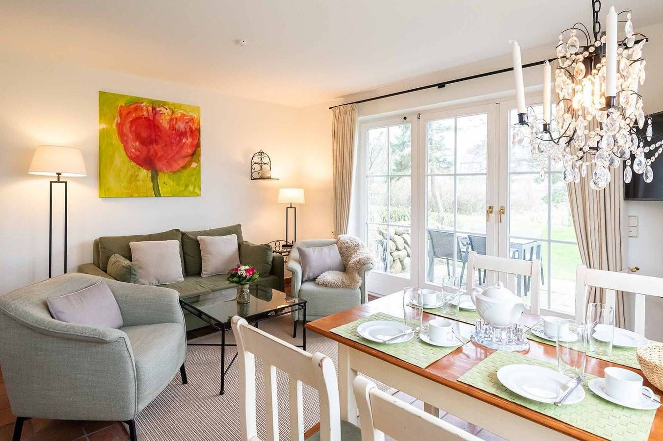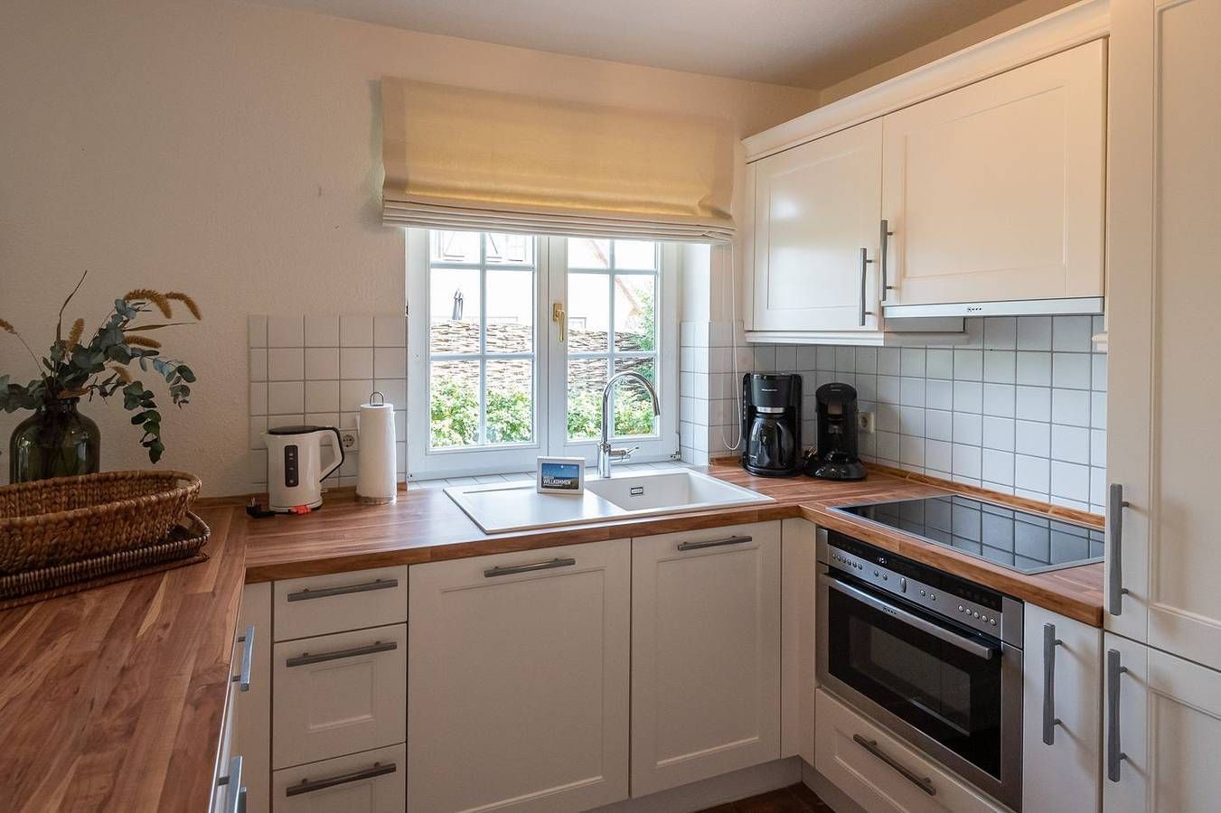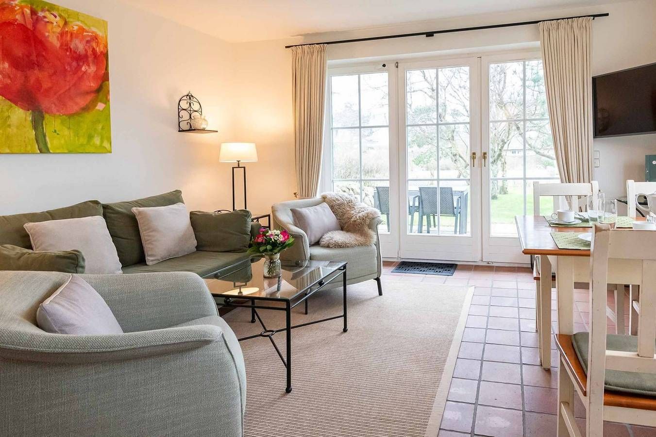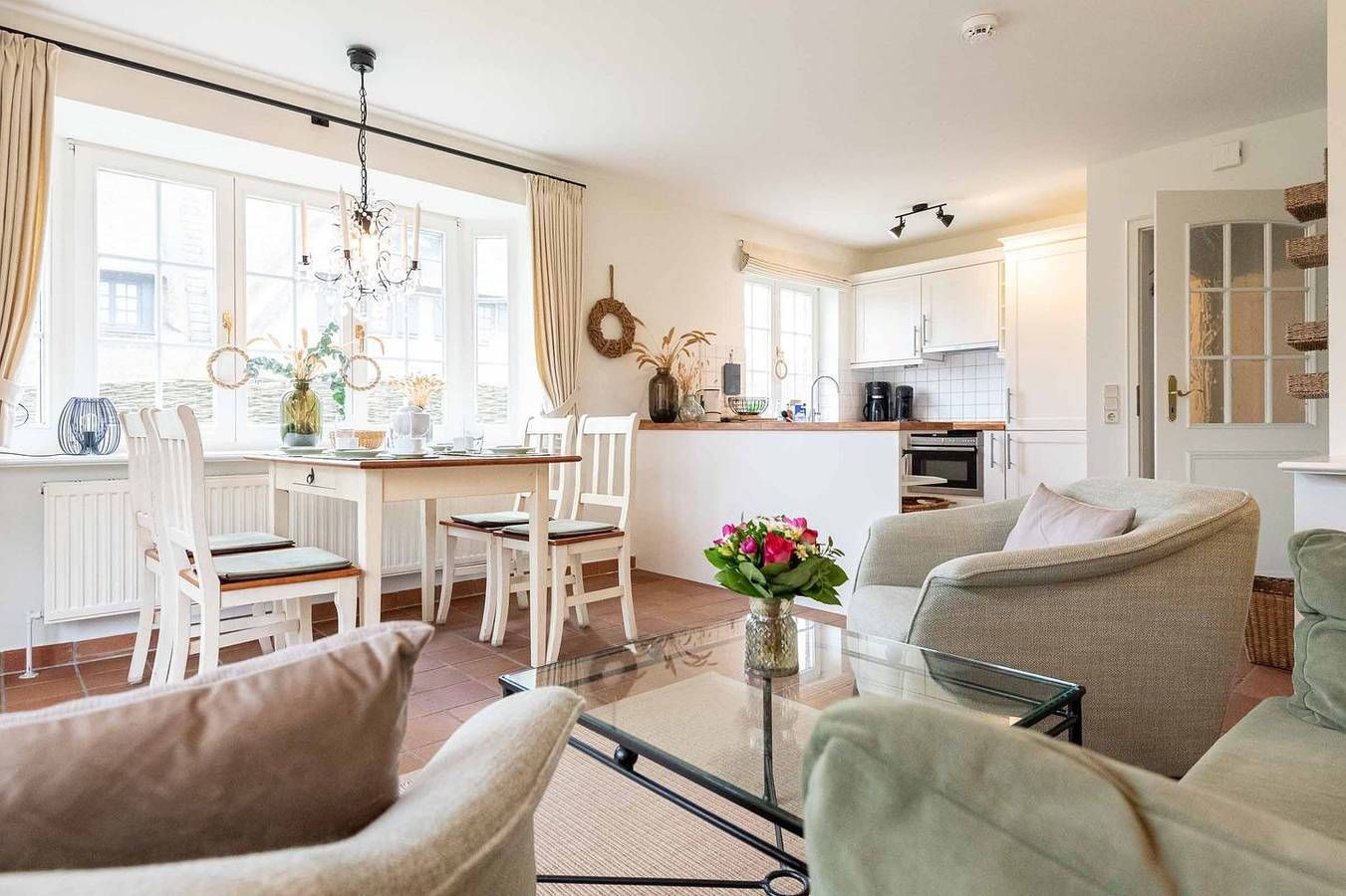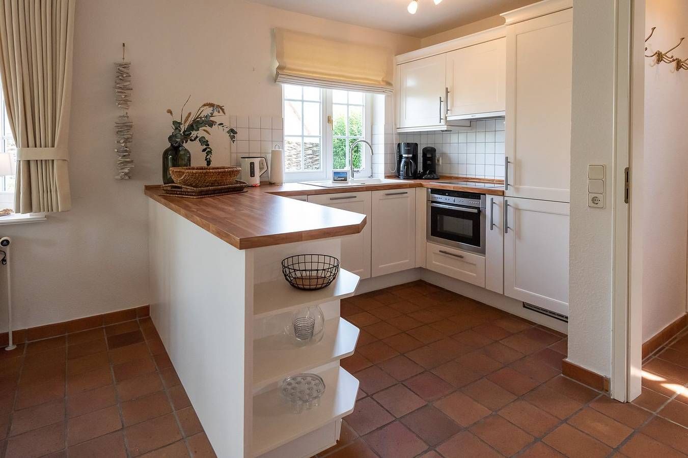 Gemütliche Ferienwohnung mit 3 Zimmern auf ca. 76 m², für max. 4 Personen. Hier erwartet Sie ein helles und geschmackvoll im Landhausstil eingerichtetes Feriendomizil in Wenningstedt mit einer gemütlichen Wohnatmosphäre über zwei Ebenen. Im lichtdurchfluteten Erdgeschoss befindet sich der Wohn-/Koch-/Essbereich: Großzügiger Wohnraum mit einer gemütlichen Sofaecke und Blick in den Garten. Der Essbereich lädt zu geselligen Mahlzeiten ein. Die offene und moderne Küche mit Fenster ist sehr gut ausgestattet. Von diesem Raum aus gelangen Sie auf die saisonal möblierte West-Terrasse und in den schönen, eingewachsenen Garten. Gäste-WC: mit Fenster befindet sich ebenfalls im Erdgeschoss und ist vom Flur zu erreichen. Eine gut begehbare Treppe mit Treppengeländer führt in das Untergeschoss: Schlafzimmer 1: Doppelbett, Kleiderschrank, TV und Fenster. Schlafzimmer 2: 2 Einzelbetten, begehbarer Kleiderschrank, TV und Fenster. Badezimmer: Helles Bad mit Dusche, WC und Fenster. Lage: Diese Ferienwohnung im "Landhaus Köövenhüs" liegt zentral und strandnah in Wenningstedt. Diverse Restaurants und Einkaufsmöglichkeiten befinden sich in naher Umgebung und sind zu Fuß oder mit dem Fahrrad gut erreichbar. Haustiere: Nein Nichtraucherhaus Parkplatz: Ja