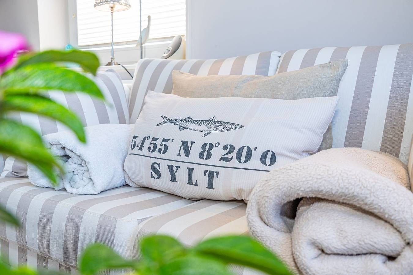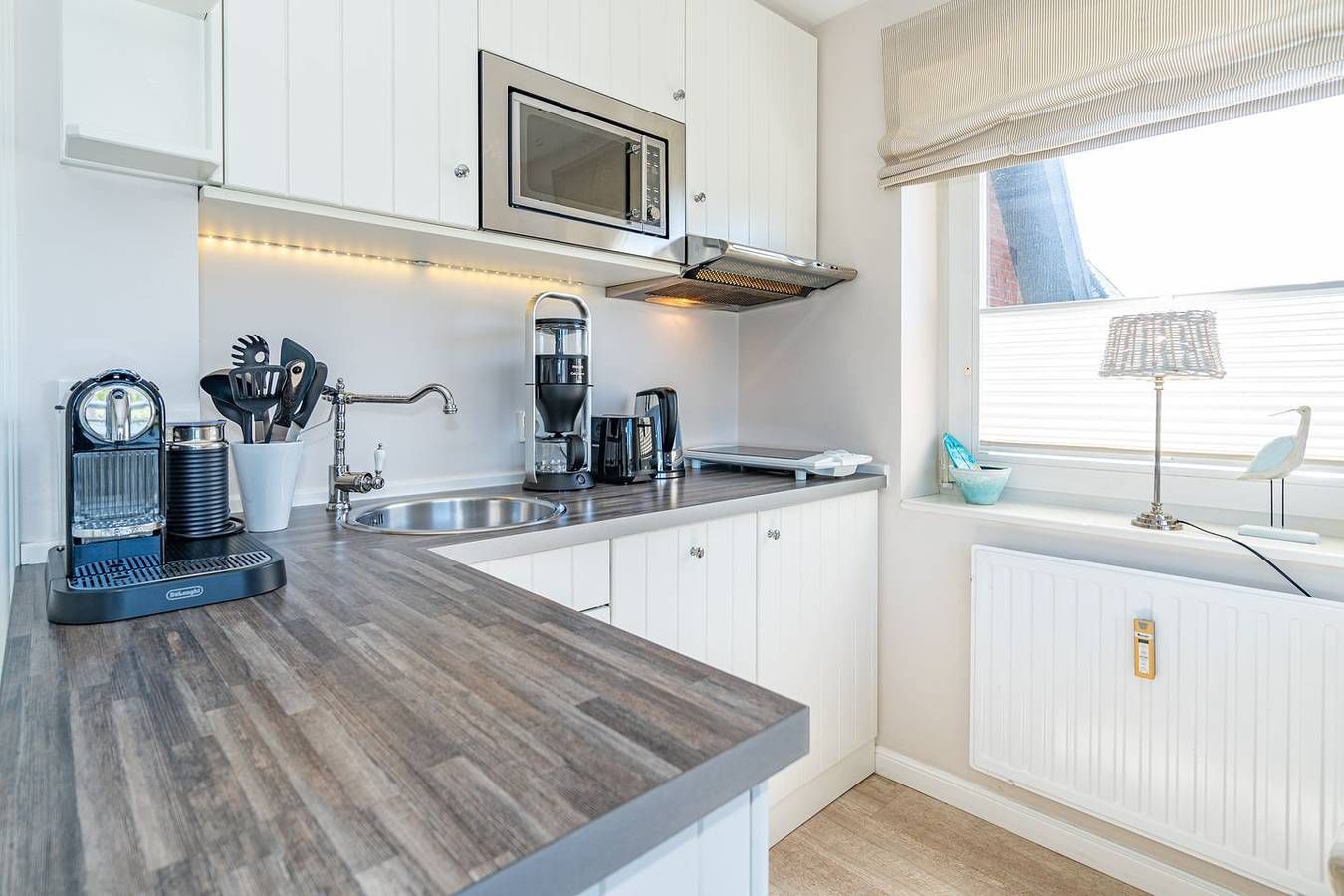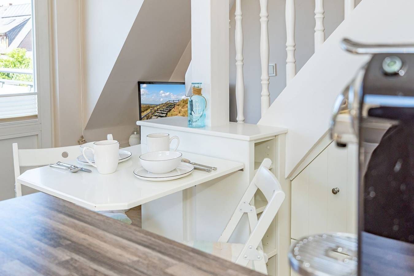Diese helle an den Dünen liegende Ferienwohnung verteilt sich über zwei Ebenen und liegt strand- und stadtnah in Westerland. Nach Eintritt in die Ferienwohnung präsentiert sich die offene Küche (Geschirrspüler, 2-Platten...