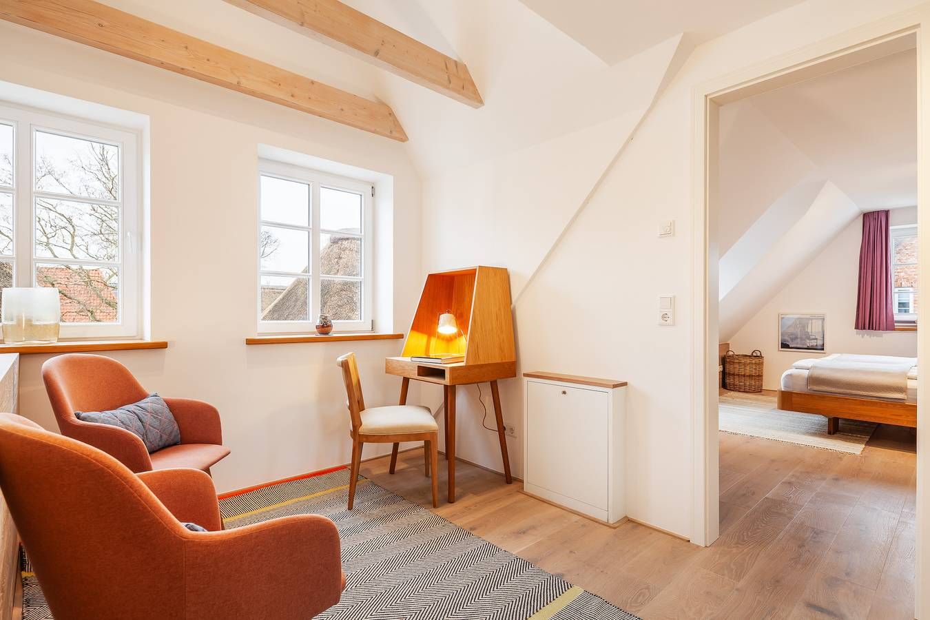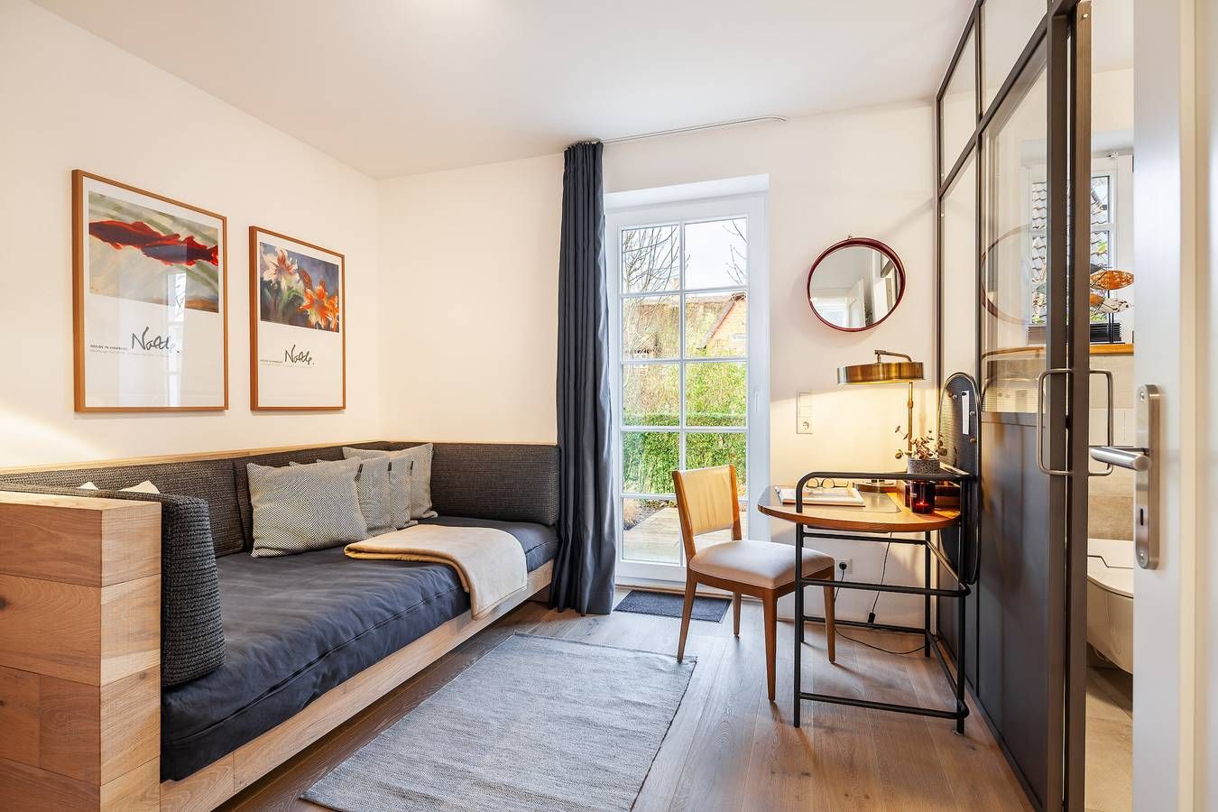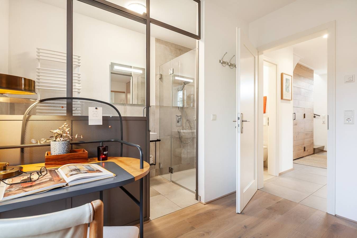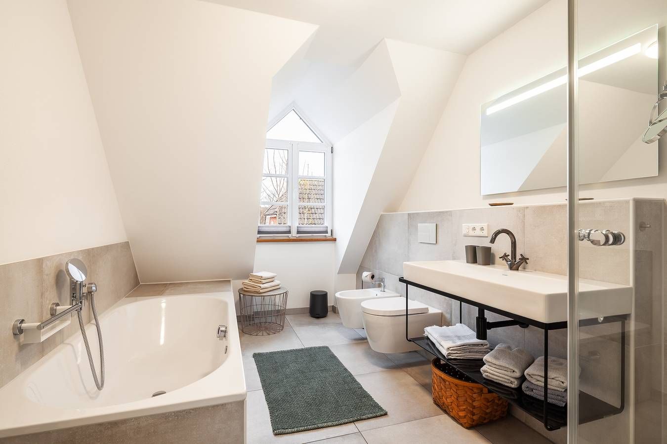 Ein besonderes Hausteil mit eigenem Eingang in ruhiger Lage erwartet Sie. Eichenparkett, hochwertiges Mobiliar, Holzelemente und Betonoptik bilden einen harmonischen Einklang. Im Erdgeschoss befinden sich der große Wohnbereich mit Zugang zur Terrasse, eine offene Küche mit Essbereich, ein Schlafzimmer/ Rückzugsort mit Dusche en suite sowie eine Gästetoilette. Über die Rohbetontreppe gelangen Sie in das Obergeschoss. Eine offene Galerie mit Schreibtisch, zwei Doppelschlafzimmer mit Fernseher und ein Bad mit Wanne und Dusche erwarten Sie hier. Der eingewachsenen Garten mit Mobiliar sowie ein Parkplatz und ein Schuppen stehen für Sie zur Nutzung bereit. In der Gartenhütte sind zwei Fahrräder und ein Bollerwagen zur freien Nutzung untergebracht.