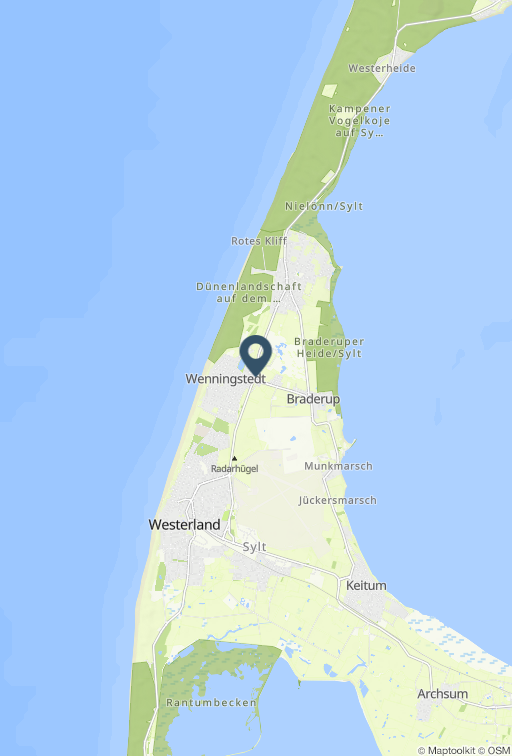 Die „große Künstlerdeele“ liegt in bester Anbindung zum Weststrand in Wenningstedt, als auch zur Wattenmeer geprägten Ostküste. Westerland und auch Kampen sind bequem mit dem Fahrrad oder per Spaziergang zu erreichen. Direkte Einkaufsmöglichkeiten gibt es gleich gegenüber beim Feinkost Meyer oder zu Fuß in wenigen Minuten im Herzen von Wenningstedt. Die Wohnung besticht durch Ihre liebevolle und detailgetreue Ausstattung. Eine kleine Terrasse lädt bei Sonnenschein zum Frühstücken unter freiem Himmel ein. In den kühleren Monaten sorgt ein separater Sauna- / Erholungsraum für Wärme. Ausstattung stilvoller Wohnraum mit liebevollen Details und ausgewählten Designerstücken (TV, CD, W-LAN) und angrenzenden Essplatz offene gestaltete Küche (GS, Mikrowelle) mit ausgewähltem Geschirr, Gläsern und Küchenutensilien 2 Schlafzimmer mit je einem Doppelbett helles, freundliches Bad mit Duschwanne und WC zusätzliches Bad mit Dusche und WC Terrassensitzplatz Sauna im Haus Waschmaschine / Trockner im Haus PKW-Stellplatz