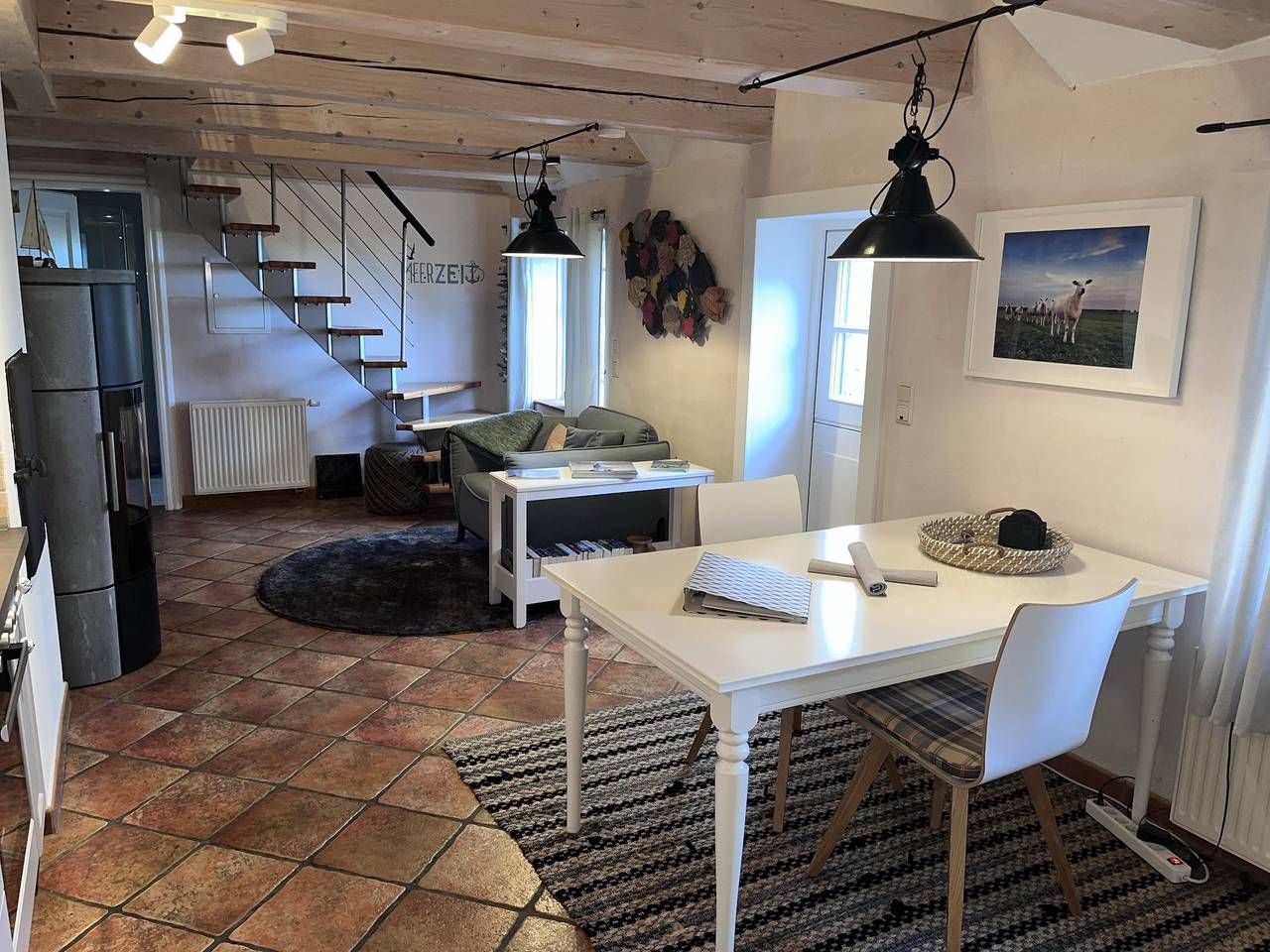 Der 25 m² große Wohn-/Essbereich im Erdgeschoss ist großzügig, modern und behaglich mit einer komplett ausgestatteten Wohnküche, einem schönen Essplatz für zwei Personen und dem lichtdurchfluteten Wohnzimmer konzipiert.. Genießen Sie vom Esstisch durch die Fenster oder die typische Klöntür den Blick in den Garten, über Felder und Wiesen bis zum Deich. Das 10qm grosse Bad ist als Wellnessbereich ausgelegt, bietet viel Platz und eine bodengleiche, große Dusche. Das Schlafzimmer mit grossem Bett und Kleiderschrank runden das Erdgeschoss ab. Im Obergeschoss erwartet Sie in unserer offenen Galerie am einen Ende ein separater Wohn-/TV-Bereich mit gemütlichen, hochwertigen Sesseln im skandinvisch-friesischen Stil. Zusätzlich finden Sie im Ruhe-/ Bibliotheksbereich eine schöne Recamiere zum erholen und auspannen...