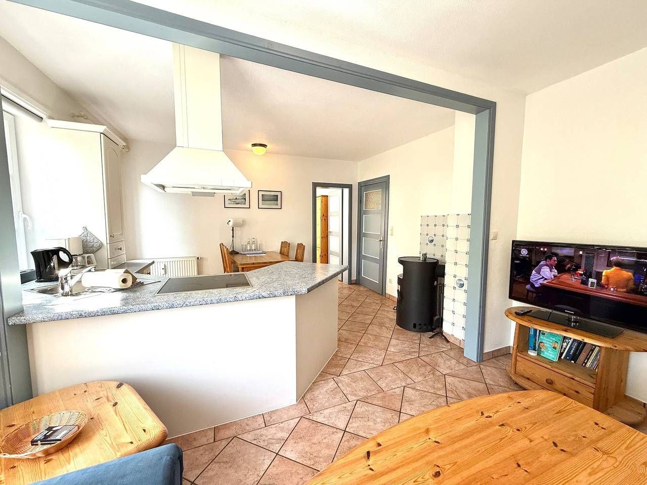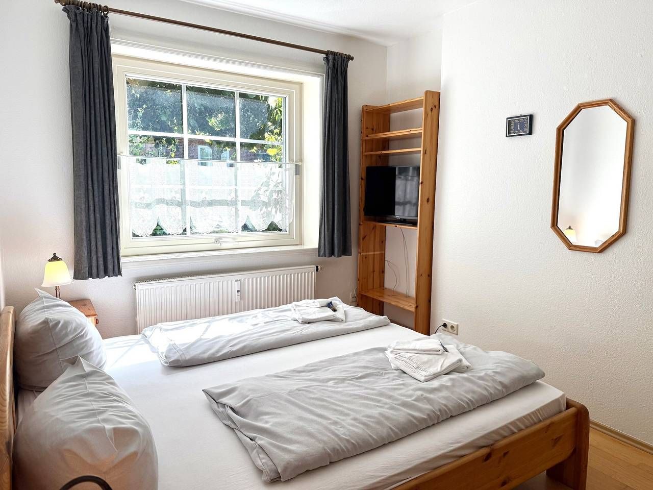 3 - Zimmer-Wohnung "Haus 94 , Oldsum" Im idyllischen Inseldorf Oldsum finden Sie unsere komfortabel eingerichtete Ferienwohnung in einem typischen Föhrer Ferienhaus. In dem von Reethäusern geprägten Friesendorf finden Sie zwei kleine Cafés mit Lädchen, ein Restaurant, Ateliers und kleine Galerien. Ein Edeka-Markt versorgt das Dorf weiterhin ganzjährig, ein Bäckerei-Verkauf im Sommer. Die Wohnung liegt im Erdgeschoss des Hauses mit eigener Terrasse und Sitzgelegenheiten zum Entspannen und Verweilen. Die Ferienwohnung ist für bis zu 4 Personen ausgestattet: Es erwarten Sie eine freundliche und helle Einrichtung im Wohnzimmer, sowie zwei Schlafzimmer. Der Wohnraum ist mit einem nordischen Kaminofen ausgestattet. Außerdem bietet Ihnen diese Wohnung zwei gepflegte Duschbäder. Nutzen Sie den schönen Garten zur Ruhe und Entspannung. Seit 2015 können Sie kostenfrei das WLAN Netz nutzen. Ein Pkw-Stellplatz kann direkt hinter dem Haus genutzt werden. Gerne können Sie kostenpflichtig ein Wäschepaket pro Person optional dazu buchen. Bitte geben Sie uns diesbzgl. schnellstmöglich eine kurze Info. Im größeren Schlafzimmer ist ein zweiter SAT-Fernseher.