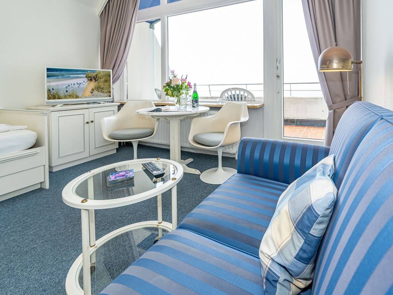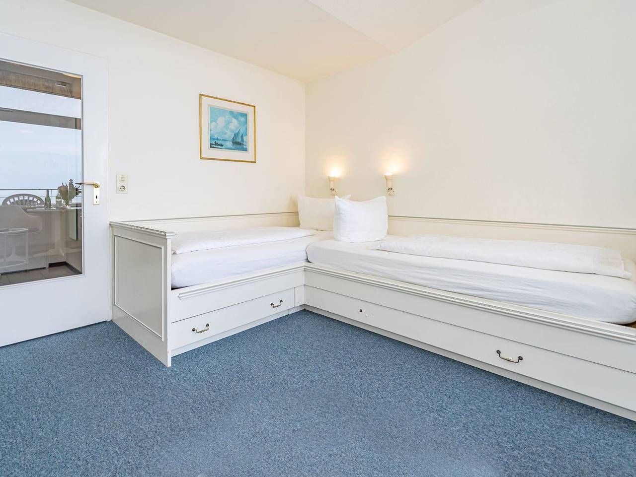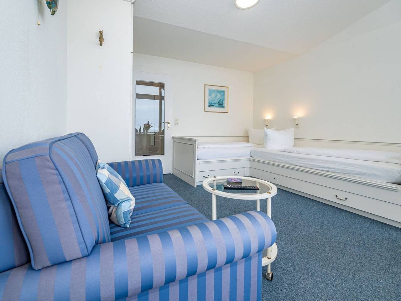 City-Ferienwohnung mit traumhaftem Meerblick! 1-Zimmer-Ferienwohnung ca. 30 qm in der 8. Etage (Fahrstuhl bis zur 7. Etage) mit Westbalkon (Nachmittagssonne, mit Balkonmöbeln und Auflagen) für max. 2 Personen. Ein Highlight ist der Westbalkon mit Nachmittagssonne, ausgestattet mit Balkonmöbeln und Auflagen perfekt, um bei Meeresrauschen zu entspannen und den Sonnenuntergang zu genießen. Vom Vorflur mit Garderobe und integrierter Küchenzeile gelangen Sie in den kombinierten Wohn-/Schlafbereich sowie in das Badezimmer. Der Wohnraum ist mit zwei über Eck stehenden Einzelbetten, einem 2-Sitzer-Sofa, einem Essplatz, Kabel-TV und Radio ausgestattet kompakt, praktisch und gepflegt. Die Küchenzeile verfügt über einen Herd mit zwei Kochfeldern, eine Mikrowelle, einen Kühlschrank, eine Spülmaschine sowie Kaffeemaschine, Wasserkocher und Toaster alles da für die kleine Selbstverpflegung zwischendurch. Im Bad befinden sich eine Badewanne, ein WC sowie ein Waschtisch. Haustiere willkommen: Der Tagespreis erhöht sich um 5,00?€/Tier, zzgl. einer einmaligen Reinigungspauschale von 10,00?€/Tier. Im Haus befindet sich ein kostenloser Hotspot, der für alle Appartements zugänglich ist (ohne Gewähr). Hinweis: Am Haus am Meer findet in der Zeit vom 13.10.2025 bis voraussichtlich Ostern 2026 eine Balkon- und Fassadensanierung an der Süd- und Ostseite statt. In dieser Zeit ist mit Baulärm zu rechnen. An starken Lärmtagen gewähren wir unbürokratisch einen Nachlass von 20 % auf den Tagesmietpreis.
