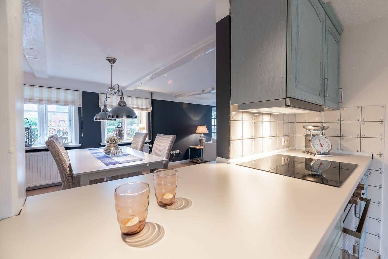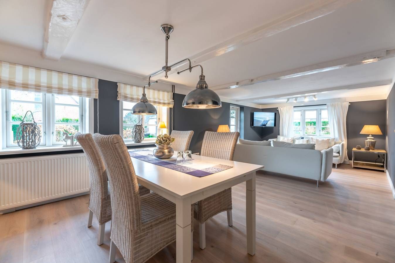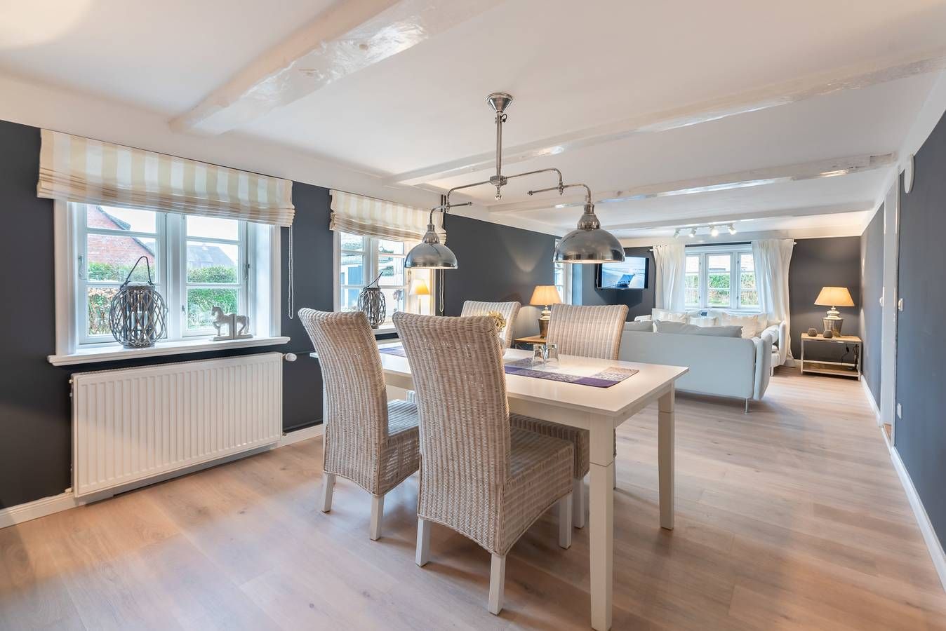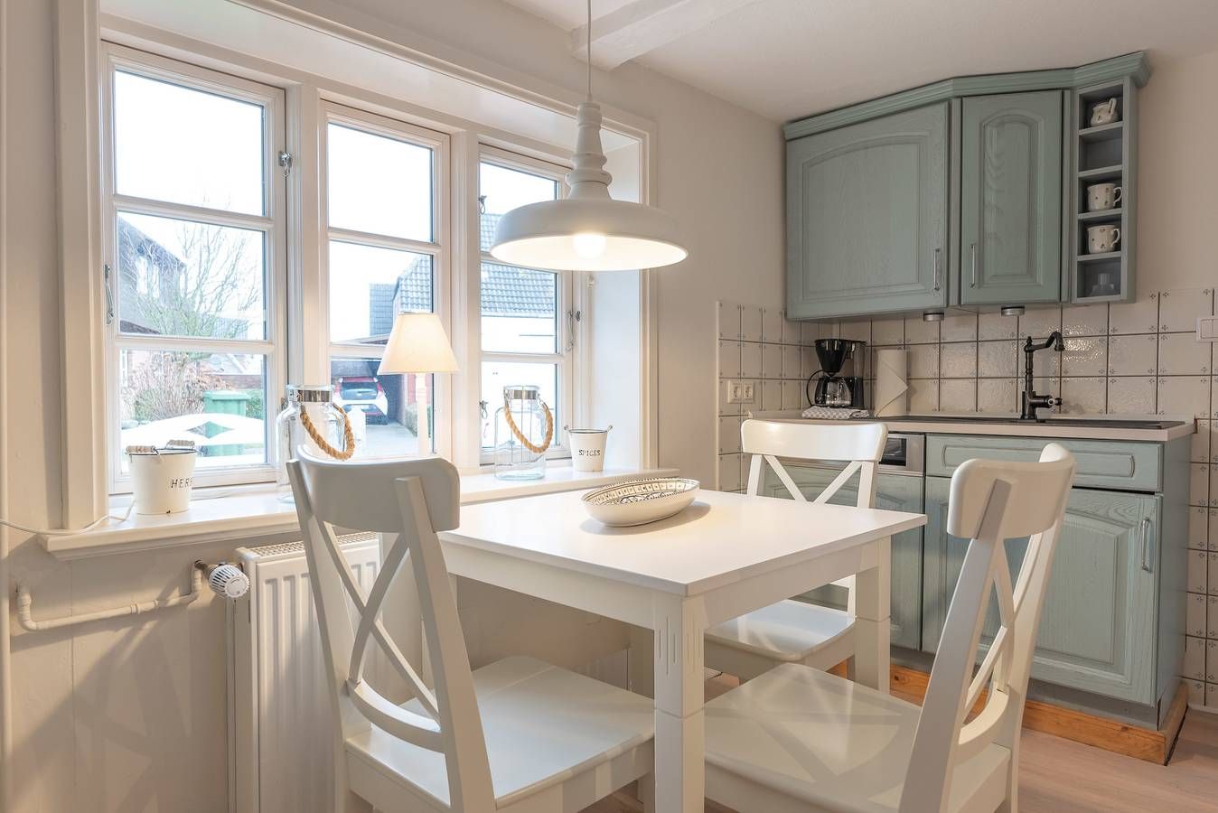 Das historische Friesenhaus "Haus Ankerplatz", angegliedert an unser Ferienhaus "Das Landhaus am Meer" befindet sich direkt am historischen Ortskern, im ruhigen Dorf Utersum, im Westen der Insel. Zum Strand Badestrand sind es nur ca. 500 Meter. Einaufsmöglichkeiten, Bäcker und Gaststätten befinden sich in unmittelbarer Nähe. In diesem, gemütlich im Nordischen Landhausstil eingerichteten Friesenhaus (ca. 76 qm) steht Ihnen ein heller geräumiger Wohn- und Essbereich mit angegliederter Küche zur Verfügung. Hier können Sie nach Herzenslust gemütliche Abende mit Blick in den Apfelgarten genießen. Vom Wohnbereich aus gelangen Sie auf die Terasse. Das Haus verfügt über zwei Schlafzimmer. Ein Schlafzimmer mit Doppelbett (180×200) sowie ein weiteres Schlafzimmer mit zwei Einzelbetten (jeweils 90×200), die auch zum Doppelbett zusammengestellt werden können. Das Bad mit Badewanne/Dusche und WC ist hell und lichtdurchflutet und zusätzlich mit einer Fußbodenheizung ausgestattet. Die Wohnbereiche sind mit Maßivholzpakett, Küche, Bad und Flur mit Fliesen bzw. historischem Terazzo ausgestattet. Ausstattung: Wohnzimmer: Fernseher (Sat-TV) Küche: Geschirrspüler, Backofen, Kühlschrank, Gerfrierschrank, Kaffemaschine, Wasserkocher, Toaster Bad: Föhn Schlafzimmer: Radiowecker Kinderzimmer: Radio-CD-Player Waschmaschine und Trockner stehen Ihnen im separaten Hauswirtschaftsraum gegen Gebühr zur Verfügung.