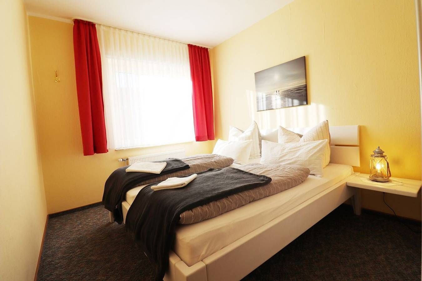 Die 2-Raum-Wohnung hat 40 m² und 1 Schlafzimmer (1 x Doppelbett). Hervorragend geeignet für Singles und Paare. Dieser Wohnungstyp ist mit Balkon ausgestattet und befindet sich im 1. Stock. Eine Belegung mit bis zu 4 Personen (ma. 2 Erwachsene und 2 Kinder) ist optional möglich. Die Wohnung hat eine separate Küche und ein Duschbad. Die Küche hat eine Mikrowelle, Wasserkocher, Kaffeemaschine, Toaster, sowie Geschirr für den täglichen Bedarf sind ebenfalls vorhanden. Haustiere sind nicht erlaubt. Alle Wohnungen im Haus "Dithmarschen" verfügen über WLAN in der Wohnung. Am Haus sind ausreichend Parkplätze vorhanden. Ihnen stehen eine Münz-Waschmaschine und ein Münz-Trockner zur Verfügung. Rasenfläche, eine Sandkiste, sowie ein abschließbarer Carport für Fahrräder sind direkt am Haus gelegen. Durch die Lage im ersten Kurgebiet von Büsum kann man sowohl den Sand- wie auch den Grünstrand bequem zu Fuß erreichen, aber auch der Weg in das Ortszentrum von Büsum ist nicht weit. Ein Bäcker und Supermarkt sind nur eine Querstraße entfernt. Die Betten sind bei Anreise bezogen.