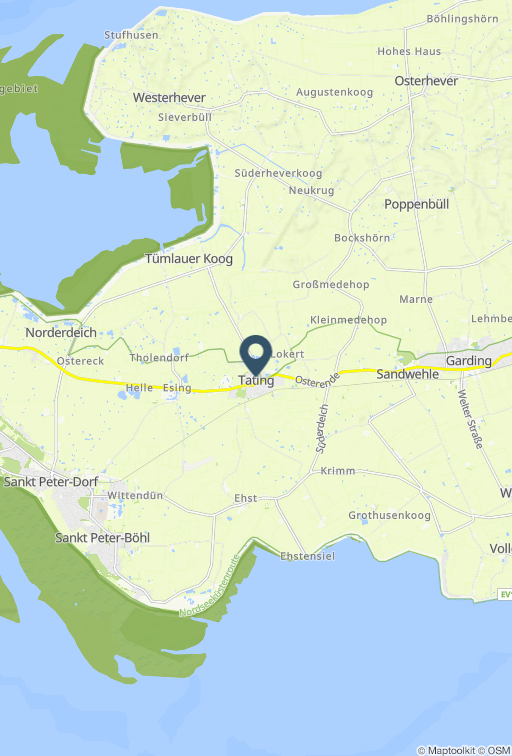 Unsere Ferienwohnung (4 Sterne- und KinderPlus-Bewertung) mit einer Fläche von 70 qm und Platz für bis zu 4 Personen, befindet sich mitten auf der Halbinsel Eiderstedt in dem kleinen Ort Tating, nur wenige Minuten von St. Peter-Ording entfernt.