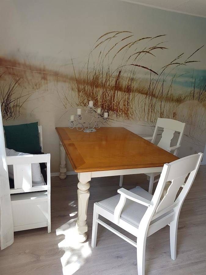 Der eigene Garten mit Südterrasse und Standkorb verleiht dieser 55m² Ferienwohnung den besonderen Charakter. Hier haben Sie die Möglichkeit in der Sonne zu frühstücken und die Abende beim Grillen zu genießen. Die Wohnung ist ausgestattet mit einer geräumigen Wohnküche und amerikanischer Gefrierkombination. Die Wohn- und Schlafräume erreichen Sie über die Wendeltreppe. Im Wohnzimmer können Sie sich gerne in der umfangreichen Spiele-, DVD- und Büchersammlung etwas schönes aussuchen und gemütlich mit Ihrer Familie zusammensitzen. Sky-TV und Netflix per Flat, sowie eine PlayStation 2+ Singstar und freies WLAN stehen ebenfalls für Sie bereit, so haben Sie auch an Schlechtwettertagen genug Abwechslung in unserem Haus. Wir bieten Ihnen im Schlafzimmer ein Boxspringbett mit 140 x 200 cm Liegefläche. Im Kinderzimmer haben wir ein Etagenbett mit jeweils 90 x 200 cm Matratze , groß genug für Erwachsene, das Sofa im Wohnzimmer hat eine Ausklapp- Funktion und darf gerne genutzt werden. Auf Wunsch stellen wir Ihnen weitere Decken und Kissen zur Verfügung. Wir freuen uns auf Sie und wünschen Ihnen einen tollen Urlaub bei uns. Die Maisoinette- Wohnung "lütt un lütt" liegt direkt am Wald- und Wanderweg zwischen Bad und Dorf. Der Deich ist in 6 min., das Zentrum und die Promenade sind in etwa 25 min. fußläufig zu erreichen. Der Kinderspielplatz ist für Ihre Kinder ohne Straßenüberquerung in 150 m direkt über den Waldweg schnell gefunden. Bettwäsche und Handtücher können für 15,- € pro Person zur Verfügung gestellt werden. Ein Hund ist gegen eine Gebühr in Höhe von 10,- €/täglich zubuchbar. W-LAN wird Ihnen kostenfrei zur Verfügung gestellt. Netflix und Disney- TV inklusive. Anreise ab 15.00 Uhr. Abreise bis 10.00 Uhr.