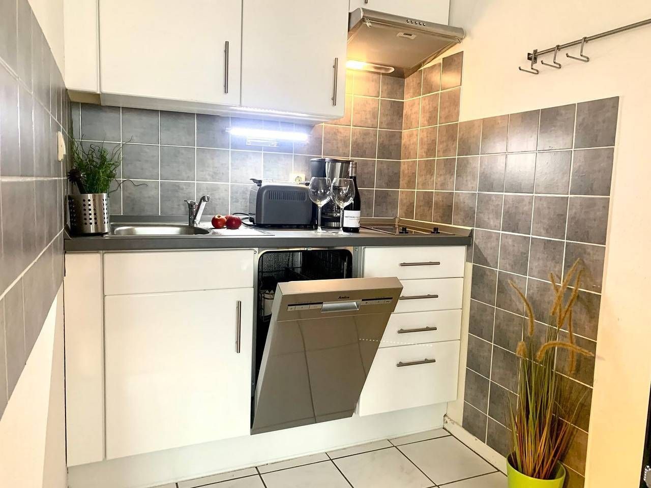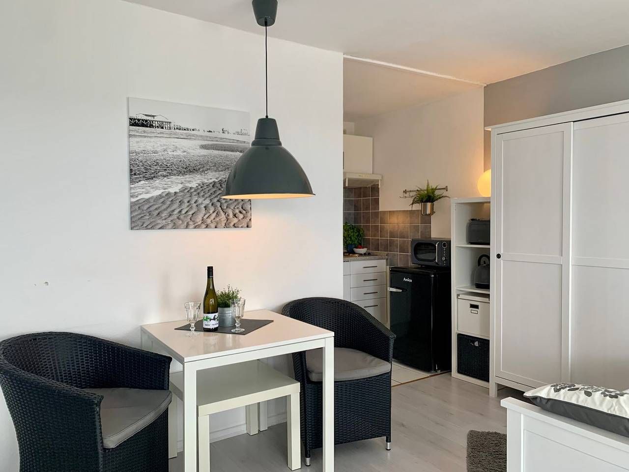 Ferienwohnung – Apartment 49 „Meerblix“ in St. Peter Ording Das modern und ansprechend eingerichtete 1-Zimmer Apartment liegt in der 5. Etage und bietet 2 Personen Platz für einen unvergesslichen Urlaub in St. Peter Ording. Zur Ferienwohnung gehört ein großzügiger, möblierter Eckbalkon mit seitlichem Meerblick. Durch das große Panoramafenster wirkt der kombinierte Wohn- und Schlafraum wunderbar hell und einladend. Die geschmackvolle Einrichtung unterstreicht das Ambiente, ein gemütliches Sofa und zwei Ledersessel bieten komfortable Sitzgelegenheiten. Zur Ausstattung gehört hier ein komfortables 160x200cm Doppelbett. Für die multimediale Unterhaltung in der zentral und strandnah gelegenen Ferienwohnung in St. Peter Ording sorgen Flachbild-TV und kostenfreies W-LAN. Die in den Raum integrierte Küchenzeile ist gut ausgestattet, unter anderen sind Kochfeld und Mikrowelle sowie Kaffeemaschine und Kühlschrank mit Gefrierfach vorhanden. Das moderne Duschbad mit WC verfügt über einen sehr niedriger Duscheinstieg und ist unter anderem mit einem Haartrockner ausgestattet. Willkommen im Urlaub, willkommen in St. Peter Ording! Wichtige Informationen: Nichtraucher, keine Haustiere. W-LAN vorhanden. Fahrstuhl vorhanden. PKW-Stellplatz am Objekt. Münzwaschtrockner in Gemeinschaftskeller. Glattboden, Zentralheizung.