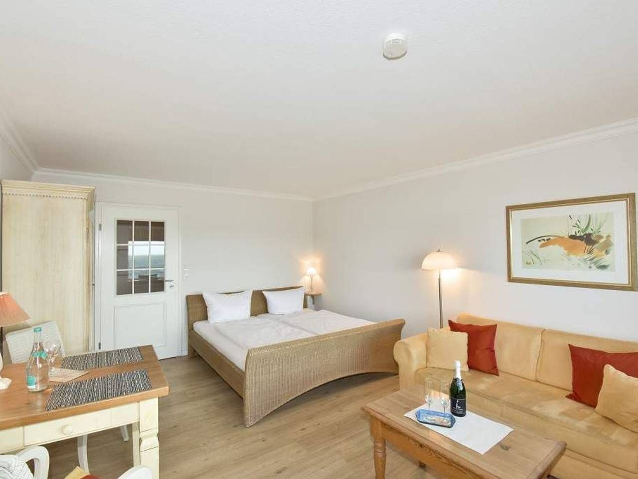 Fantastischer Meerblick direkt am Strand! Hochwertig ausgestattete 1-Zimmer-Nichtraucher-Ferienwohnung (ca. 34 qm) in der 1. Etage zur Seeseite mit Westloggia und Meerblick (Nachmittagssonne, mit Balkonmöbeln und Auflagen) ideal für 2 Personen. Vom Vorflur mit Garderobe und Küchenzeile gelangt man in das kombinierte Wohn-/Schlafzimmer (mit Austritt zum Balkon) und in das neue Duschbad/WC. Der Wohn-/Schlafraum mit neuem Designerboden in Eichenholzoptik besteht aus einer gemütlichen Sitzgarnitur (Zweisitzer-Sofa), einem feststehenden Doppelbett (Einzelmatratzen 0,90 x 2,00 m), einem Essplatz, Kabel-Flachbild-TV, Radio/CD. Die neue Küchenzeile hat einen Geschirrspüler, eine Mikrowelle, Nespresso-Maschine, ein 2-Platten-Ceranfeld und einen Kühlschrank mit 3-Sterne-Gefrierfach. Kaffeemaschine, Wasserkocher und Toaster gehören zur Grundausstattung. Das neue Bad hat eine Dusche, Waschtisch, Handtuchtrockner und WC. Ein PKW-Stellplatz in der Tiefgarage oder ein Außenstellplatz kann für 14,00 € / Tag bei Bedarf mit gebucht werden (begrenztes Kontingent). Im Haus befindet sich ein kostenloser Hotspot, der für alle Appartements zugänglich ist (ohne Gewähr)