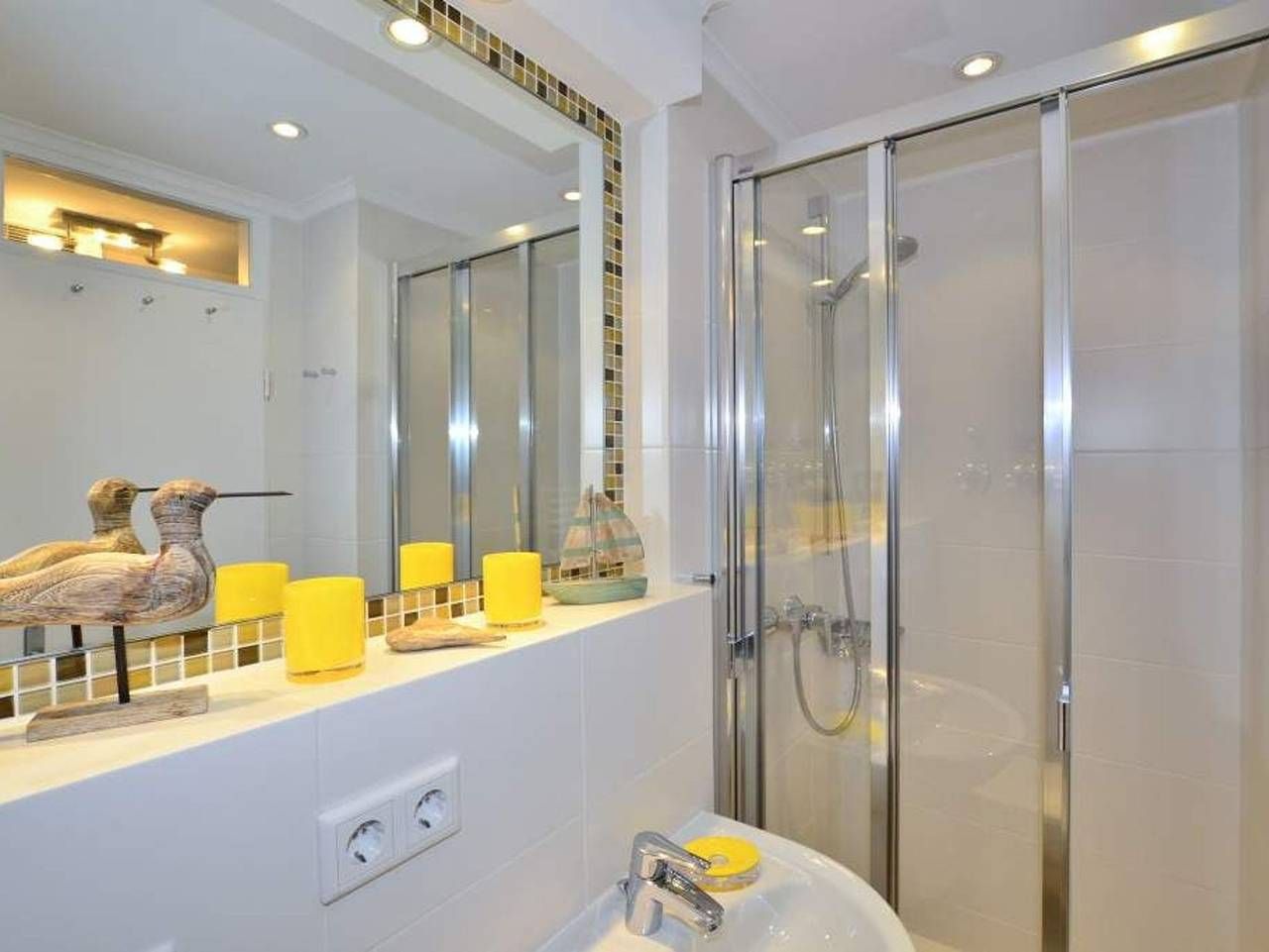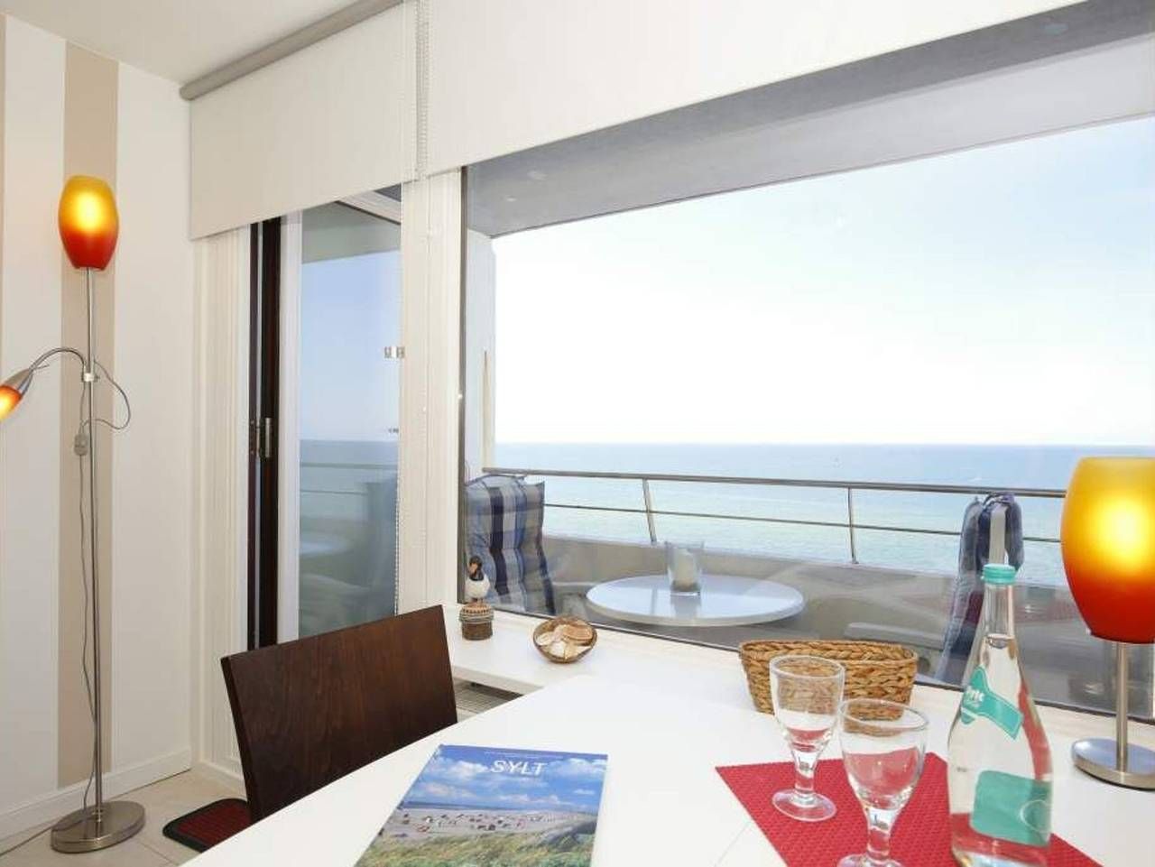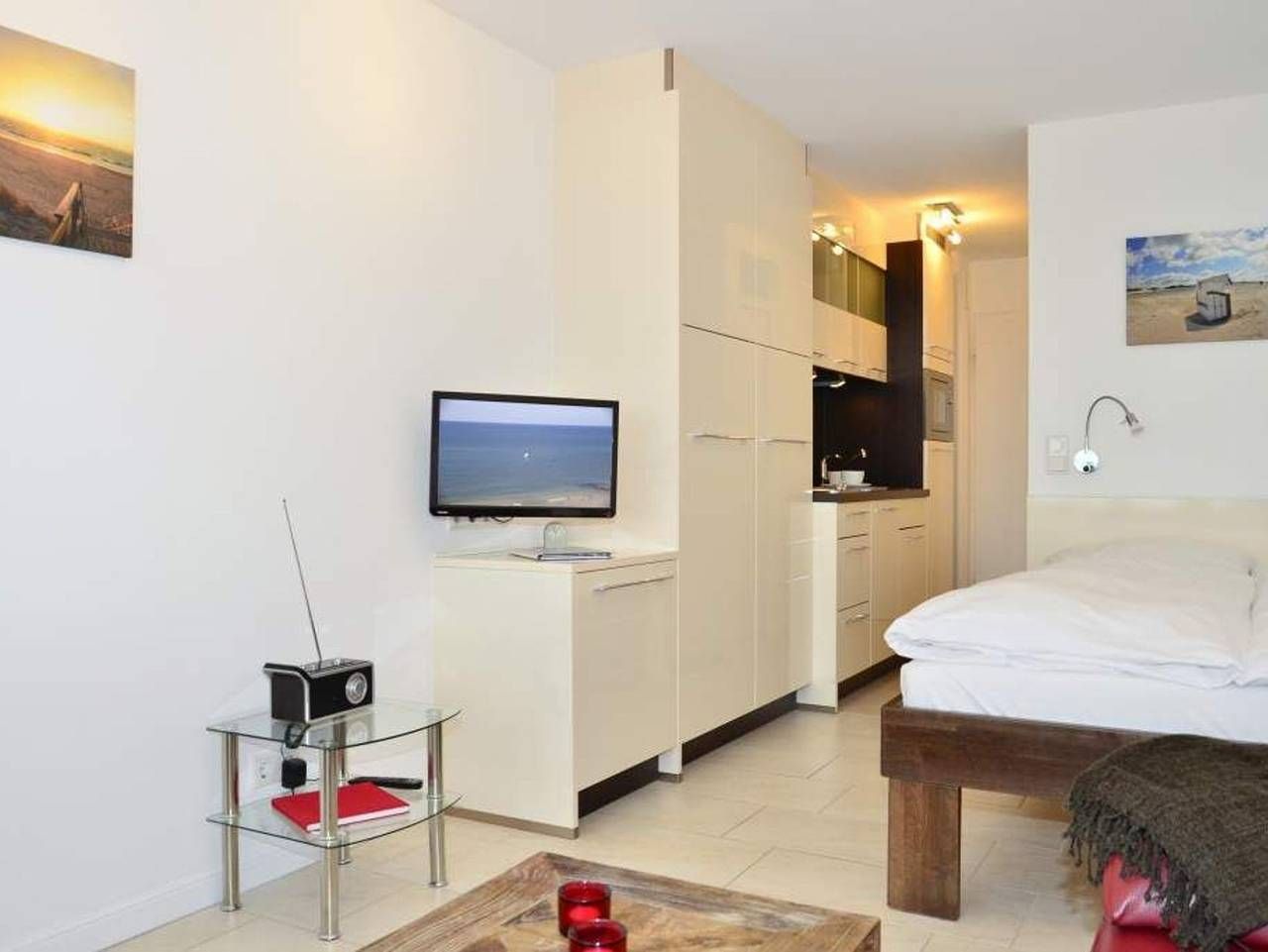 Wohn-/Schlafzimmer: angenehmer Schlaf durch erhöhtes Komfortbett (1,40 x 2,00), aus massivem Holz mit 7-Zonen-Kaltschaummatratze und hochwertiger, stufenlos verstellbarer Lattenrost. Beschichtete Plissees dunkeln den Raum ab und ermöglichen ein angenehmes Schlafen. Das erhöhte Bett bietet die Möglichkeit unter diesem Gepäck zu verstauen. Hochwertige italienische 2-Sitzer-Leder-Couch mit Federkern. Essplatz mit Blick auf die Nordsee. Flachbild-TV mit integriertem CD/DVD, Radio, Westbalkon mit außergewöhnlichem Blick auf die offene Nordsee, den Strand, die Promenade, die unendliche Weite; genieße von hier das Schauspiel der untergehenden Sonne. Balkonmöbel. Moderne, offen gestaltete Designerküche im Flur mit Geschirrspüler, Mikrowelle, Cerankochfeld. Kaffeemaschine, Wasserkocher und Toaster gehören zur Grundausstattung. Modernes Duschbad/WC mit Raindance-Brausekopf und Glasduschabtrennung. Haustiere sind hier leider nicht gestattet. Im Haus befindet sich ein kostenloser Hotspot, der für alle Appartements zugänglich ist (ohne Gewähr).