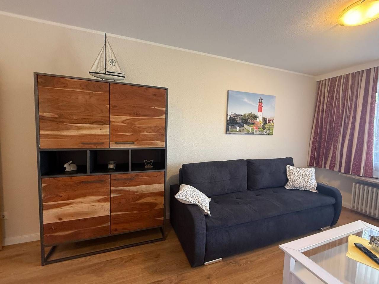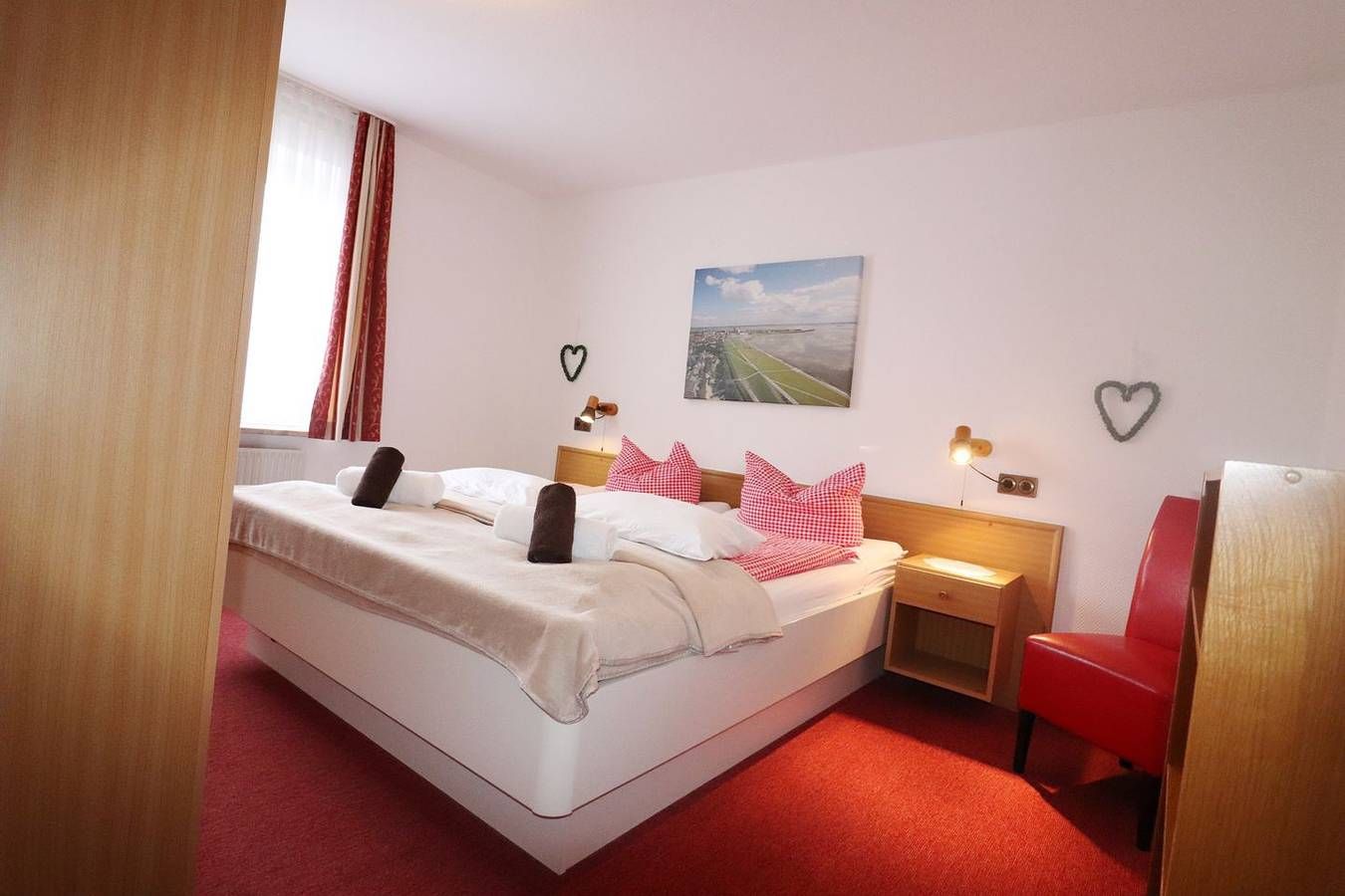 Die 2-Raum-Wohnung im 1. OG hat 50 m² und 1 Schlafzimmer (1 x Doppelbett) und bietet Platz für bis zu 4 Personen. Das 2,10 m lange Doppelbett ist durch seine Höhe auch für Senioren geeignet. Die Wohnung hat eine separate Küche und ein Duschbad. Die Küche hat einen Wasserkocher, Kaffeemaschine, Toaster, Geschirrspüler, sowie Geschirr für den täglichen Bedarf sind ebenfalls vorhanden. Haustiere nach Absprache erlaubt. Alle Wohnungen im Haus „Rungholt" verfügen über WLAN in der Wohnung. Sie können bei uns Ihre Fahrräder in der hauseigenen Garage abstellen. Münz-Waschmaschine und Münz-Trockner sind im Waschraum vorhanden. Parkplätze sind am Haus vorhanden. In der Saison steht morgens ein Bäckerwagen direkt beim Nachbarn mit frischen Brötchen. Die Familienlagune ist auch mit Kindern in wenigen Schritten zu erreichen. Die Betten sind bei Anreise bezogen
