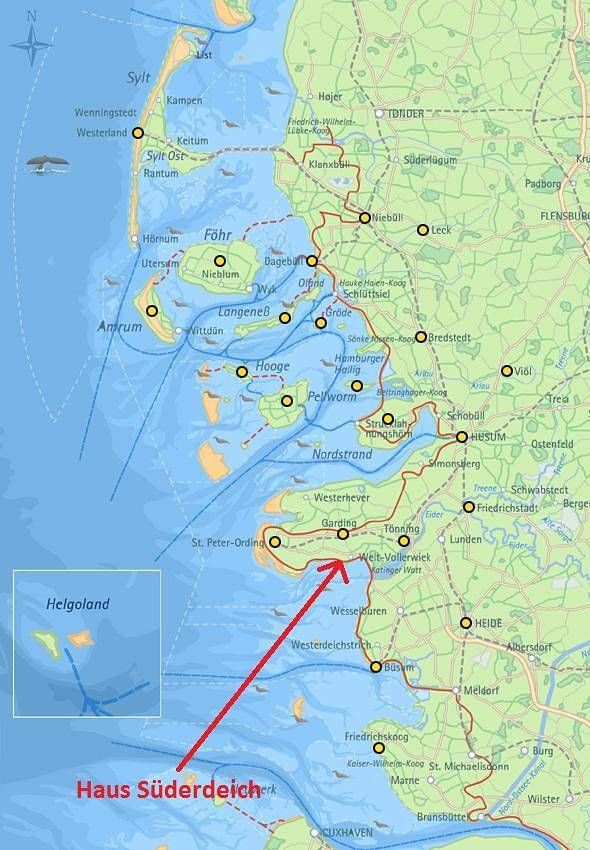 Verbringen Sie Ihren Urlaub in unserer im Erdgeschoß liegenden Ferienwohnung. Geeignet ist Sie für bis zu 3 Personen (und ein Kleinkind). Die Wohnung ist durchgehend gefliest und hat einen eigenen Eingang. Vom Wohnraum aus gelangen Sie direkt auf die Terrasse mit Gartenmöbeln. Komplett eingezäunt ist das Grundstück, sodass man die Alltagssorgen einmal hinter sich lassen kann. Ausgestattet ist Sie mit einem Wohnschlafraum mit Schlafcouch, SAT-TV, W-Lan und Stereoanlage, einer kleinen, separaten Küche mit Herd und Backofen, Toaster, Wasserkocher, einem Schlafraum mit Doppelbett, einem Kinderzimmer mit Einzelbett und Duschbad mit WC. Die Lage der Ferienwohnung direkt am Nordseedeich nur 100m zum Wasser ist ideal für Kitesurfer und Windsurfer, Radfahrer und Wattläufer. Willkommen im Haus Süderdeich - Urlaub direkt am Meer Es trennen Sie nur 100m zur Badestelle. Wohnen Sie bei uns in Vollerwiek auf der Halbinsel Eiderstedt in unserer gemütlich eingerichteten 45qm großen Ferienwohnung. Ein Garten und Terrasse lässt eine entspannte Urlaubsatmosphäre zu. Die ruhige Lage trägt zuer zusätzlicher Erholung bei. Ideal für Strandgänger, Radfahrer, Wattläufer, Wind- und Kitesurfer. Und soll es doch mal heißen - die Füße in den Sand - ist der große Sandstrand von St. Peter-Ording nur 12 km entfernt. Wir als Vermieter bewohnen den restlichen Hausteil und stehen für Fragen rund um Ihren Urlaub gern zur Verfügung. Einen tollen Urlaub mit vielen Erlebnissen wünschen wir Ihnen! Ihre Familie Reinker Seit dem 01.01.2022 akzeptieren wir keine Huastiere mehr. Mit dem Auto Von Hamburg kommend auf der A23 Richtung Heide, Abfahrt Heide Nord, rechts ab Richtung Büsum, weiter geradeaus bis zum Kreisverkehr hier die erste Abfahrt Richtung Wesselburen und St. Peter-Ording. Durch Wesselburen gerade aus durch und immer weiter Richtung St. Peter-Ording. Nach dem Durchfahren des Eidersperrwerkes nach ca. 3 km links abbiegen in die Straße Süderdeich. Sie fahren direkt auf den Deich zu. Davor rechts halten und immer am Deich entlang. Nach ca. 3 km passieren Sie linker Hand die Badestelle und Sie sehen das DLRG-Häuschen. Sie fahren am Parkplatz vorbei und halten dann vor dem vierten Haus auf der linken Seite. ANGEKOMMEN und Herzlich Willkommen!
