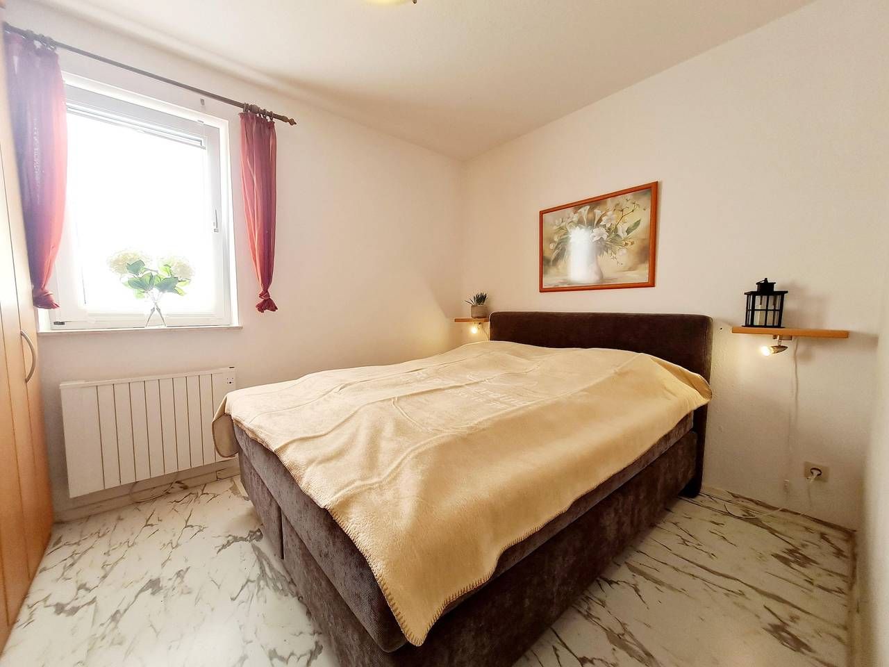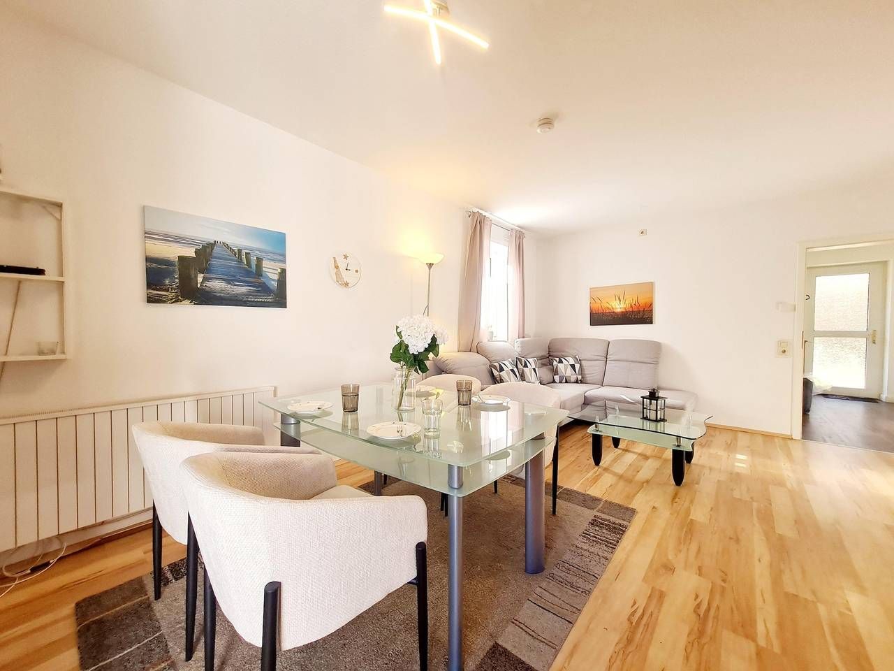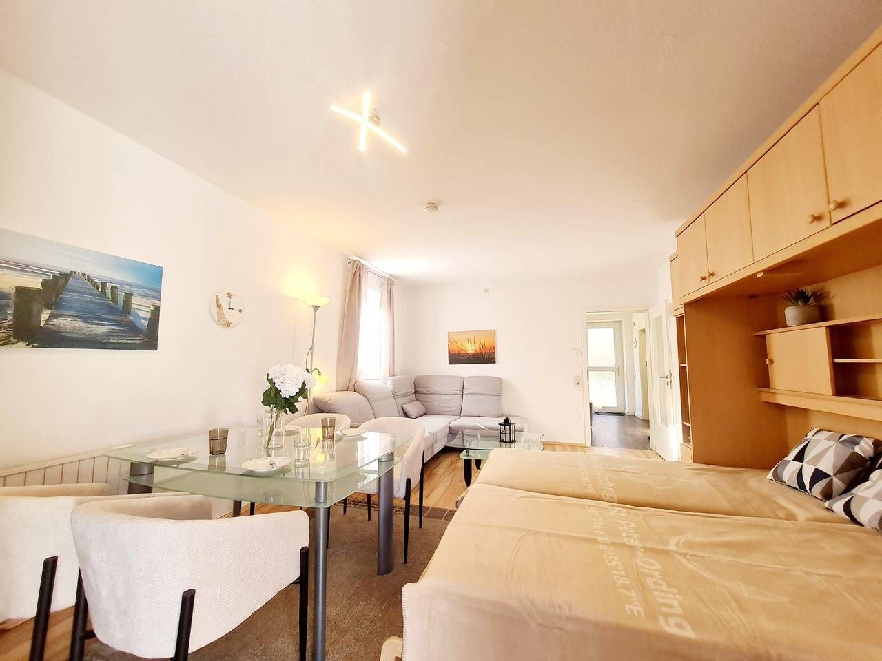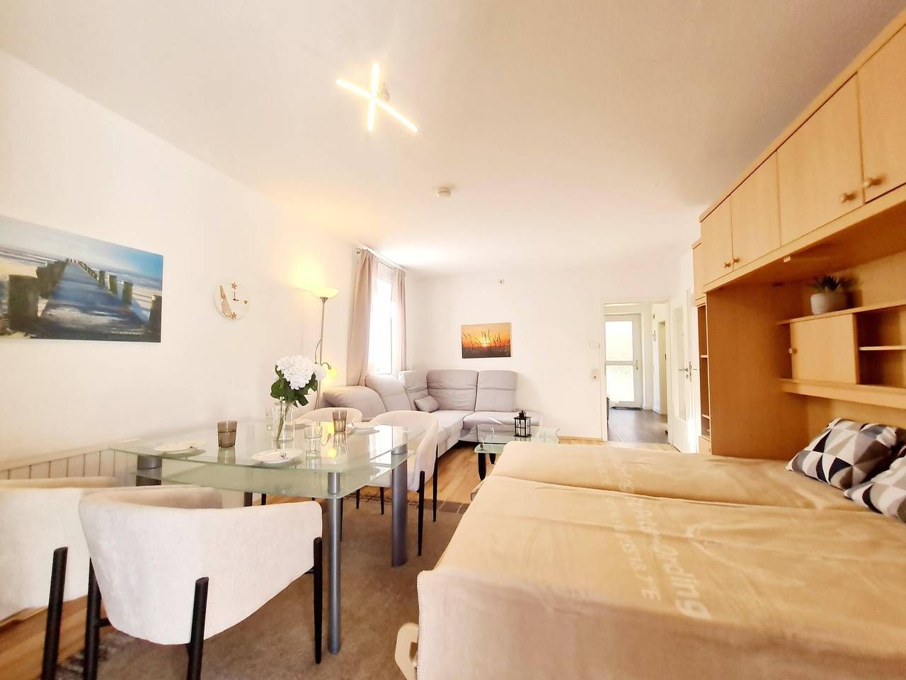 Die Ferienwohnung hat eine gute Raumaufteilung und ist komplett ausgestattet. 1 Wohnschlafraum (Laminat neu verlegt) mit einzelnen Schrankbetten sowie Kabel-Farb-TV (Flachbild), Radio/CD-Player sowie moderne Essecke. 1 Schlafraum...