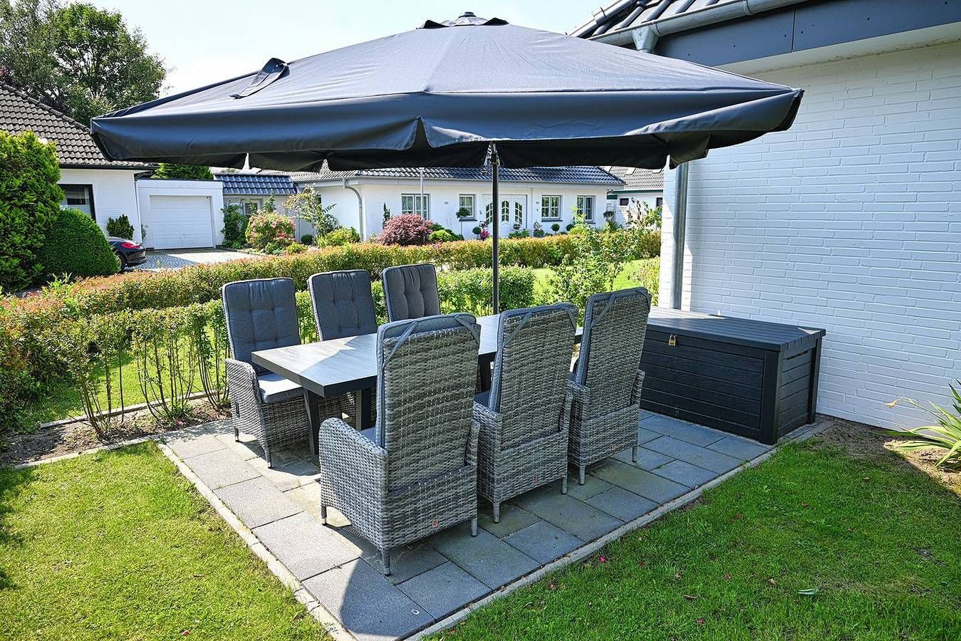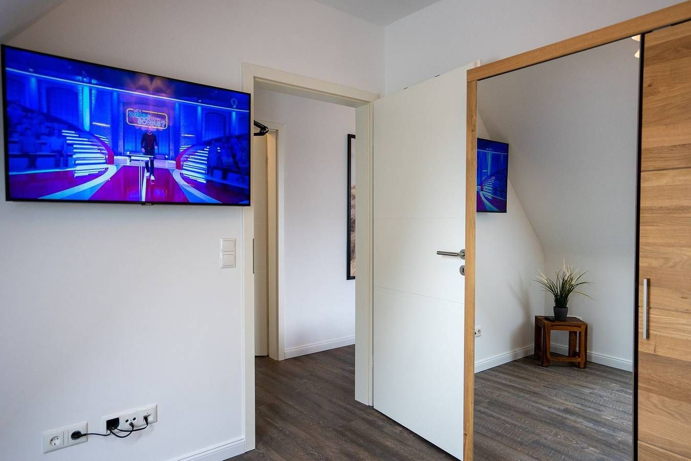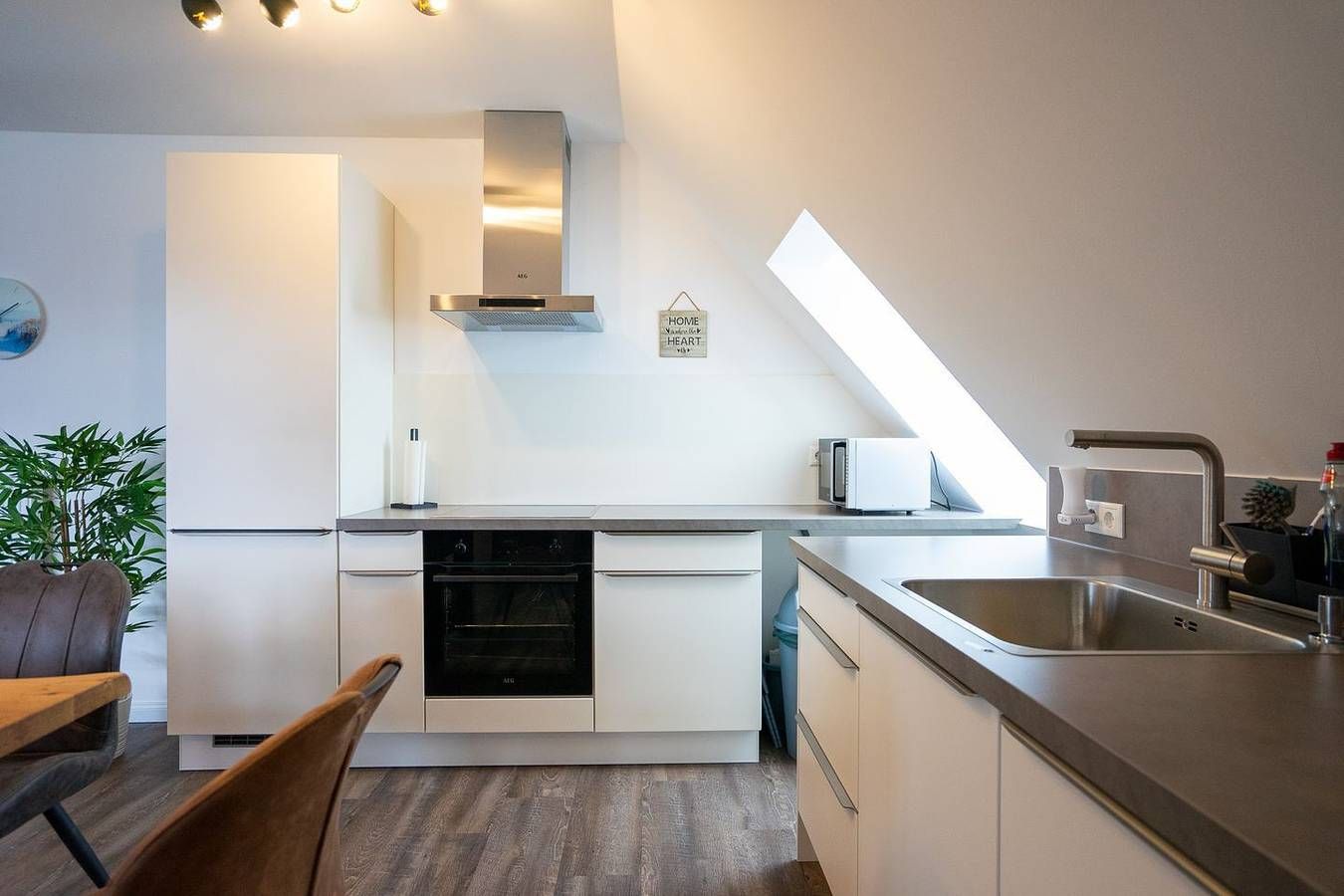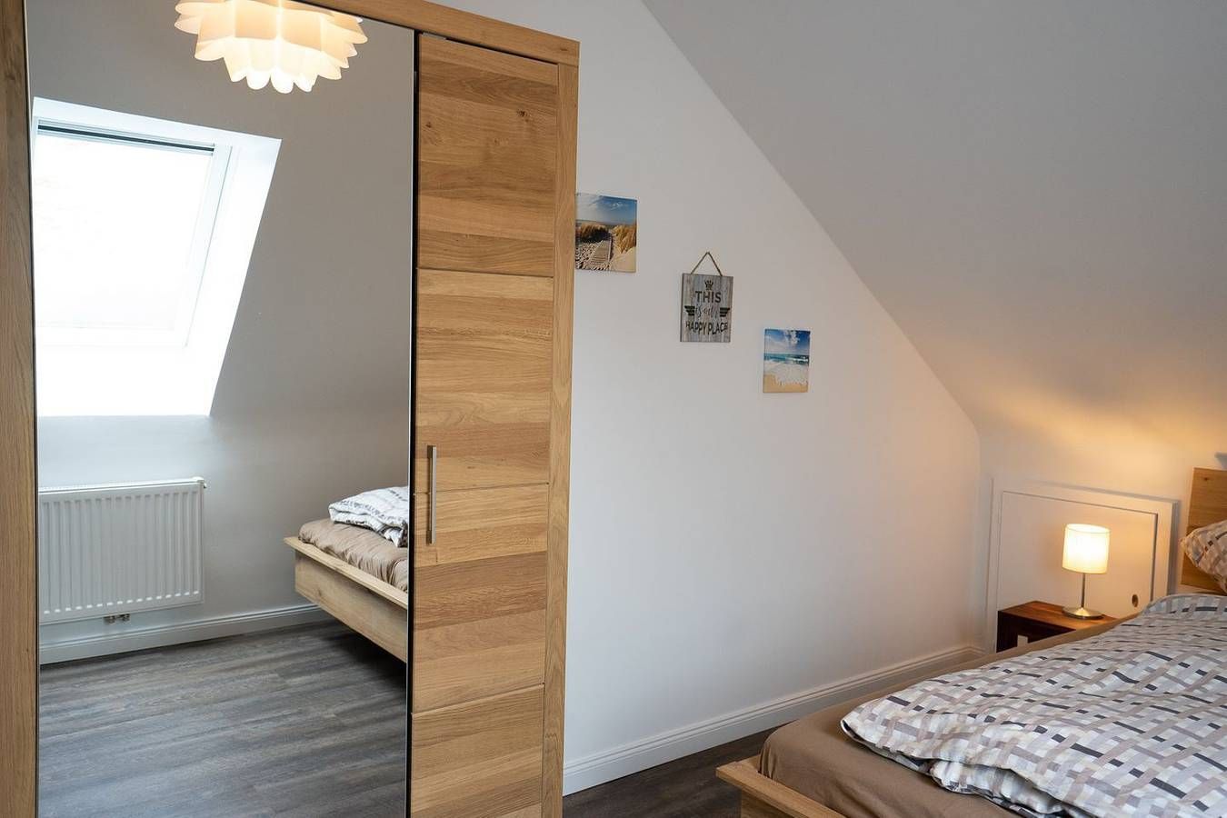 Herzlich Willkommen in dieser wunderschönen Ferienwohnung. Hier finden bis zu 6 Personen Platz. Auch Ihren Hund können Sie gerne mitnehmen. In der Küche finden Sie alles, was Sie für die Zubereitung Ihrer Mahlzeiten benötigen. Backofen, Induktionskochfeld, Mikrowelle, Geschirrspüler sind ebenso vorhanden wie eine Kühl-Gefrierschrank-Kombination mit 3 Gefrierfächern sowie eine Waschmaschine. Darüber hinaus runden u.a. Kaffeemaschine, Wasser- und Eierkocher, Pürierstab, Mixer und Backform das Ensemble ab. In dem großzügigen Wohn-/Essbereich können Sie gemütliche Stunden verbringen. Der große Smart-TV mit Soundbar, sowie eine kleine Auswahl an Gesellschaftsspielen und Büchern stehen Ihnen für gesellige Abende zur Verfügung. Die Wohnung verfügt über 3 separate Schlafzimmer, von denen zwei Zimmer mit 180x200-Doppelbetten mit je 90x200-Einzelmatratzen und ein Zimmer mit je zwei 90x200-Einzelbetten ausgestattet sind. Darüber hinaus finden Sie in allen Schlafzimmern jeweils einen eigenen Smart-TV. Im Duschbad versorgt Sie ein Internetradio bei Bedarf mit Musik. Seit 2023 verfügt die Dachgeschosswohnung über eine kleine eigene Terrasse im Garten, die über einen kleinen Weg ums Haus zu erreichen ist. Der große Tisch und die 6 hochkomfortablen Sessel mit stufenlos verstellbaren Rückenlehnen, laden zum Entspannen ein. Ihnen stehen zwei Parkplätze direkt auf dem Grundstück zur Verfügung. In der Garage haben Sie eine Fahrradabstellmöglichkeit.