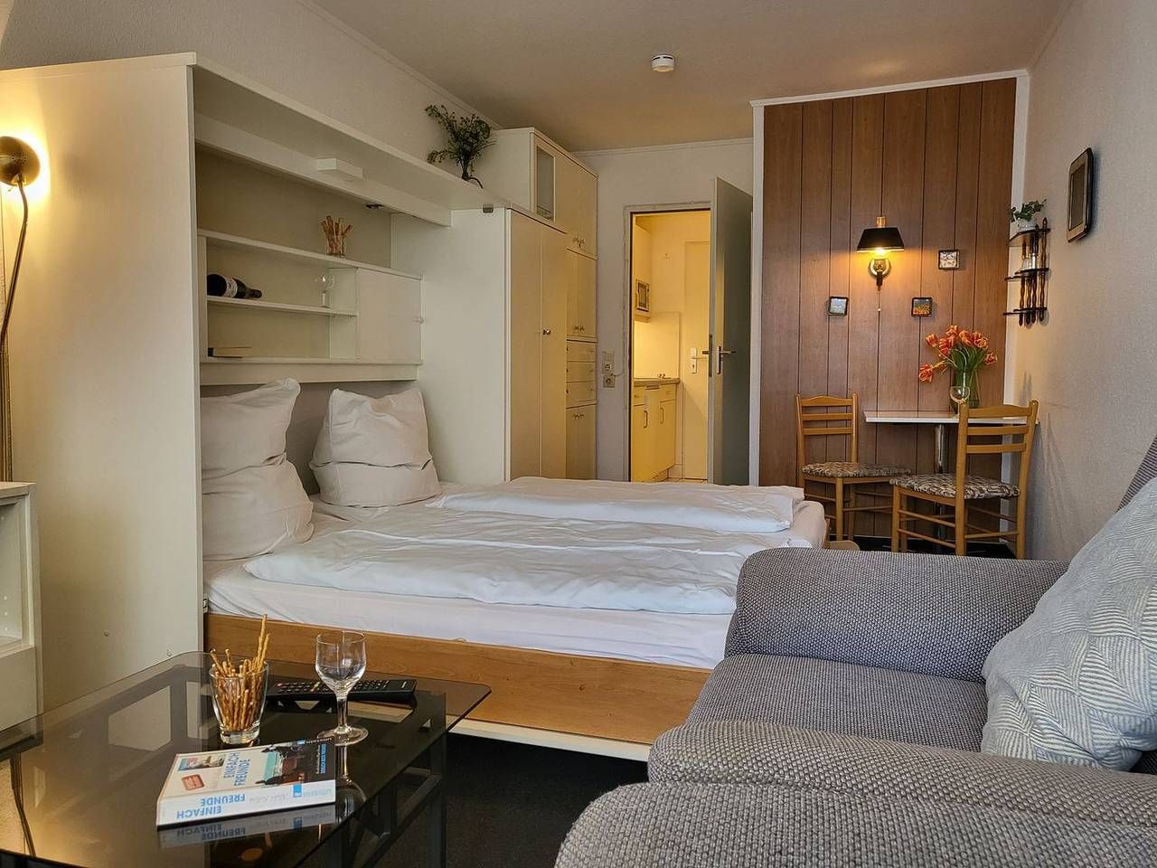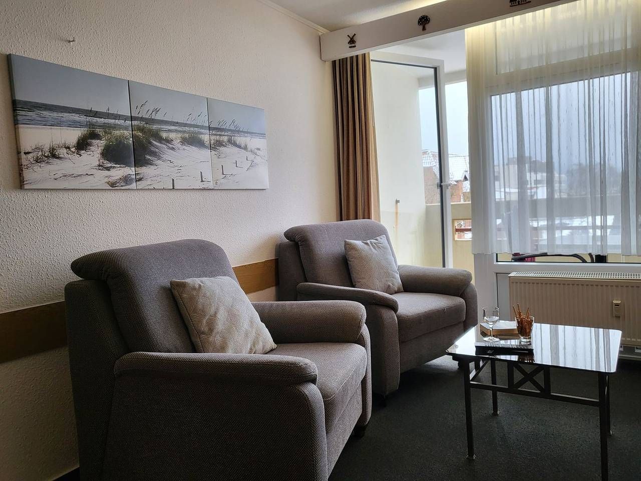 Ferienwohnung – Apartment 57 Die 25m² große 1-Zimmer Ferienwohnung liegt in der 2. Etage und bietet 2 Personen Platz für einen wunderbaren Urlaub in St. Peter Ording. Der wunderbar helle, modern eingerichtete Wohn- und Schlafraum verfügt ein komfortables, 160x200cm Schrankbett und ist darüber hinaus mit Flachbild-TV, zwei gemütlichen Sesseln sowie einer kompakten Ess-Ecke ausgestattet. Kostenfreies W-LAN steht zur Verfügung. Durch die große Fensterfront und den Übergang zum möblierten Balkon mit Blick zur Seeseite wirkt der Wohnraum wunderbar hell. Die gut ausgestattete Pantry-Küche verfügt unter anderem über ein platzsparendes, externes Cerankochfeld nebst Kühlschrank sowie Mikrowelle und Kaffeemaschine. Zur Ferienwohnung gehört ein gut ausgestattetes Duschbad mit WC. Diese Wohnung kann den Fahrstuhl nutzen. Willkommen im Urlaub, willkommen in St. Peter Ording! Wichtige Informationen: Laminatfußboden, Internet via HOT-SPOT, PKW-Stellplatz in der Tiefgarage, gemeinschaftlicher Fahrradraum vorhanden, Gemeinschaftliche Münzwaschtrocker vorhanden, Bettwäsche inkl., Bettwäsche inklusive, Handtücher sind separat zu buchen oder mitzubringen, Nichtraucher, keine Haustiere, Fahrstuhl vorhanden