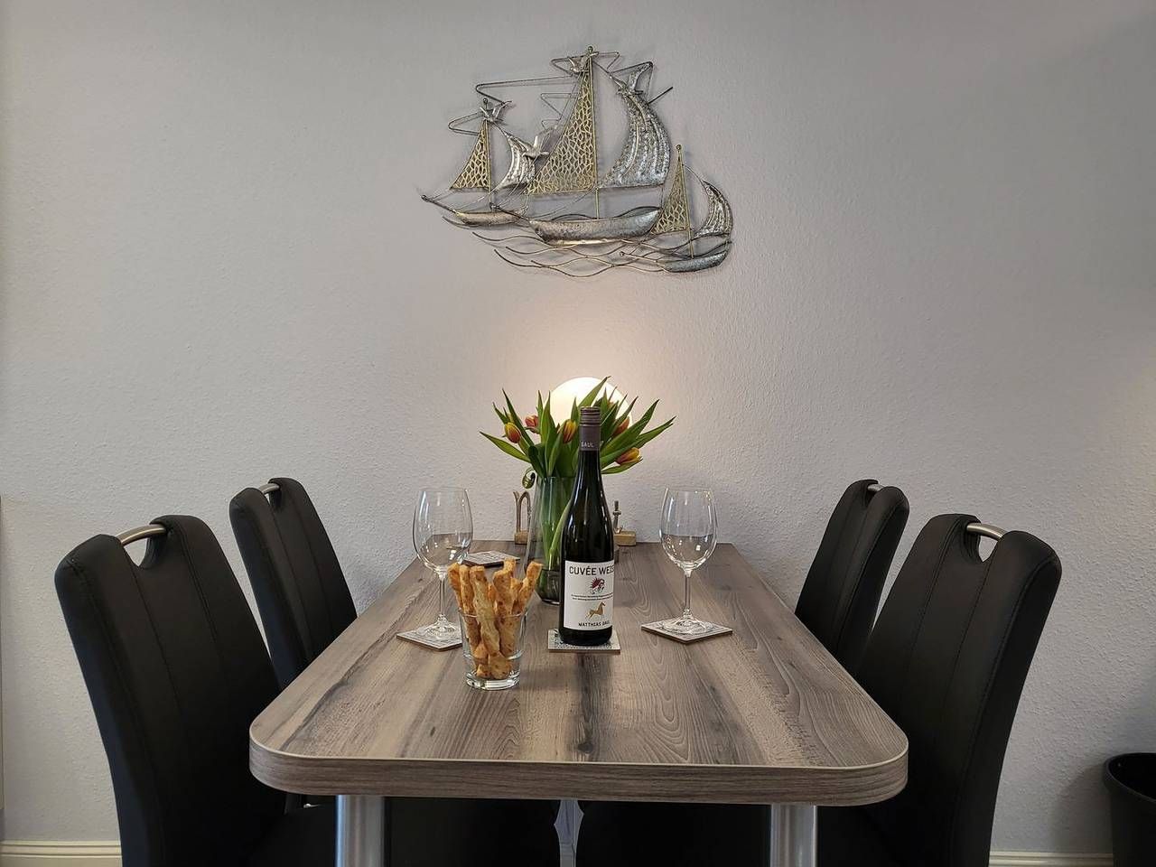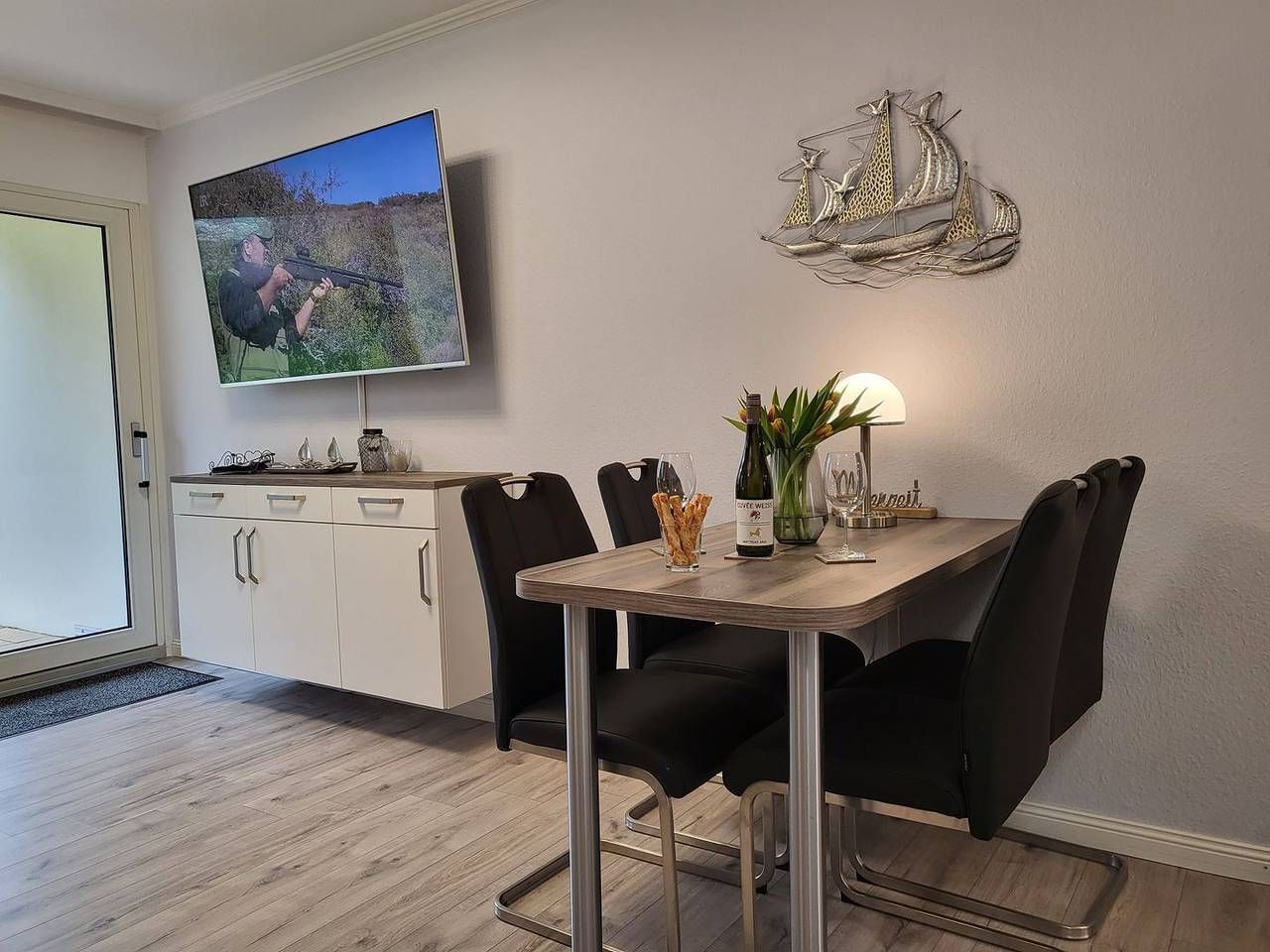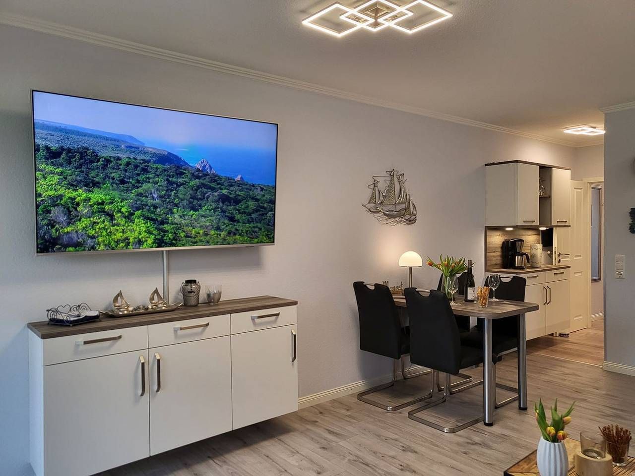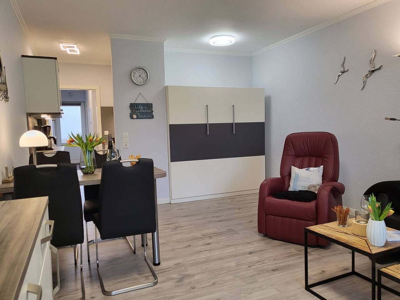 Ferienwohnung Dünenperle - Apartment 70 in St. Peter-Ording Die moderne Ferienwohnung im Kurzentrum wurde im Frühjahr komplett renoviert und neu eingerichtet. Auf 45m² martimer, liebevoll eingerichteter Wohnfläche verbringen hier bis zu 4 Feriengäste erholsame Urlaubstage in St. Peter-Ording. Die Ferienwohnung befindet sich in angenehmer Erdgeschosslage und verfügt über ein überdachte, möblierte Terrasse mit Blick ins Grüne. Die Grünfläche kann als Liegewiese genutzt werden. Durch den Übergang zur Terrasse und die große Fensterfront wirkt das modern eingerichtete Wohnzimmer hell und einladend. Zur Ausstattung gehören neben der komfortablen Couch noch zwei elektrisch verstellbare Leder-Relaxsessel und die einladend eingerichtete Essecke. Der 65" große Smart-TV ist frei schwenk- und kippbar, kostenfreies W-LAN ist vorhanden. Hier lässt es sich wunderbar entspannen. Platzsparend in den Raum integriert ist zudem das komfortable Schrankbett, dass zwei vollwertige Schlafmöglichkeiten bietet. Die angrenzende, offene Küche ist sehr gut eingerichtet und verfügt unter anderem über Cerankochfeld und Backwagen,Kühlschrank mit Gefrierfach sowie eine Kaffeemaschine. Es steht ein Sodastream zur Verfügung, Gäste bringen bitte Kartuschen mit blauem Endstück mit. Das separat gelegene Schlafzimmer ist mit zwei komfortablen Einzelbetten und einem Kleiderschrank ausgestattet, die Betten können problemlos zusammengeschoben werden. Im Flur gibt es weiteren Stauraum für Gepäck. Zur Ferienwohnung gehört ein Duschbad mit WC. Willkommen im Urlaub, willkommen in St. Peter-Ording! Wichtige Informationen: Zentralheizung, Laminatboden und gefliest, W-LAN, Nichtraucher, 1 Hund auf Anfrage gegen Gebühr, Bettwäsche inklusive. Handtücher sind separat zu buchen oder mitzubringen. Familienfreundlich
