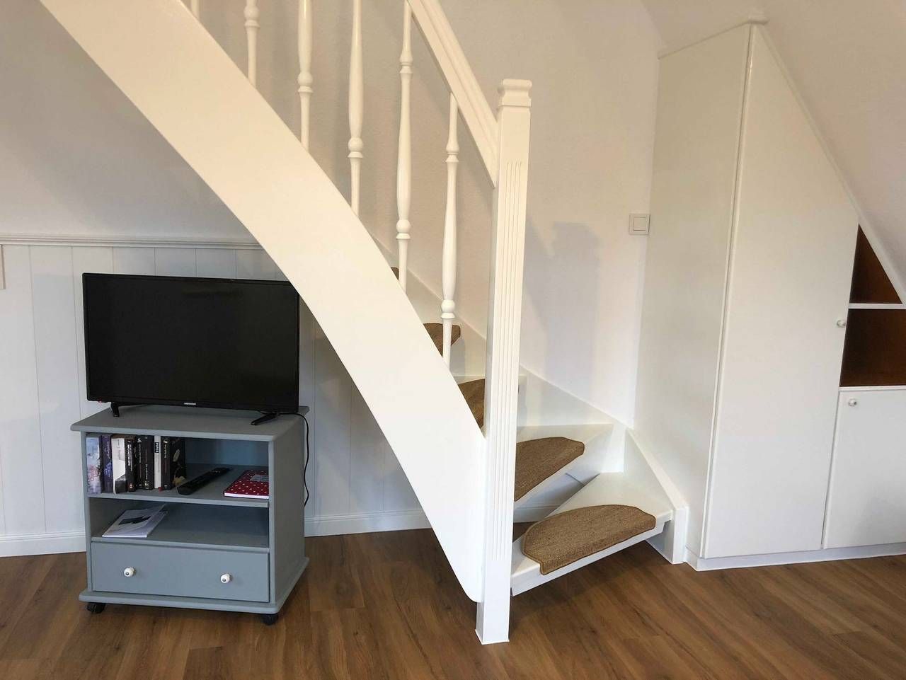 Im malerischen Utersum liegt diese liebevoll und aufwenig renovierte Ferienwohnung, nur 5 Gehminuten vom Strand entfernt (450 m). Die Wohnung ist sehr hell und gemütlich, aber zeitgleich modern eingerichtet. Die neue, offene Einbauküche zum Wohnzimmer hin verfügt über einen Induktionsherd, einen Geschirrspüler und einen Backofen. Ihren Kaffee können Sie sich mit einer Kaffee- oder der Nespressomachine zubereiten und zusätzlich mit einem Milchaufschäumer verfeinern. Im Wohnzimmer befindet sich eine Couch, ein Esstisch, ein Flachbild-TV mit DVD-Player, ein Radio und ein Einbauschrank. Im ausgebauten Dachgeschoss können Sie vorm Schlafengehen noch einen Blick in Richtung Meer werfen. Im Dachgeschoss befindet sich ein Einbauschrank. Im Garten steht eine Gemeinschaftsterrasse mit eigenem Strandkorb und Gartenmöbeln für Sie bereit. Ein Außenstellpatz für Ihren PKW ist ebenso vorhanden, wie ein überdachter Fahrradunterstand und Wasch- und Trockenmöglichkeiten im Hauswirtschaftsraum. Bügelbrett und Bügeleisen sind vorhanden, genauso wie ein Staubsauger. Für die Wassersportler gibt es die Möglichkeit, die Kite- und/oder Surfsegel im Hauswirtschaftsraum trocken zu lagern. Ab dem Jahr 2021 mit Glasfaser (100MBit). Utersum liegt am westlichen Ende von Föhr und verfügt über einen schönen Strand und einen herrlichen Ausblick nach Amrum und Sylt. Am Utersumer Deich treffen sich Abends die Einheimischen und Gäste um den Sonnenuntergang zu geniessen. In Utersum finden Sie einen kleinen Supermarkt, einen Bäcker, Restaurants, die Kurklinik und natürlich einen Fahrradverleih. Die Wohnung ist ca. 35 qm groß und geeignet für 1-2 Personen. Sie bietet Ihnen: Ein Wohnzimmer mit offener Küche Ein Duschbad/WC mit Fenster Ein Schlafbereich unter dem Dach Im Garten steht Ihnen eine Gemeinschaftssitzecke mit Gartenmöbeln und Strandkorb zur Verfügung. Ein Außenstellplatz sowie ein überdachter Fahrradplatz Utersum - nur 450m zum Strand Diese renovierte Wohnung verfügt über ein Wohnzimmer mit offener Küche und einem Schlafplatz unter dem Dach. ca. 35 qm - 1-2 Pers. - DG-Whg. Kurtaxe wird bei Anreise erhoben
