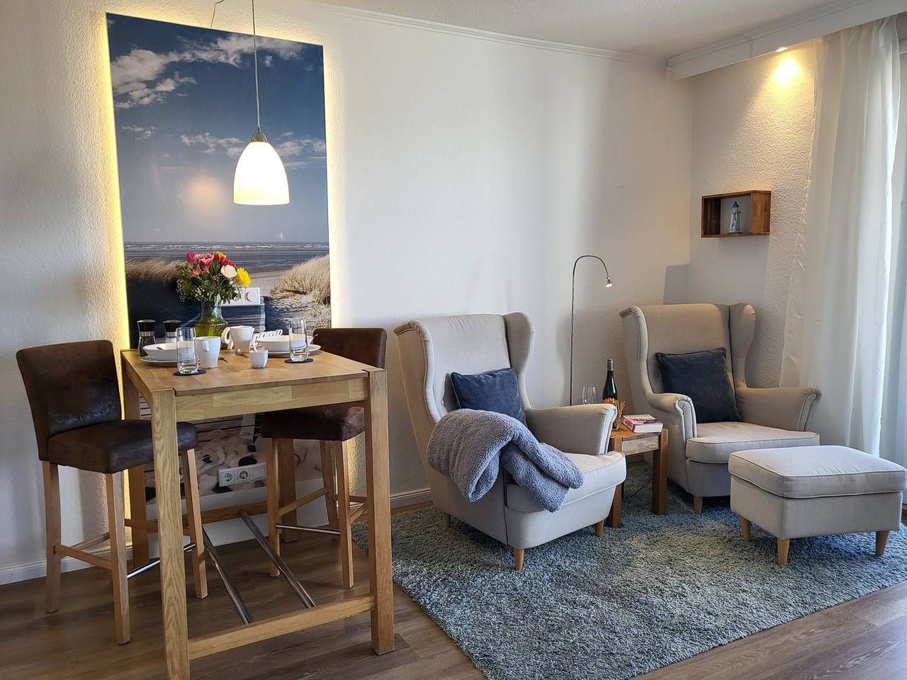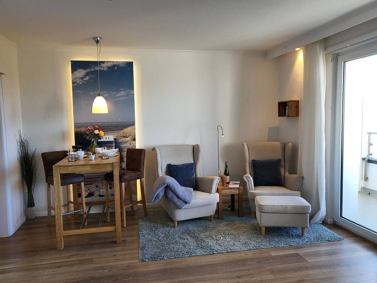 Ferienwohnung „Dünenbake 31" in St. Peter Ording Das moderne 1-Zimmer Appartement liegt in der 4. Etage und bietet zwei Personen Platz für einen unvergesslichen Urlaub in St. Peter Ording. Das moderne, elegant eingerichtete Wohnzimmer lädt mit komfortablen Sesseln, der Esstischgarnitur und seinem Zugang zum möblierten Balkon zu gemütlichen Stunden ein. Durch das große Panoramafenster wirkt der mit Flachbild-TV ausgestattete Wohnraum stets freundlich und hell. Hier befindet sich auch das 160x200 Doppelbett der Ferienwohnung. Die angrenzende, halboffene Küche ist kompakt und praktisch gehalten, bietet jedoch alles, was für kleine Mahlzeiten im Urlaub gebraucht wird. Die Küche ist sehr gut ausgestattet und verfügt zudem über ein Cerankochfeld, Backofen, Mikrowelle, Kühlschrank und eine Kaffeemaschine für den morgendlichen Muntermacher. Die Ferienwohnung verfügt zudem über Duschbad mit WC. Willkommen im Urlaub, willkommen in St. Peter Ording. Wichtige Informationen: Nichtraucher, keine Haustiere, PKW-Stellplatz, Münzwaschmaschine im Haus, Fahrstuhl vorhanden, kein W-LAN