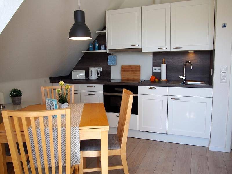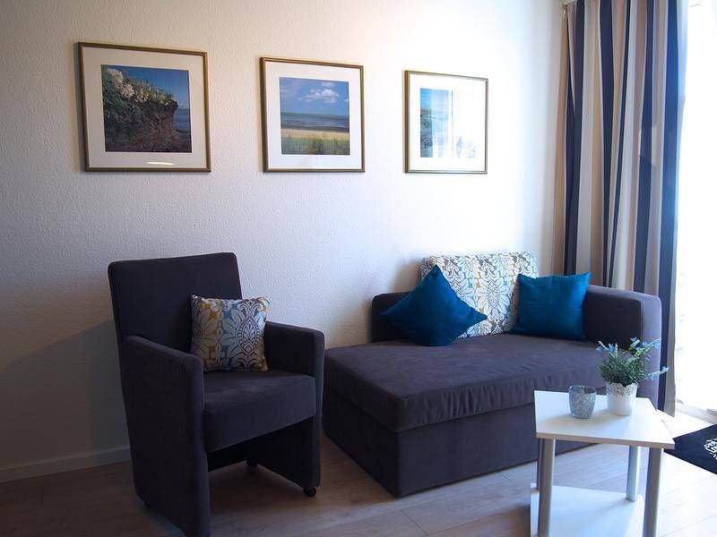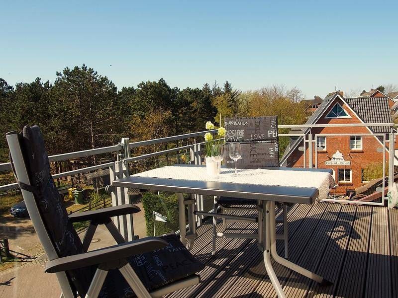 2-Raum-Ferienwohnung für 2-3 Personen im 2. Obergeschoß - 34 qm - Balkon mit Gartentisch und 3 Stühlen. Wohn-/Schlafraum mit Küchenzeile: eine Schlafcouch (80x200 mit zusätzlicher Auflagematratze), Beistelltisch, Sessel, TV, Radio/CD/MC und DVD- Player , Esstisch mit 4 Stühlen, TV-Schrank, Fußbodenbelag: Laminat. Einbau-Küchenzeile: 4 -Platten-Herd mit Ceranfeld, Spülmaschine, Einbau-Mikrowelle mit Heißluft und Grillfunktion, Dunstabzugshaube, Kühlschrank, Spüle, kompl. ausgestattet mit Geschirr und Hausrat, Regal, Kommode mit Schubladen, Fußbodenbelag: Laminat. Schlafzimmer: Ehebett (2x90x200) mit Lattenrost, 2 Nachttische, Kleiderschrank, Schuhregal, Fußbodenbelag: Laminat. Bad: Duschkabine, WC, Waschbecken, Ablage, Fliesenboden. WLAN wird als kostenloser Service angeboten - ein Garantie auf Verfügbarkeit kann nicht gewährt werden. App.-Haus in Wittdün, direkt hinter den Dünen zum Strand und doch nahe der Ortsmitte von Wittdün - in verkehrsberuhigter Zone, direkt neben dem Kurpark