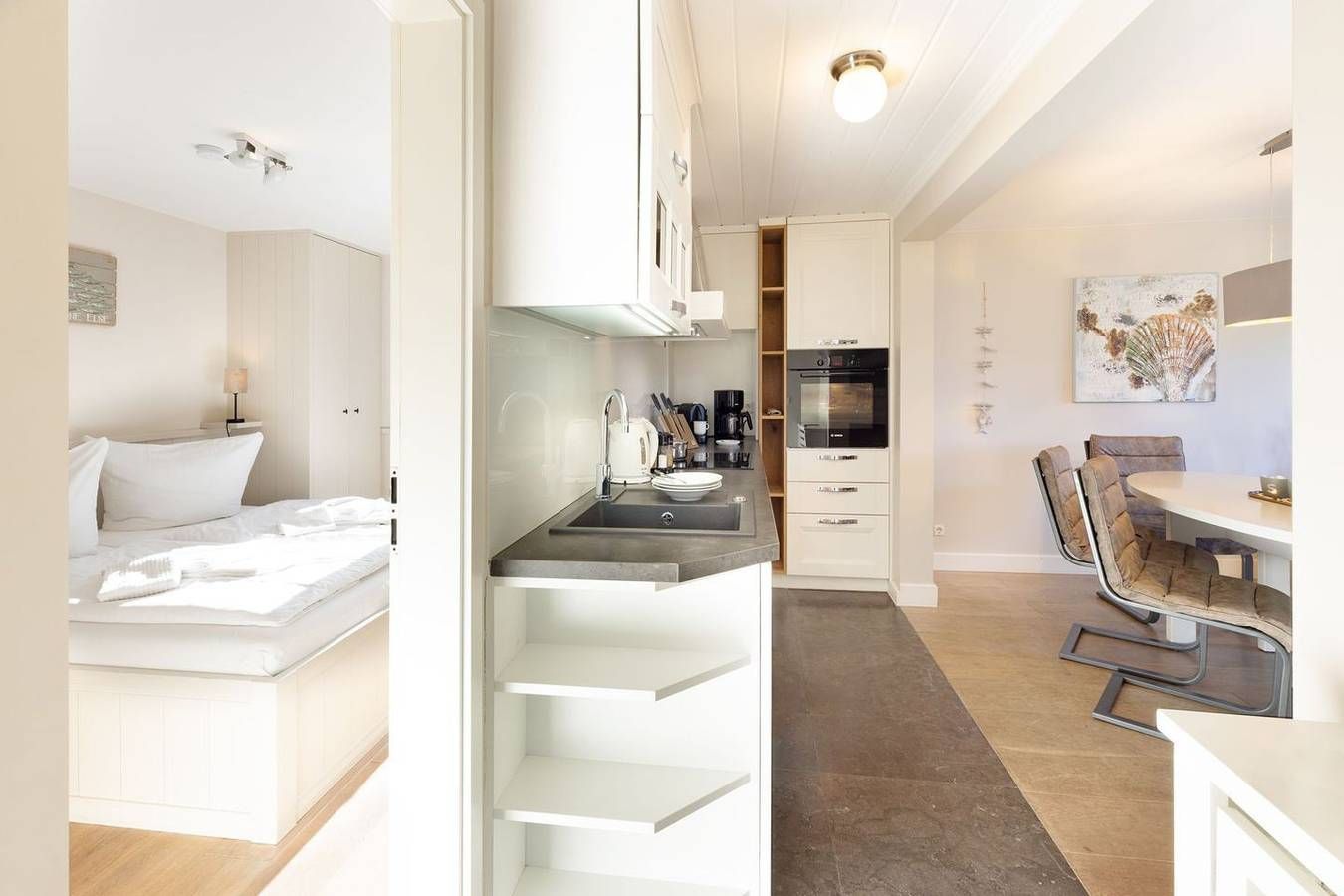 Das im Herzen von List gelegene Appartement "Lister Eck 1" erwartet Sie. Das helle und freundliche Domizil liegt im Erdgeschoss und bietet auf 55 m² alles, was Sie für einen erholsamen Urlaub mit bis zu vier Personen benötigen. Das großzügige Wohnzimmer mit offener Küche und großem Essplatz lädt zum gemütlichen Zusammensein ein. Es stehen Ihnen zwei Schlafzimmer – eines mit Doppelbett und eines mit zwei Einzelbetten - zur Verfügung. Vor der Wohnung befindet sich eine kleine Terrasse, die saisonal mit einem Strandkorb und Gartenmöbeln ausgestattet ist. Eine Waschmaschine ist vorhanden. Ein hauseigener Parkplatz steht Ihnen kostenlos zur Verfügung. Das Grillen mit einem Holzkohle- oder Gasgrill ist nicht gestattet. Sie können zusätzliche Serviceleistungen buchen. Weitere Informationen dazu erhalten Sie bei uns.
