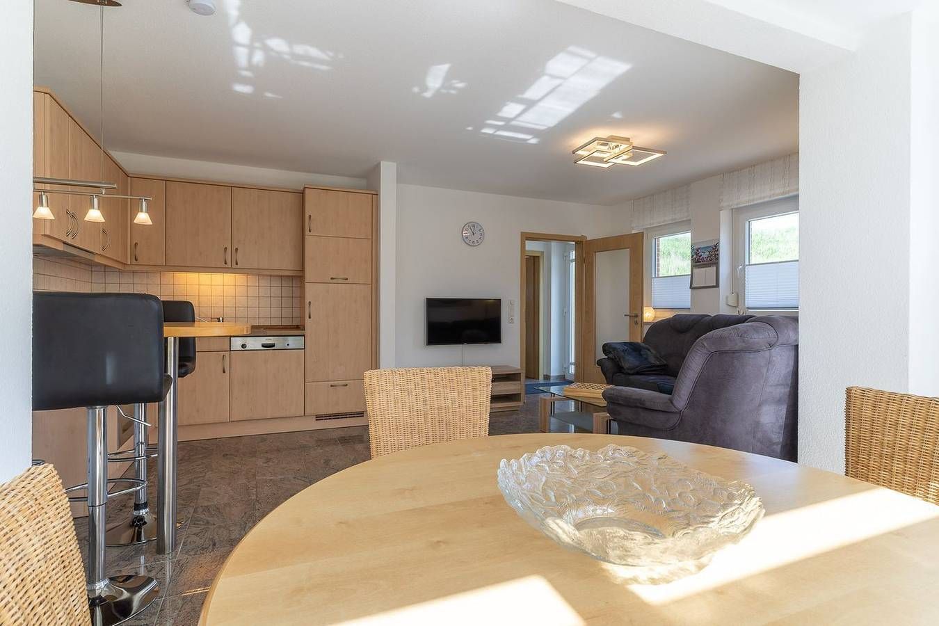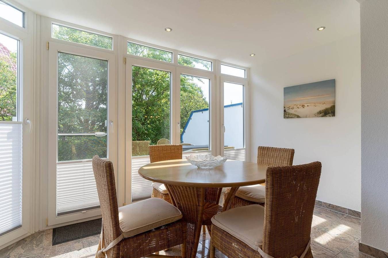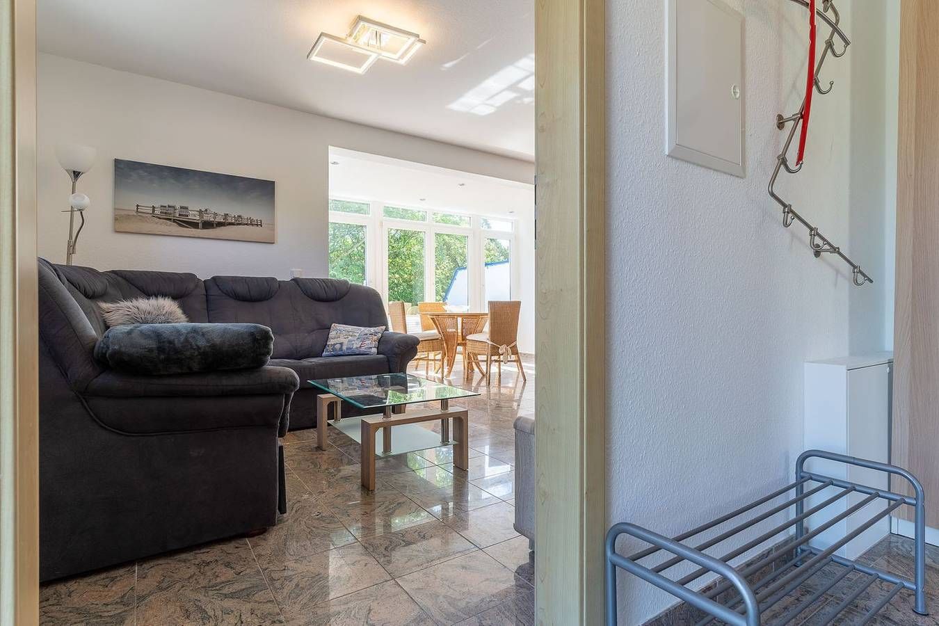 Herzlich willkommen in unserer komfortablen und traumhaft gelegenen 3-Zimmer Ferienwohnung "Eriel". Die Wohnung liegt im Erdgeschoss des Hauses und bietet Platz für bis zu 4 Personen. Die idyllische und ruhige Lage direkt am Deich im Ortsteil Ording ist ideal, um die Ruhe zu genießen und die unmittelbare Nähe zum Sandstrand von St. Peter-Ording zu erleben. Das zentrale Wohnzimmer ist gemütlich eingerichtet und verfügt über zwei Sofas, eines für 4 Personen und ein weiteres Sofa für 2-3 Personen, sowie einen bequemen Sessel. Ein großer Fernseher mit Satellitenempfang und ein geräumiger Esstisch machen den Wohnbereich perfekt. Vom Wohnzimmer mit den Panoramafenstern aus haben Sie direkten Zugang zur möblierten Terrasse mit Tisch, Stühle sowie zwei Liegen, die nach Südosten ausgerichtet ist und einen Blick in die Wiesen ermöglicht. Die offene Wohnküche ist mit einem Backofen, Cerankochfeld, einer Mikrowelle, einem Geschirrspüler, einem Kühlschrank mit Gefrierfach und einem Hochtisch mit 4 Barstühlen ausgestattet. In den beiden Schlafzimmern finden Sie ein großes Doppelbett (2x 90x200cm), einen Kleiderschrank sowie einen Fernseher. Hier ist auch der Zugang zur zweiten Terrasse, die nach Nordwesten ausgerichtet ist. Im zweiten Schlafzimmer steht ein Etagenbett (je 80x200cm) sowie ein Einbaukleiderschrank. Das Duschbad verfügt über eine bodengleiche Dusche, ein WC und einen Föhn. Der möblierte Flur mit Spiegel und Haushaltsschrank im Eingangsbereich bietet zusätzlichen Stauraum. Zum Haus gehört ein Pkw-Stellplatz sowie ein abschließbarer Fahrradschuppen. Eine Waschmaschine und ein Trockner stehen gegen Gebühr zur Verfügung. Die Nutzung der Infrarotkabine ist kostenfrei. Die Wohnung verfügt über eine Fußbodenheizung, Fliegengitter und elektrische Rollläden an den Fenstern sowie kostenloses WLAN. Erleben Sie die perfekte Mischung aus Entspannung und Komfort in unserer Ferienwohnung "Eriel". Wir freuen uns auf Ihren Besuch!